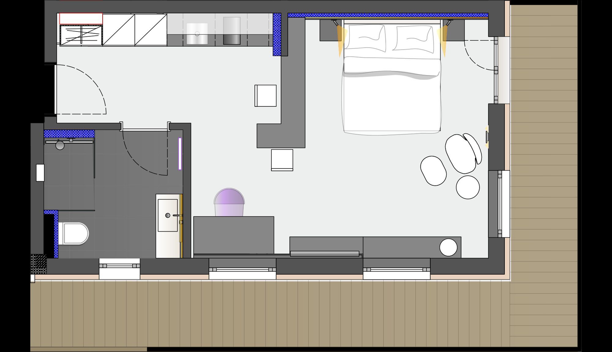 1. Obergeschoss, 1 Wohn-Schlafraum mit Küche, Schreibtisch, Duschbad, Süd- und Ostbalkon,