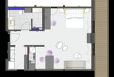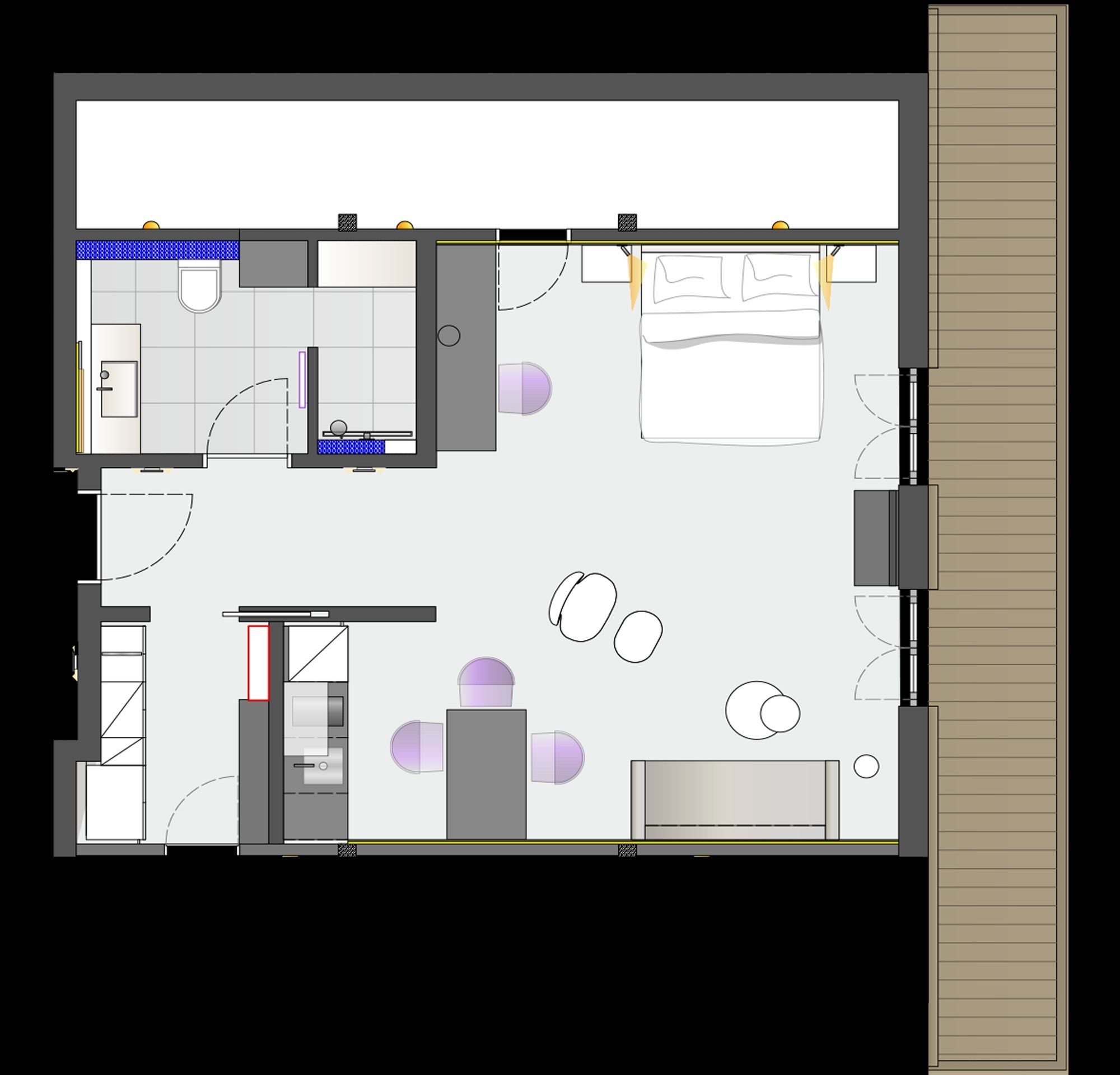 Dachgeschoss, 1 Wohn-Schlafraum mit Küche, zusätzl. Schlafcouch, Schreibtisch, Duschbad, begehbarer Kleiderschrank, Ostbalkon