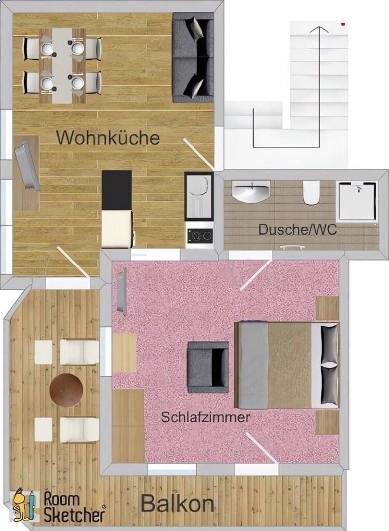Genießen sie die Abendsonne auf dem großen Balkon mit bequemen Terrassenmöbeln. Balkon nach Süden und Westen.