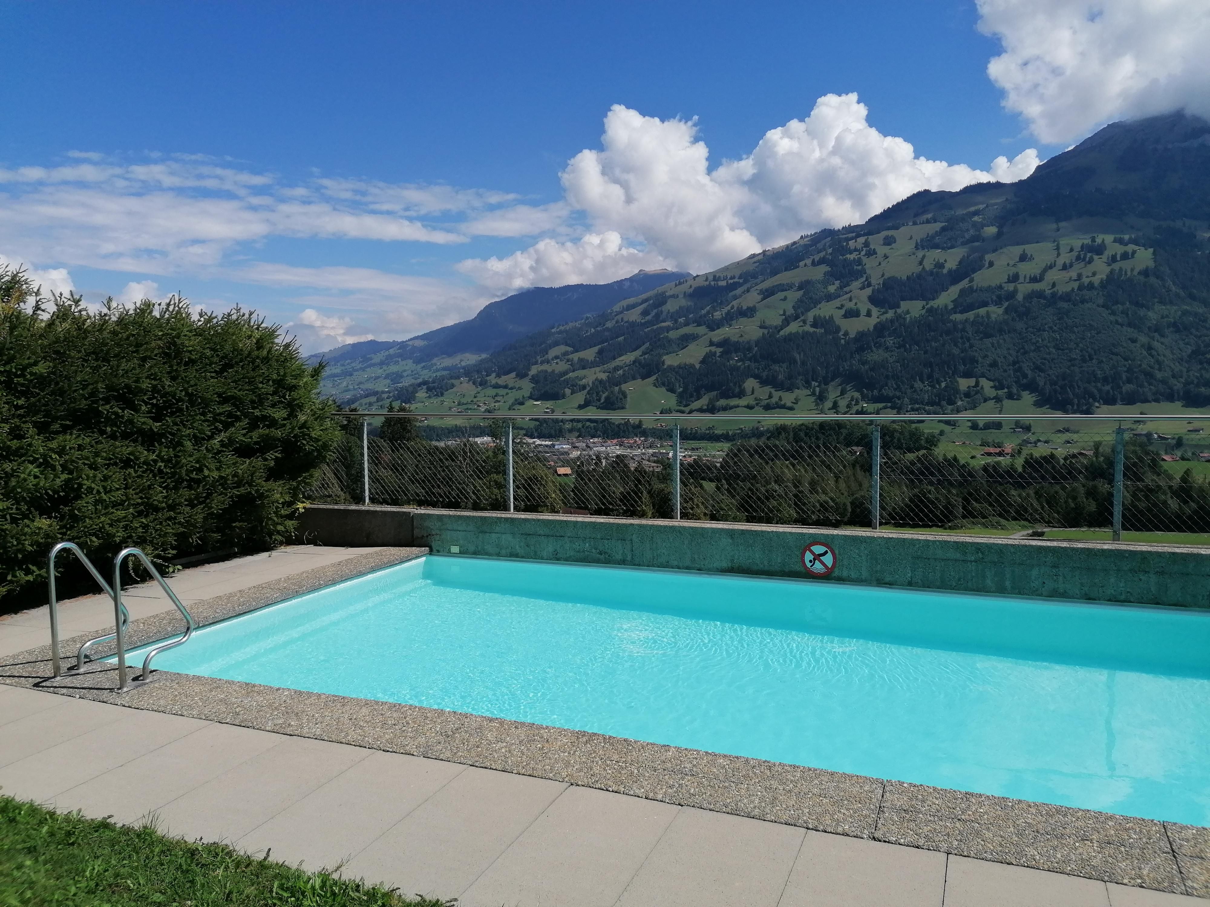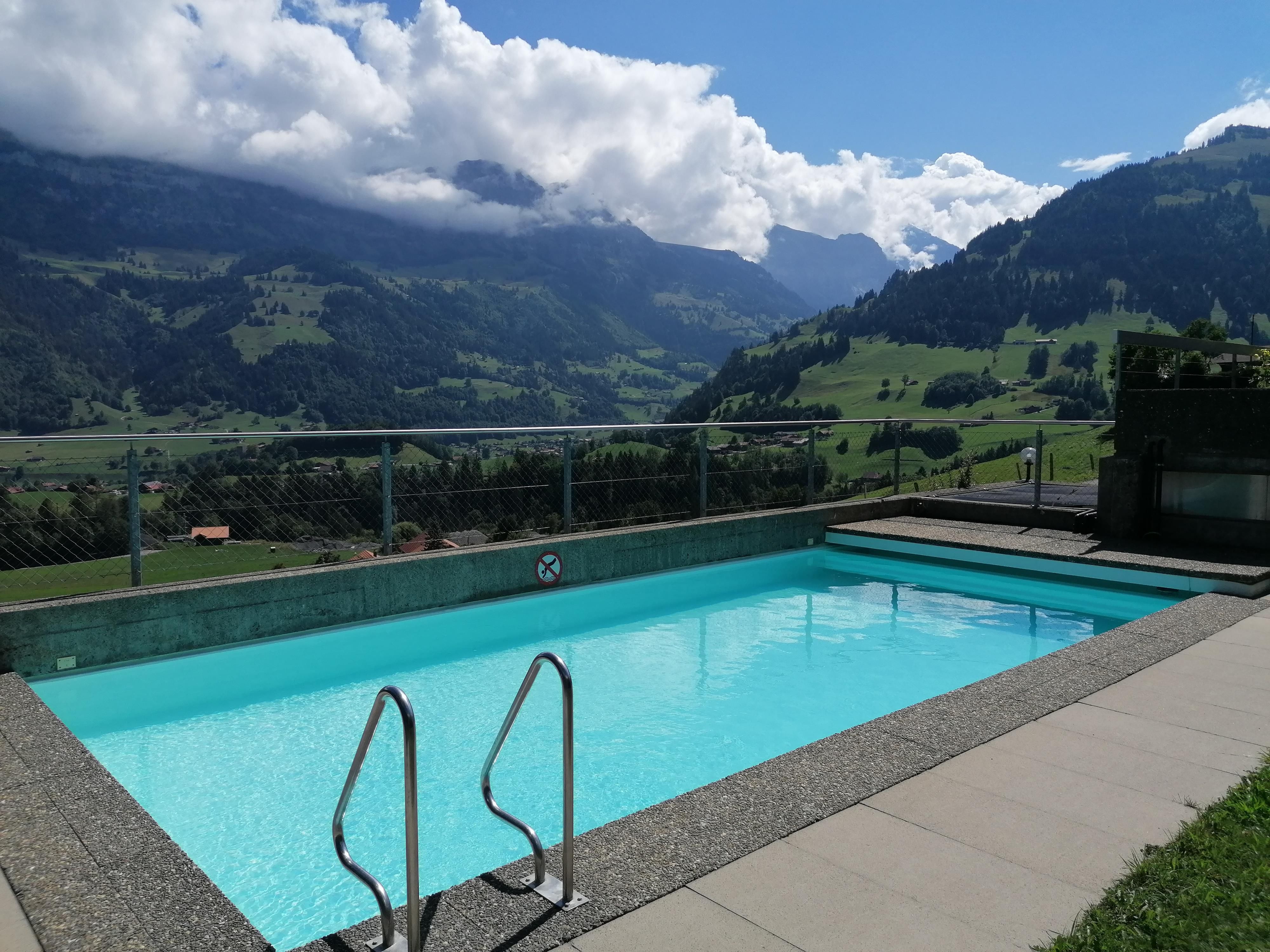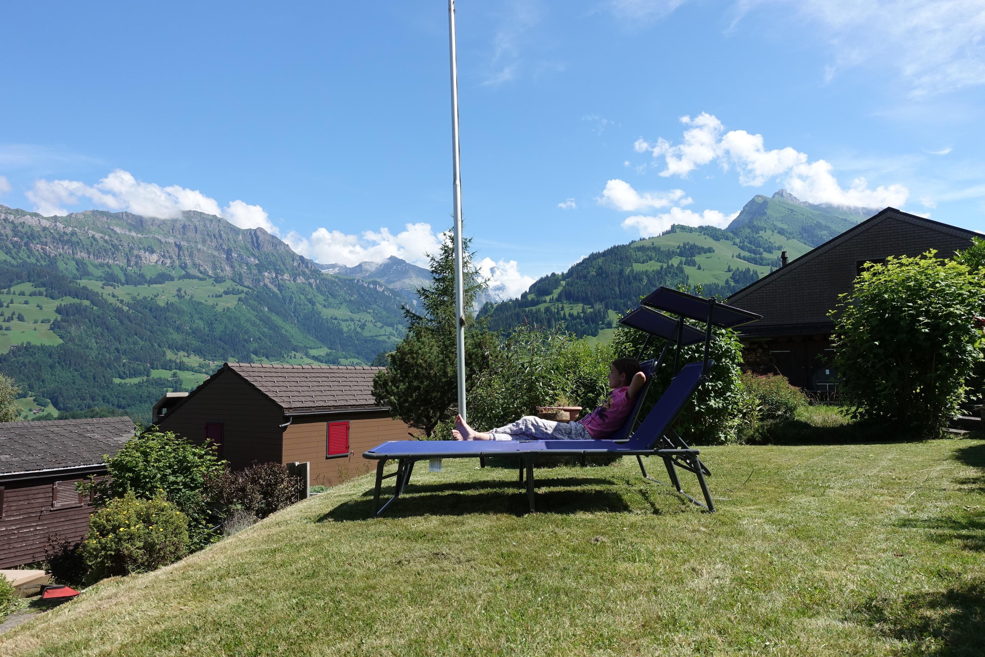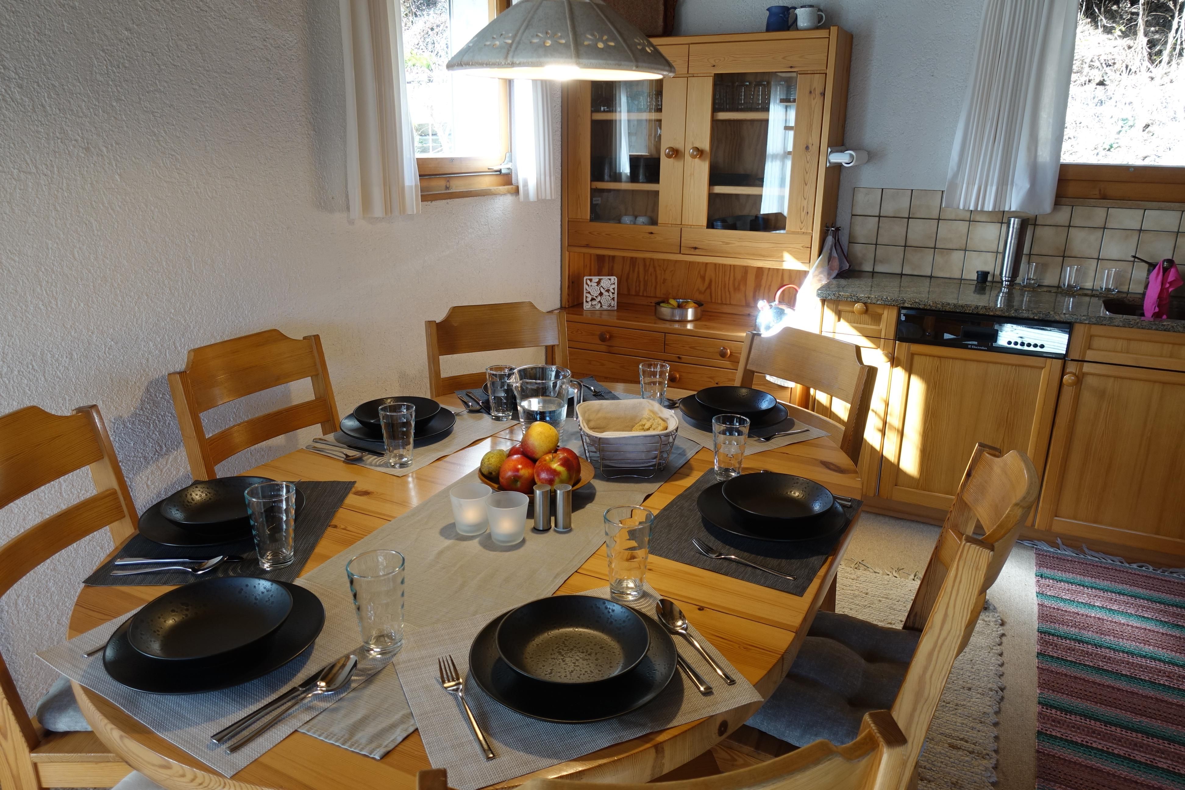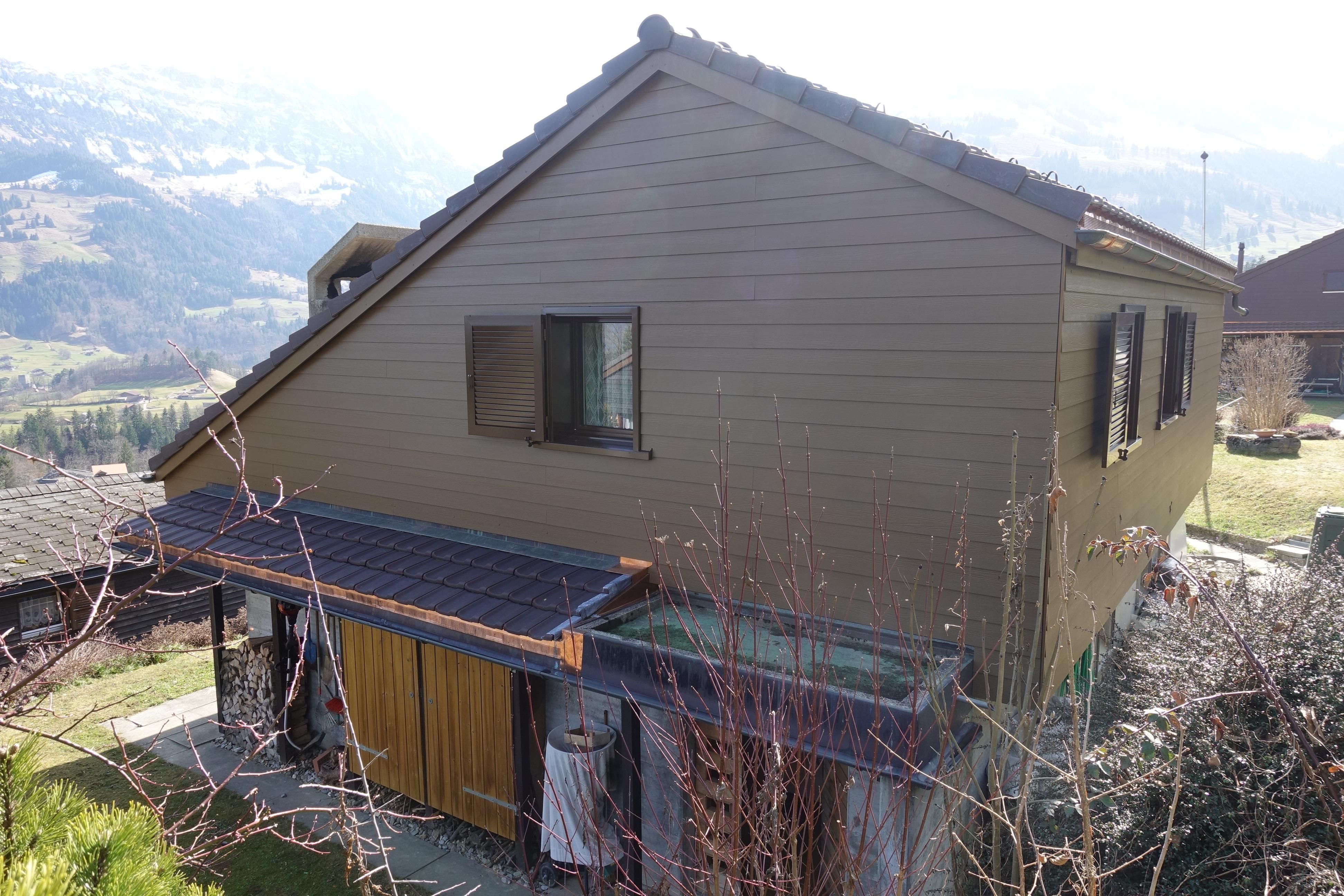 Das Haus, zu dem auch ein gemeinschaftlicher Pool gehört, hat durch die große Glasfensterfront im Wohnzimmer einen fantastischen Blick auf die Bergwelt und besteht aus einem großzügigen Wohn- und Essraum mit Küchenzeile, aus drei Schlafzimmern, davon das erste mit einem Doppelbett mit Blick auf die Berge, eines mit einem Stockbett und das dritte besteht aus einem Französischen Bett und einem Einzelbett (ein Zustellbett ist möglich). Außerdem verfügt das Haus über einen Wasch- und Abstellraum und einem Bad (Dusche, Toilette, Waschbecken). Zum Haus gehört, in Richtung Südost, eine großzügige Terrasse und eine schöne Liegewiese. Nicht nur vom Wohnraum aus, sondern auch von der Terrasse/Liegewiese, haben Sie einen fantastischen Ausblick auf die Berner Bergwelt. Unser Haus ist ein Nichtraucherhaus und auch auf dem gesamten Grundstück darf nicht geraucht werden. Zum Haus selber kommen sie über 100 Treppenstufen, da es ganz oben auf Lohmatte liegt. Sie werden mit traumhaftem Blick und Ruhe belohnt.