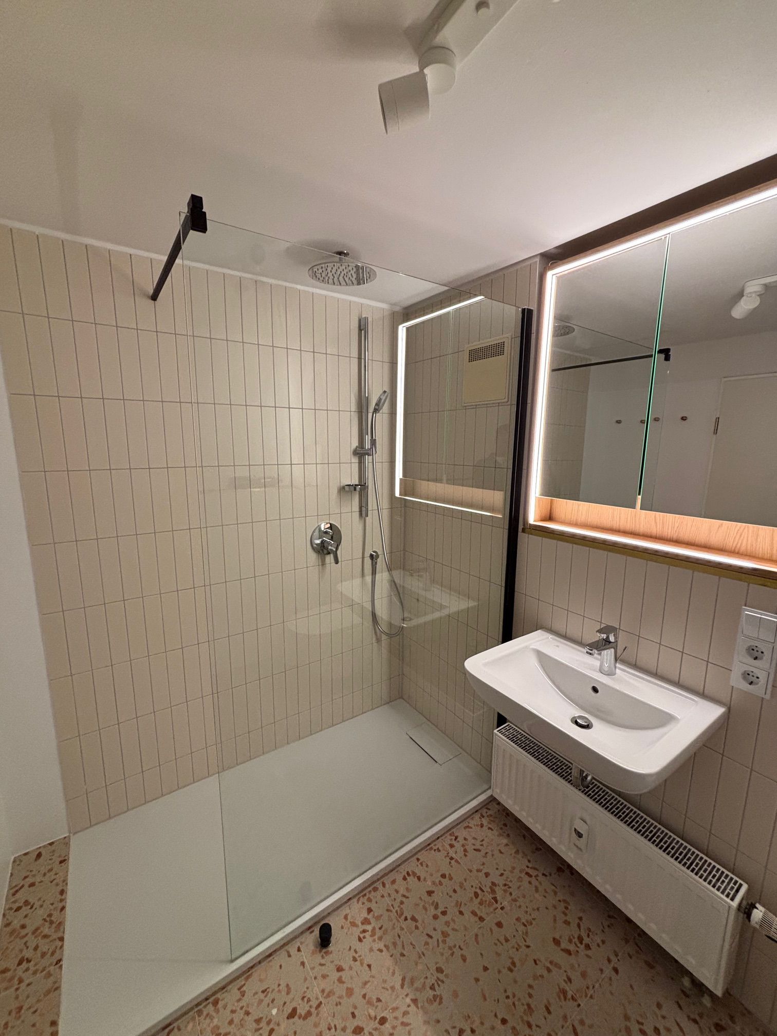 Das Badezimmer verfügt über eine ebenerdige Dusche, WC und Föhn. Eine kostenfreie Waschmaschine in der Wohnung sorgt für zusätzlichen Komfort, besonders bei längeren Aufenthalten. Die große Balkon-Terrasse ist ein echtes Highlight und lädt mit seinem freien Blick auf die Berge zum Verweilen ein, während die ruhige Lage ohne Durchgangsverkehr für ungestörte Erholung sorgt.
