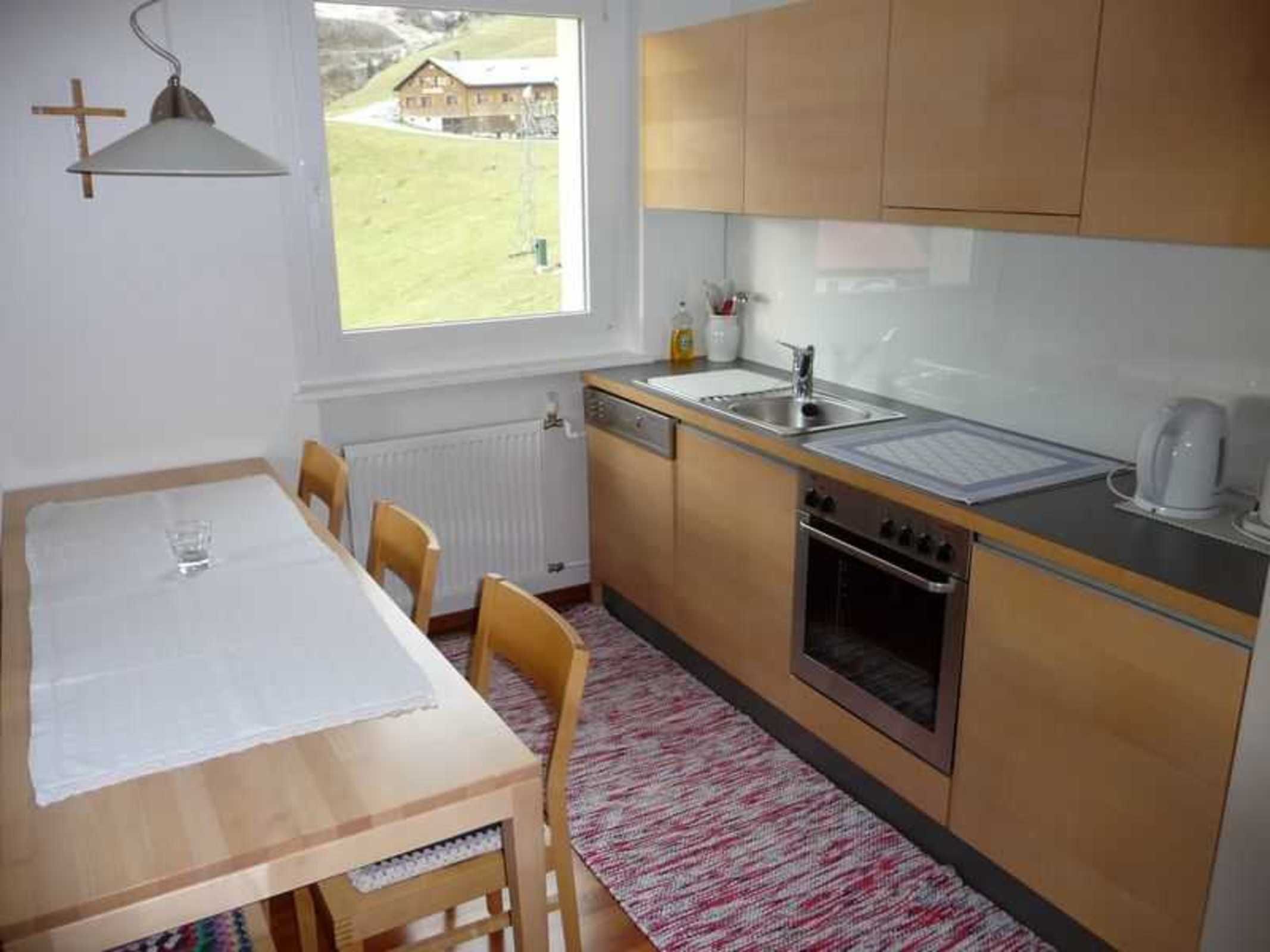 Komfortable Wohnung mit geräumiger Wohnküche, einem Doppelzimmer und 2 Einzelzimmer geeignet für Familien mit Kindern. Südseitig mit Balkon mit Blick auf die umliegenden Berge.