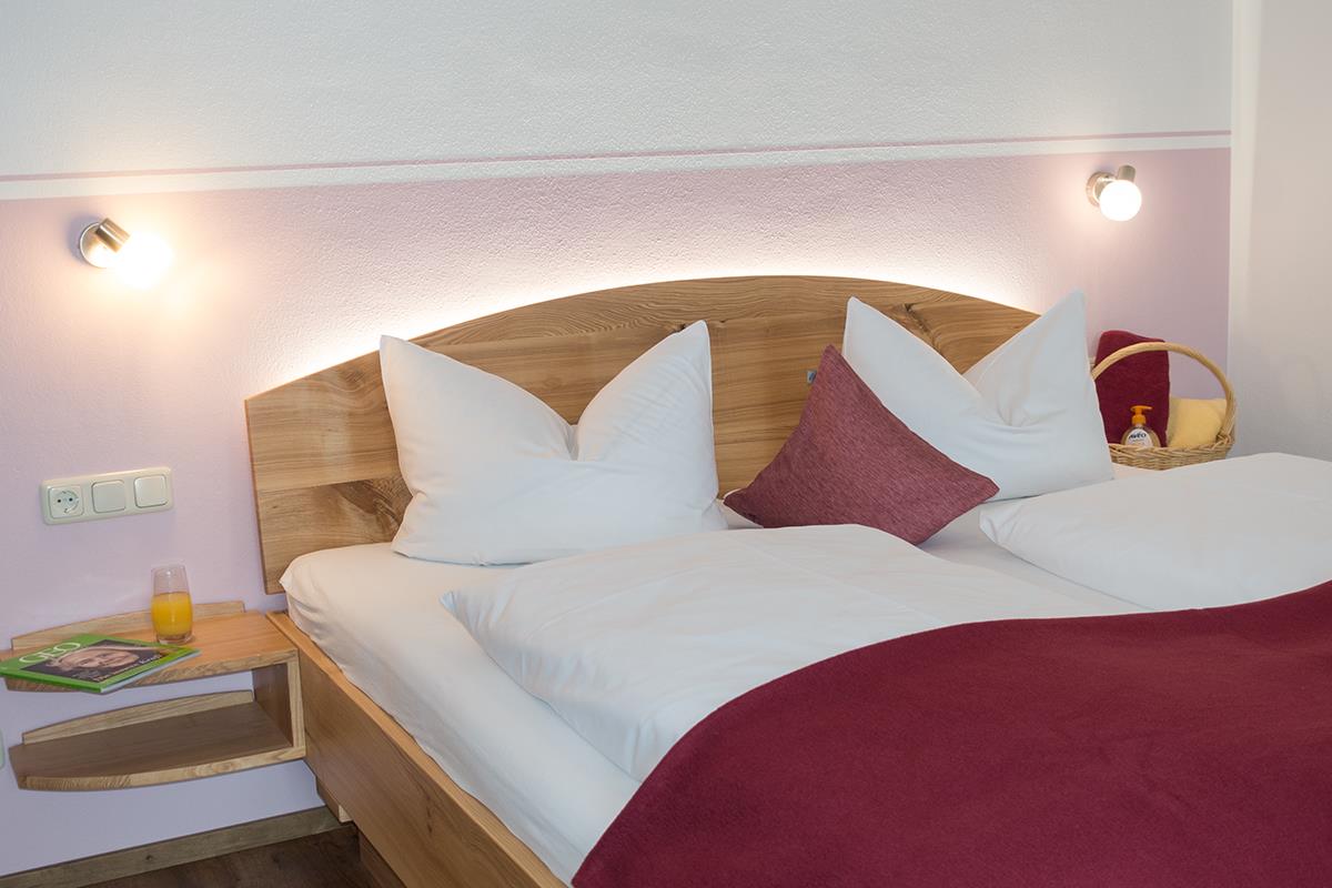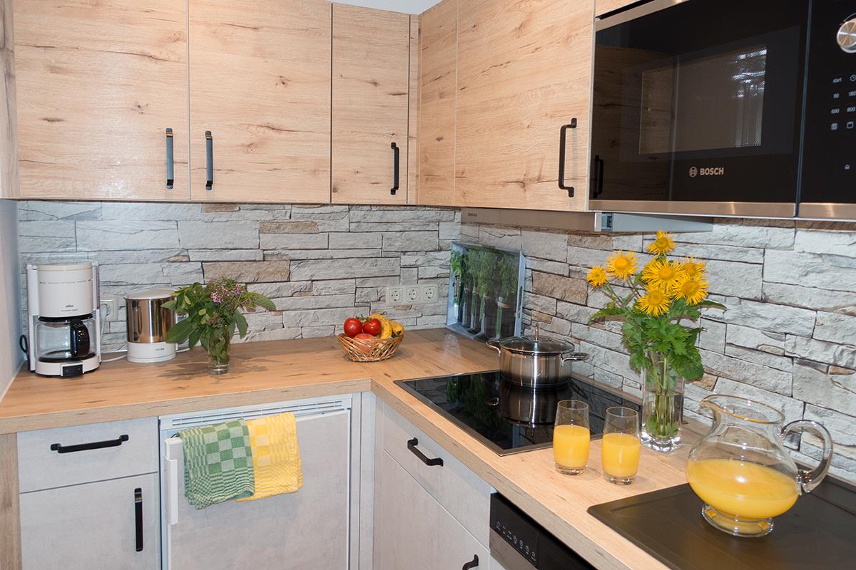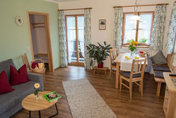 neue Ferienwohnung mit extra Küche. Wohn-Esszimmer mit vom heimischemSchreiner gefertigten Möbeln. Schlafzimmer mit Doppelbett und Sofa,