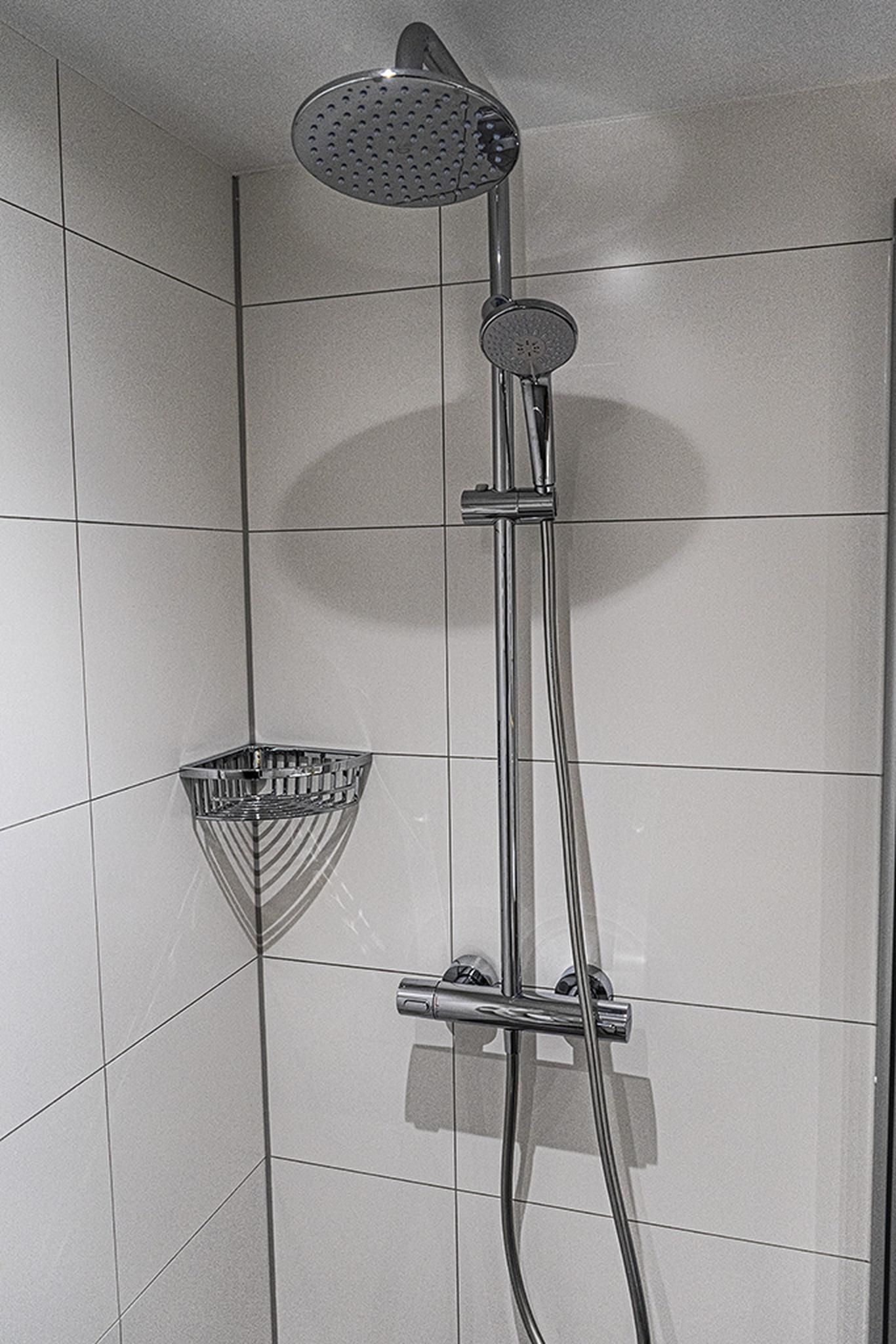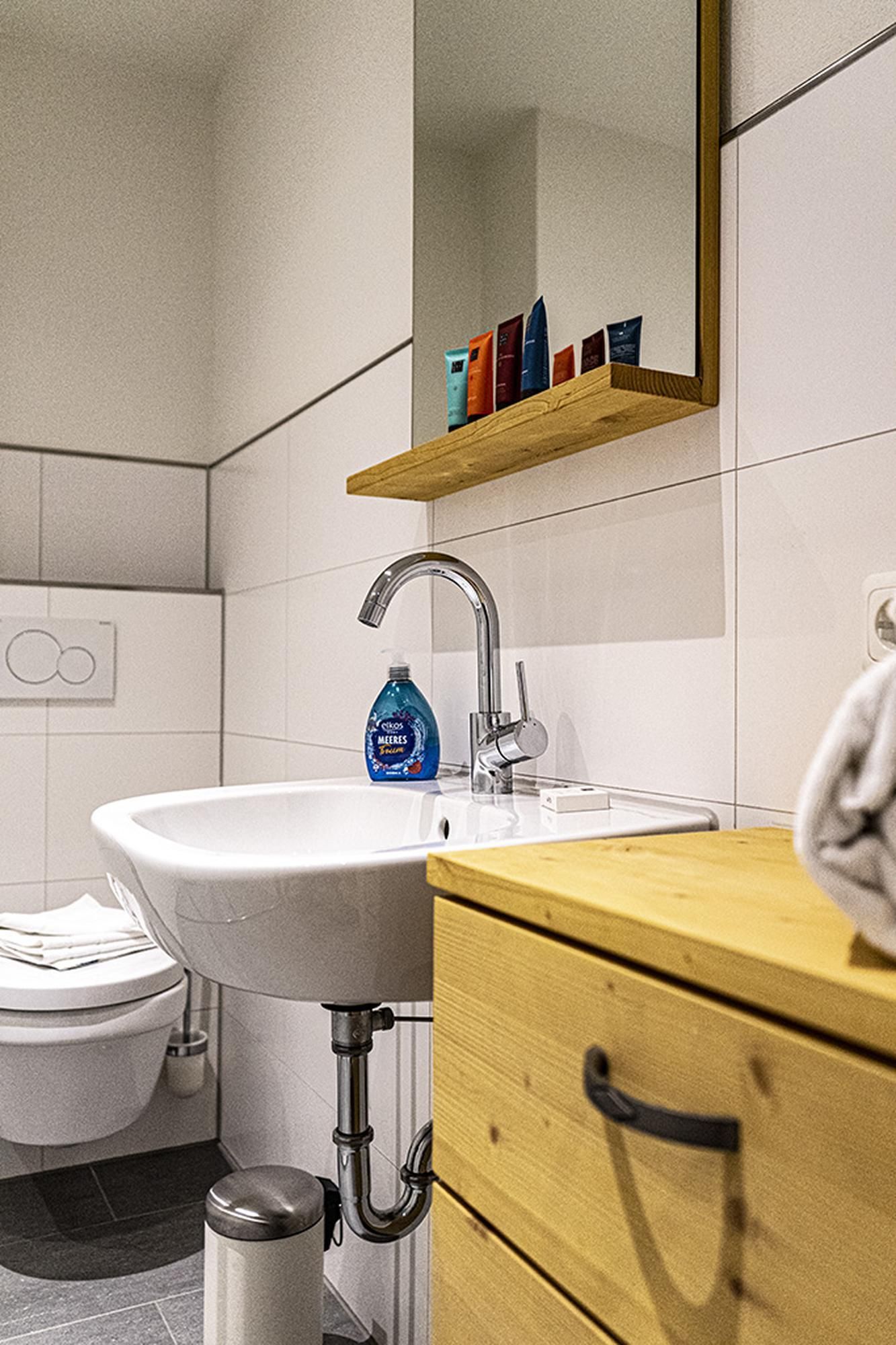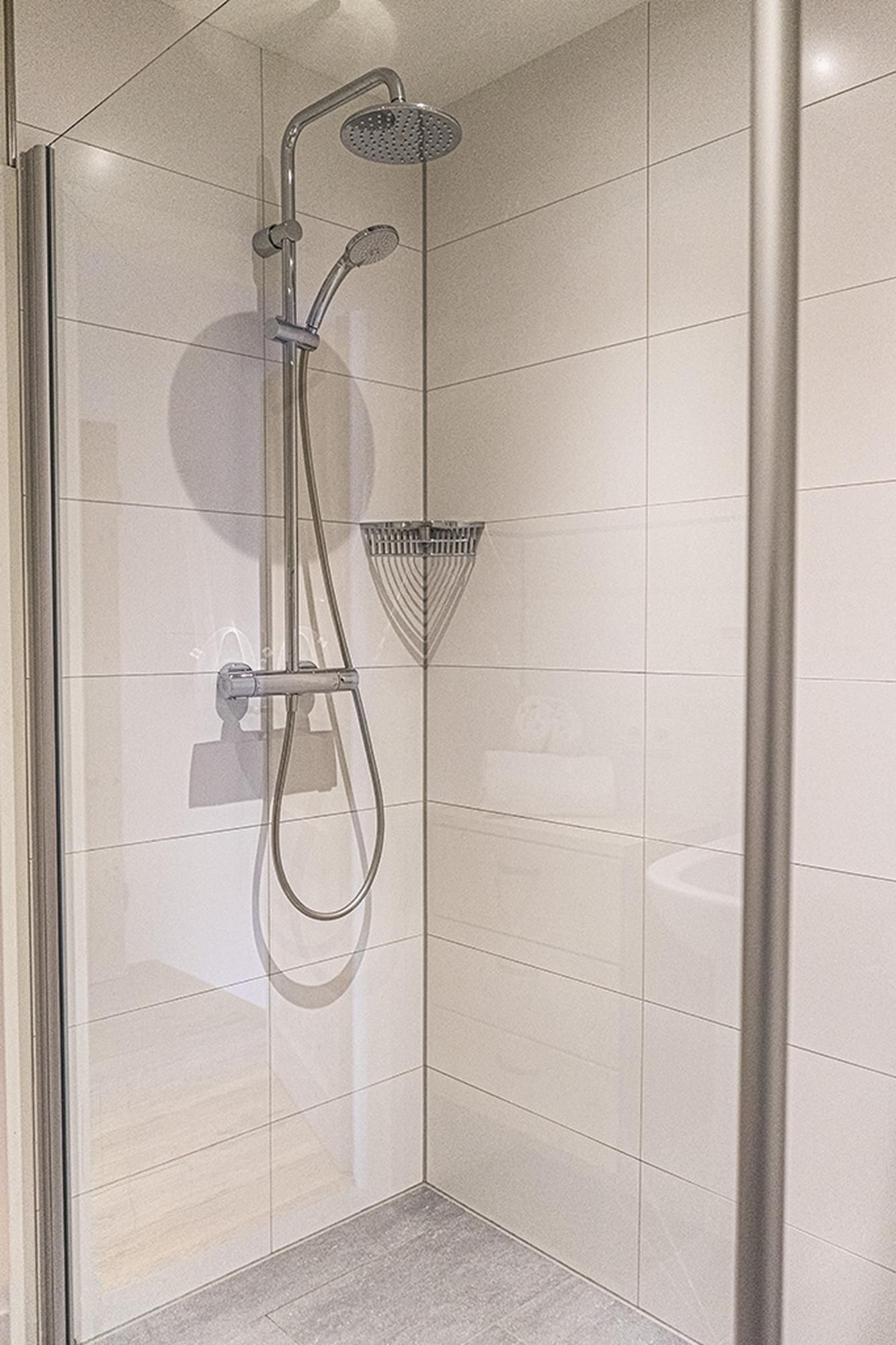 Das moderne Badezimmer bietet eine großzügige Dusche, WC, Waschbecken und Spiegel.