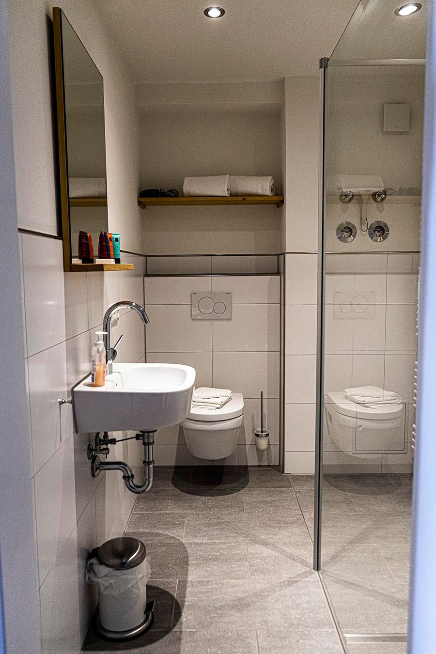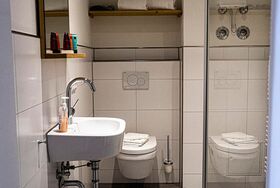 Ein modernes Badezimmer mit Dusche und WC sowie frischen Handtüchern sorgt für zusätzlichen Komfort. Garderobe, Heizung, kostenloses WLAN und ein Esstisch im Innenbereich runden das Wohlfühlangebot ab.
