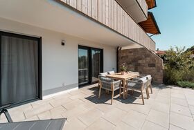 Die private Sonnenterrasse ist der perfekte Ort für Frühstück in der Morgensonne oder einen entspannten Abend mit Grill und Wein. Ob als Paar, mit Freunden oder Familie – im BAY47° fühlt sich jeder sofort zuhause.
