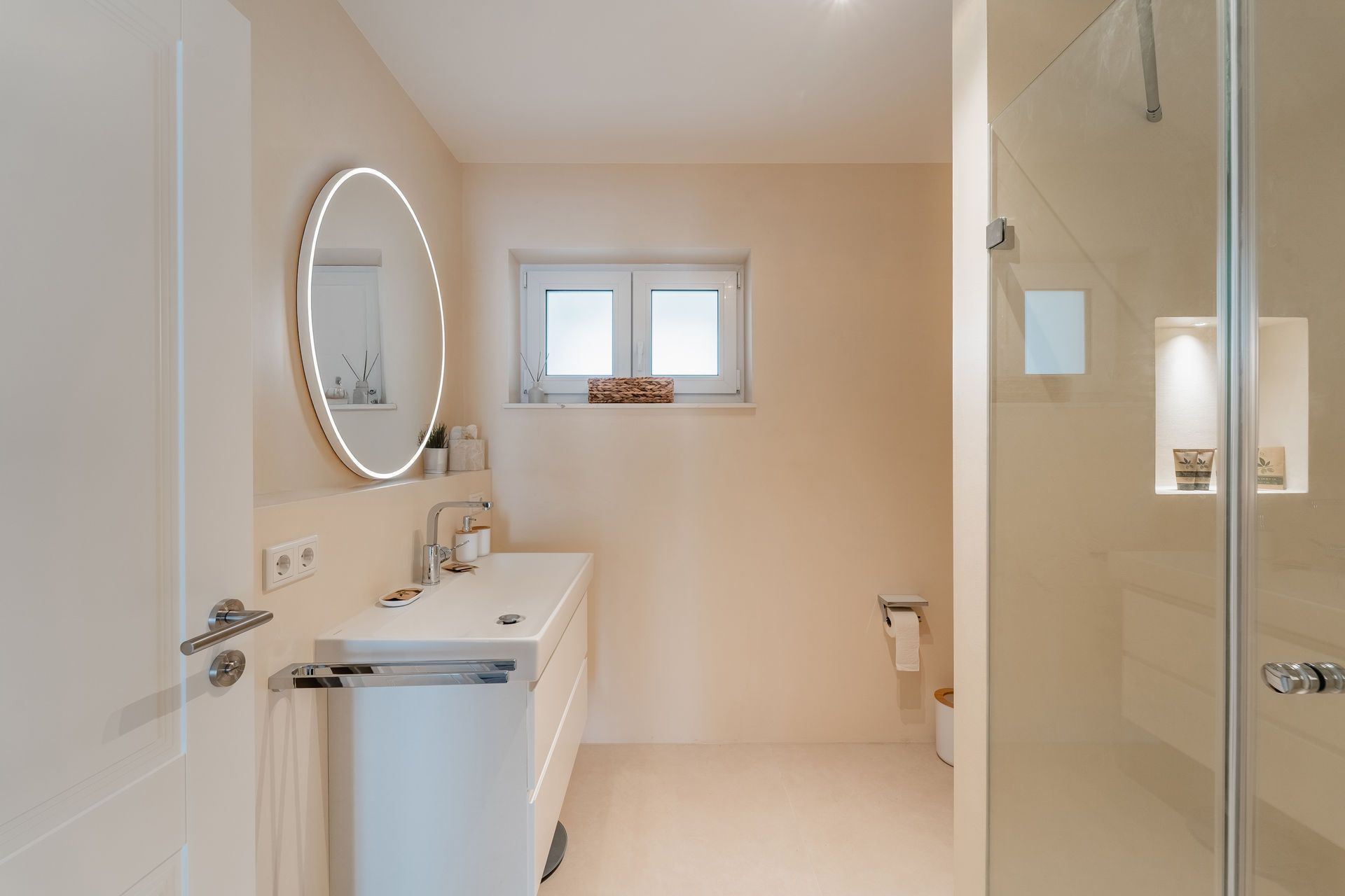 • Modernes Bad mit großzügiger Regendusche, Handtuchwärmer und Föhn