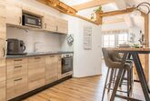 Ebenfalls im 2. Stock liegt unsere liebevoll eingerichtete Wohnung Zimnitz. Die helle Wohnküche ist mit Bartisch und Hockern ausgestattet – perfekt für ein Frühstück zu zweit. Der Schlafbereich verfügt über TV, Relaxsessel und französischen Balkon. Das moderne Bad bietet eine große Dusche, WC, Föhn und Handtücher. Diese Wohnung eignet sich besonders für Paare oder kleine Familien, die es gerne gemütlich haben.