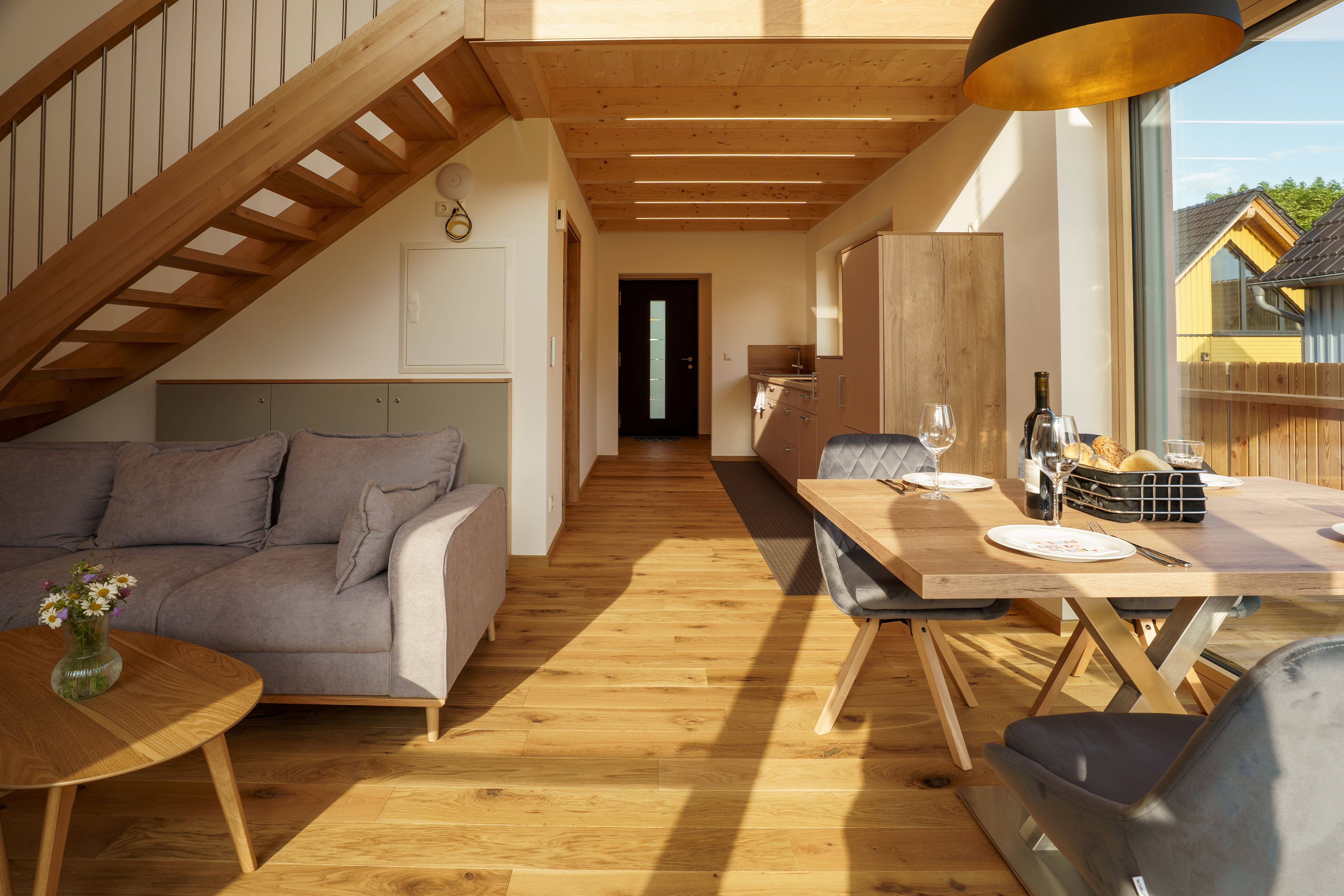 Tauchen Sie ein in pure Gemütlichkeit und höchsten Komfort: Unsere exklusiven Chalets vereinen nachhaltige Bauweise mit modernem Design – gefertigt aus Holz aus den Wäldern der Region, sorgfältig verarbeitet von einem lokalen Schreiner. Das Interieur, liebevoll gestaltet und ausgestattet mit Möbeln aus dem eigenen Holz, schafft eine warme Atmosphäre mit persönlichem Charakter. Jedes Chalet erstreckt sich über zwei Etagen und bietet ausreichend Raum für Ihre ganz persönliche Auszeit.