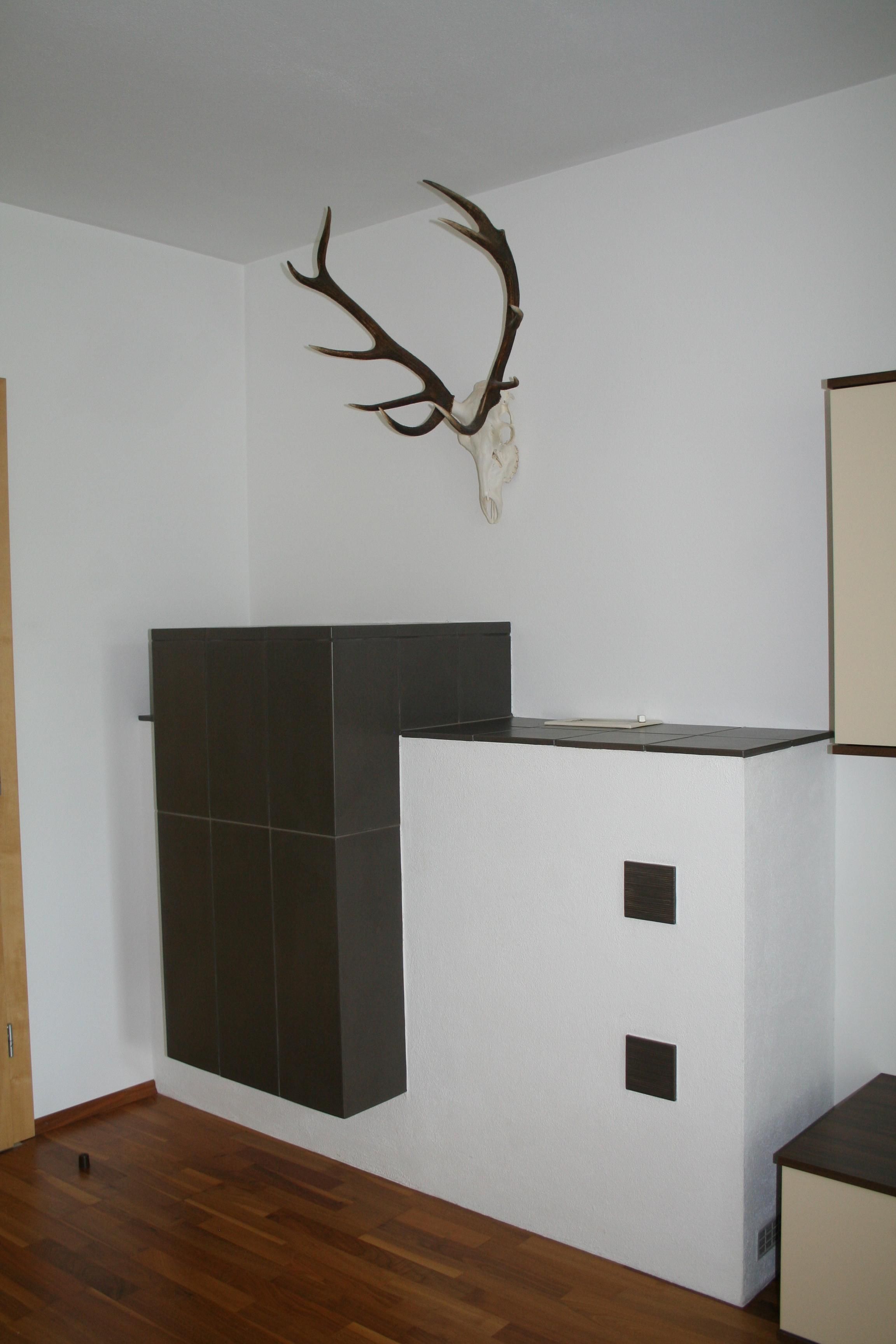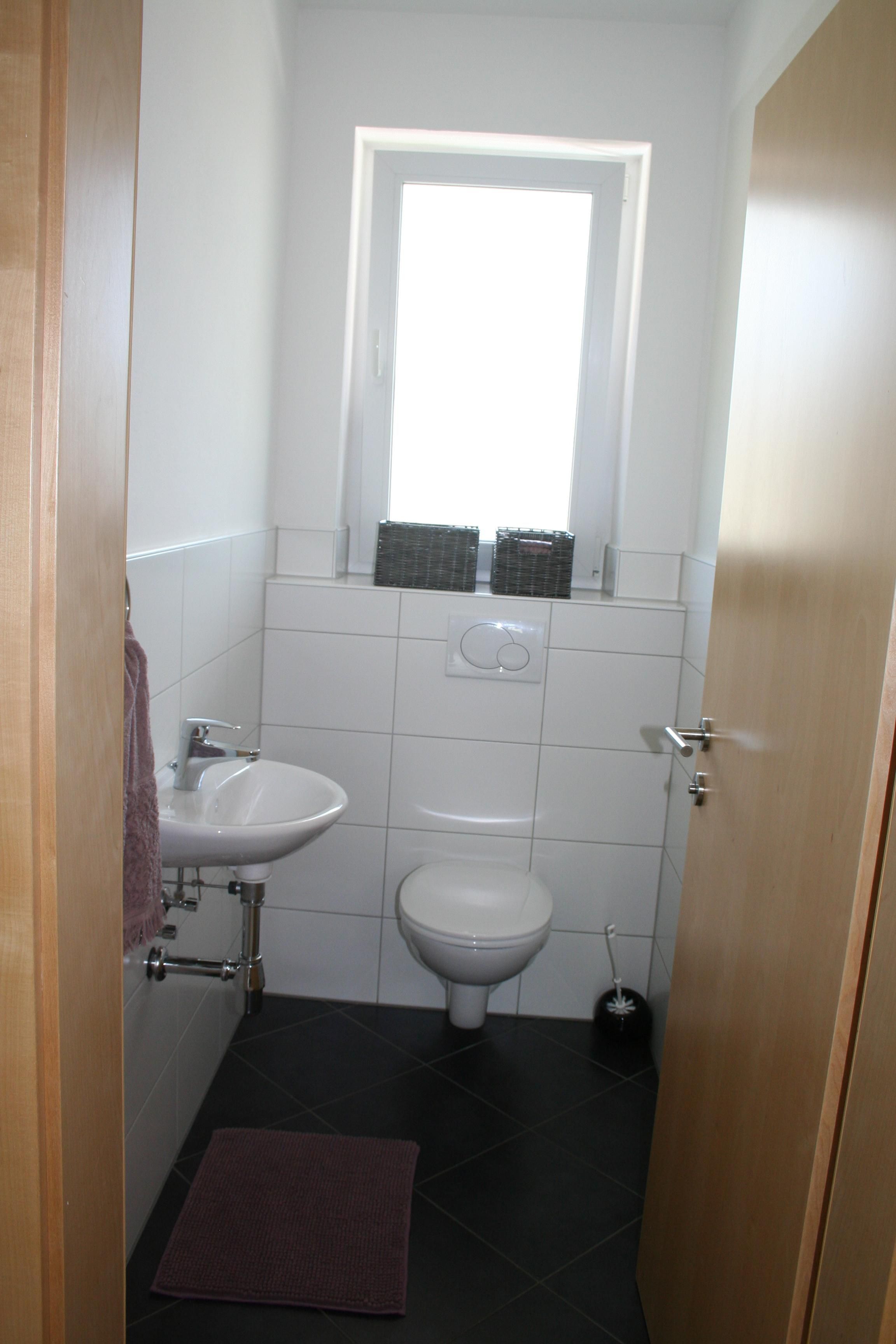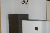 Wohnzimmer mit Kachelofen, Badezimmer, WC, Küche mit Esstisch.