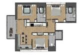 Das großzügige Apartment Jungfrau im zweiten Stock bietet auf 78 m² Platz für bis zu 6 Personen. Es verfügt über drei Schlafzimmer mit Doppelbett, jeweils mit eigenem Badezimmer mit Dusche und WC – ideal für Privatsphäre und Komfort. Die Wohnküche ist mit einem gemütlichen Esstisch ausgestattet und verfügt über eine moderne Küche mit E-Herd, Geschirrspüler, Espressomaschine und Mikrowelle. Ein Balkon lädt zum Entspannen an der frischen Luft ein.
