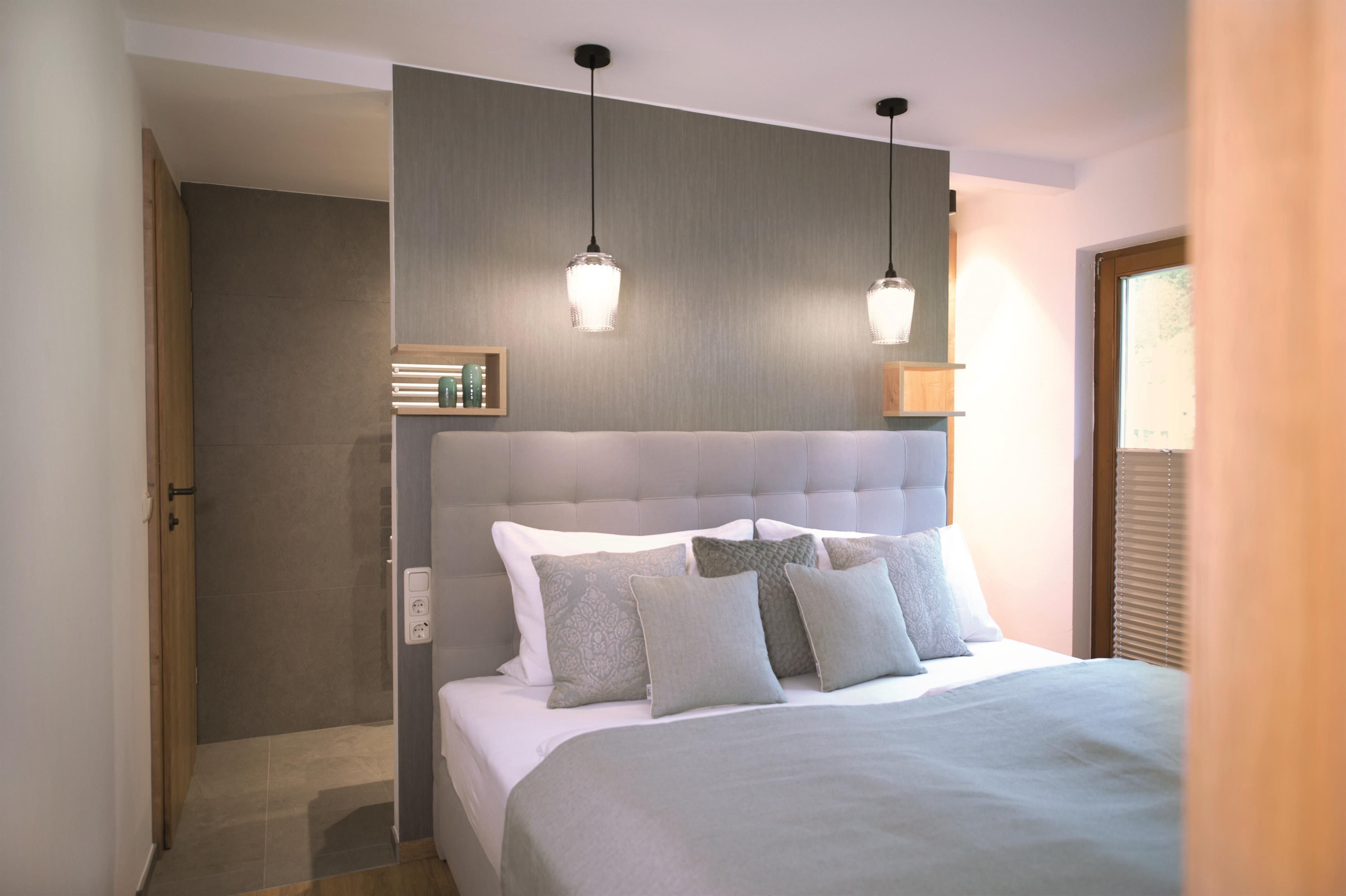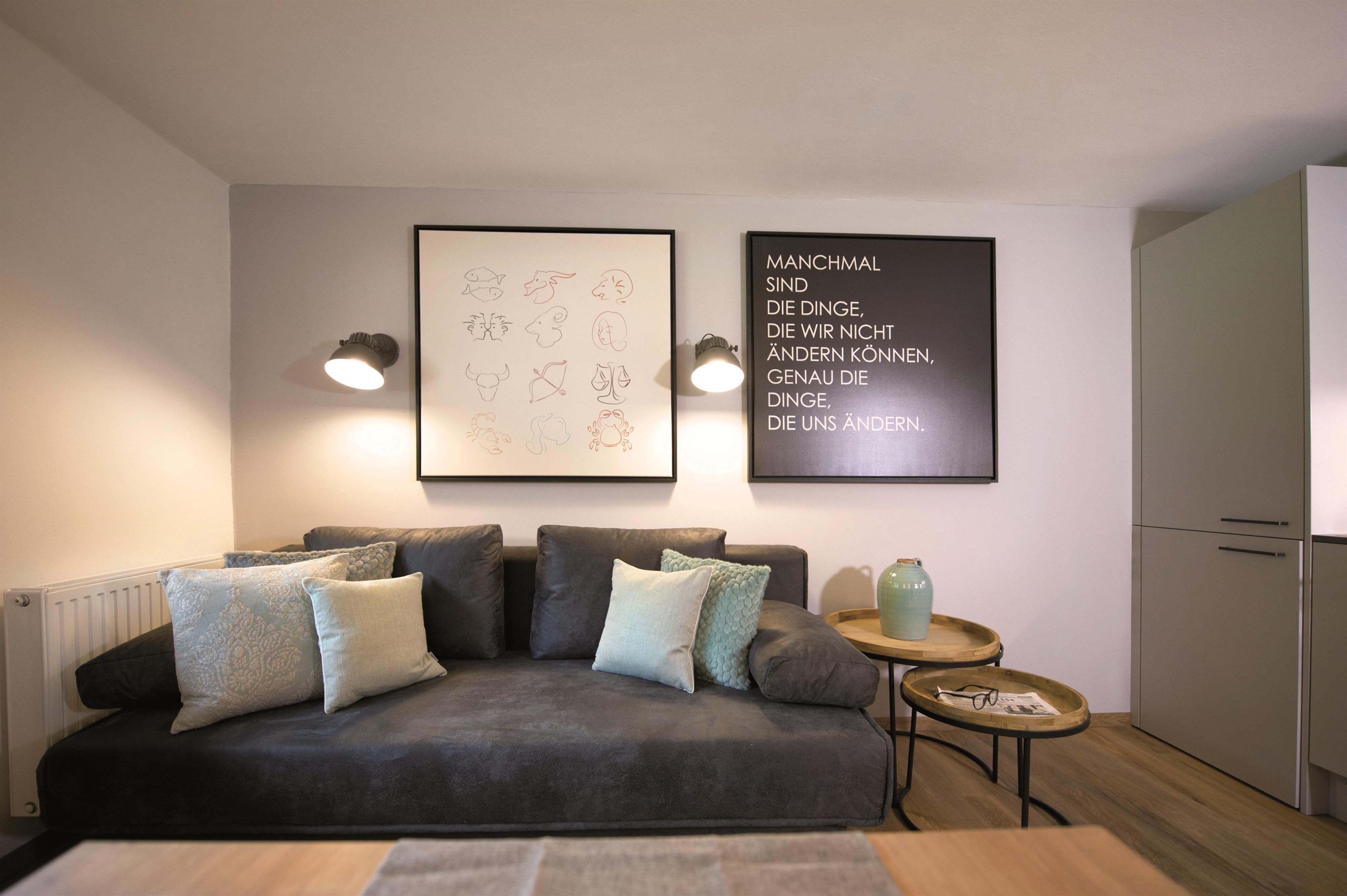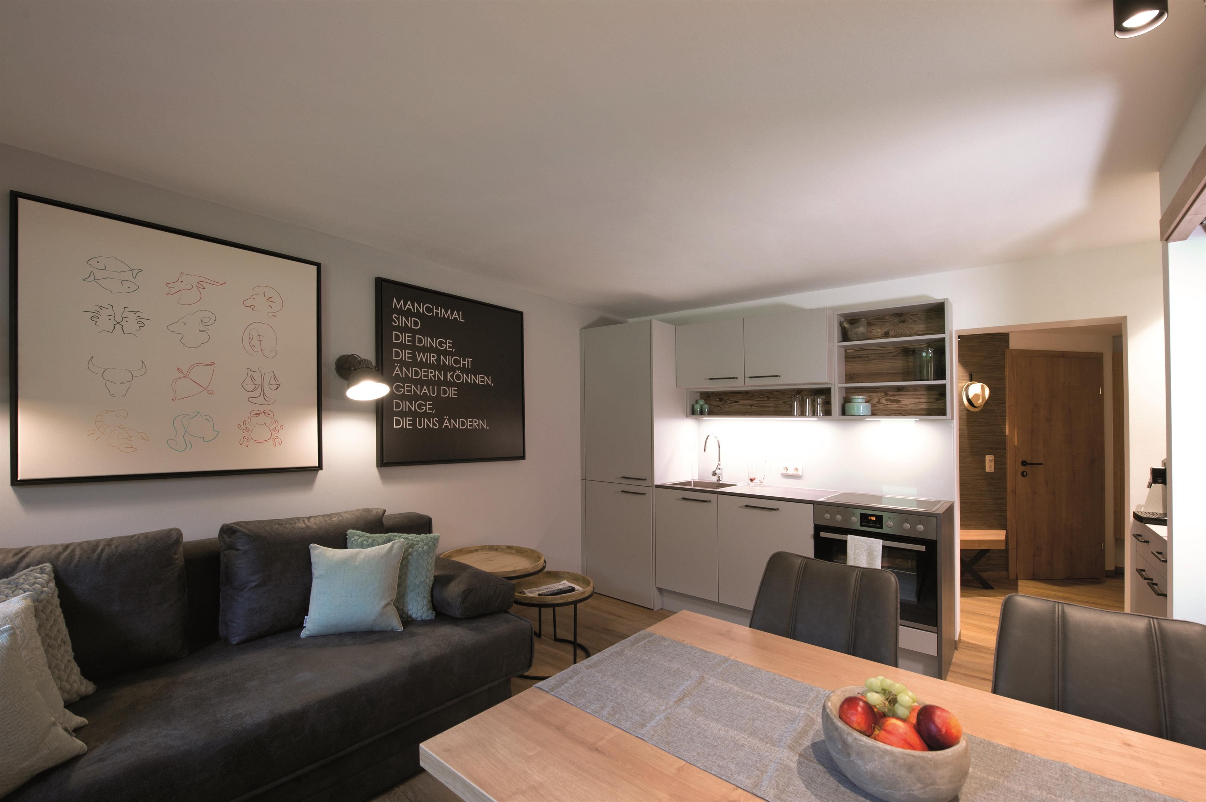 Das großzügige Apartment Wassermann im ersten Stock bietet auf 48 m² Platz für bis zu 5 Personen. Es verfügt über zwei Schlafzimmer mit Doppelbett sowie einer ausziehbaren Couch für eine weitere Person. Jedes Schlafzimmer hat ein eigenes Badezimmer mit Dusche und WC – perfekt für Komfort und Privatsphäre. Die helle Wohnküche ist mit einem gemütlichen Esstisch sowie einem Balkon ausgestattet und verfügt über eine moderne Küche mit E-Herd, Geschirrspüler, Espressomaschine und Mikrowelle.