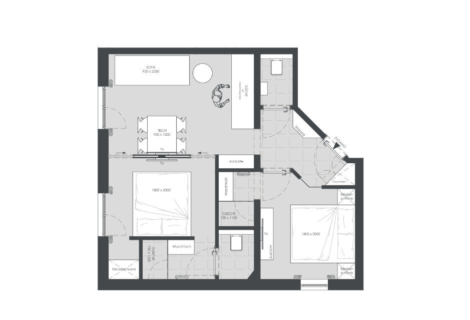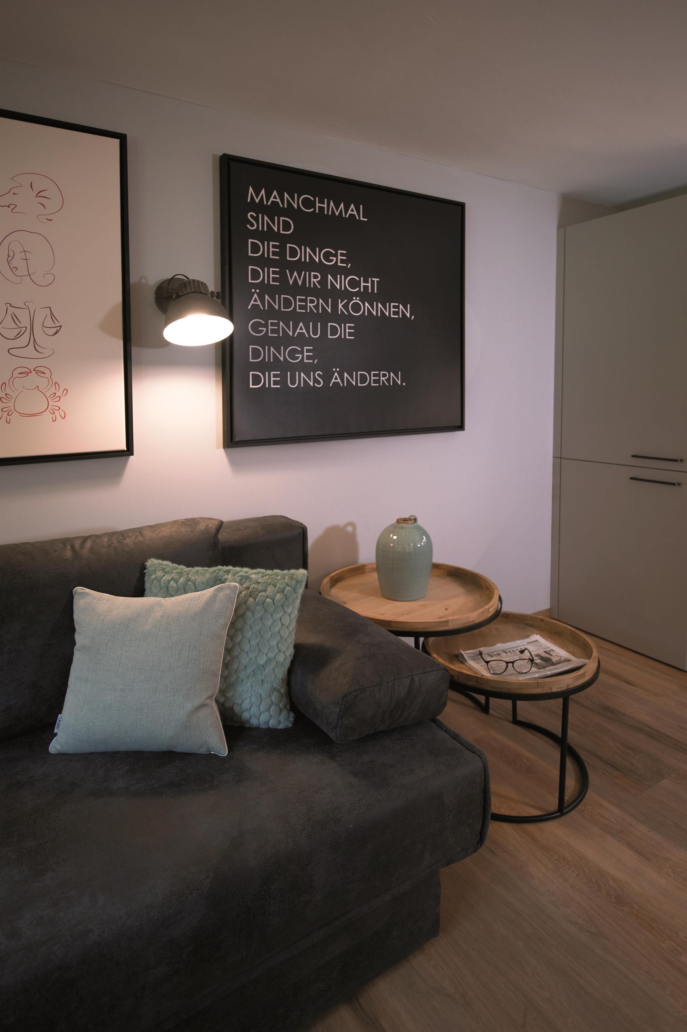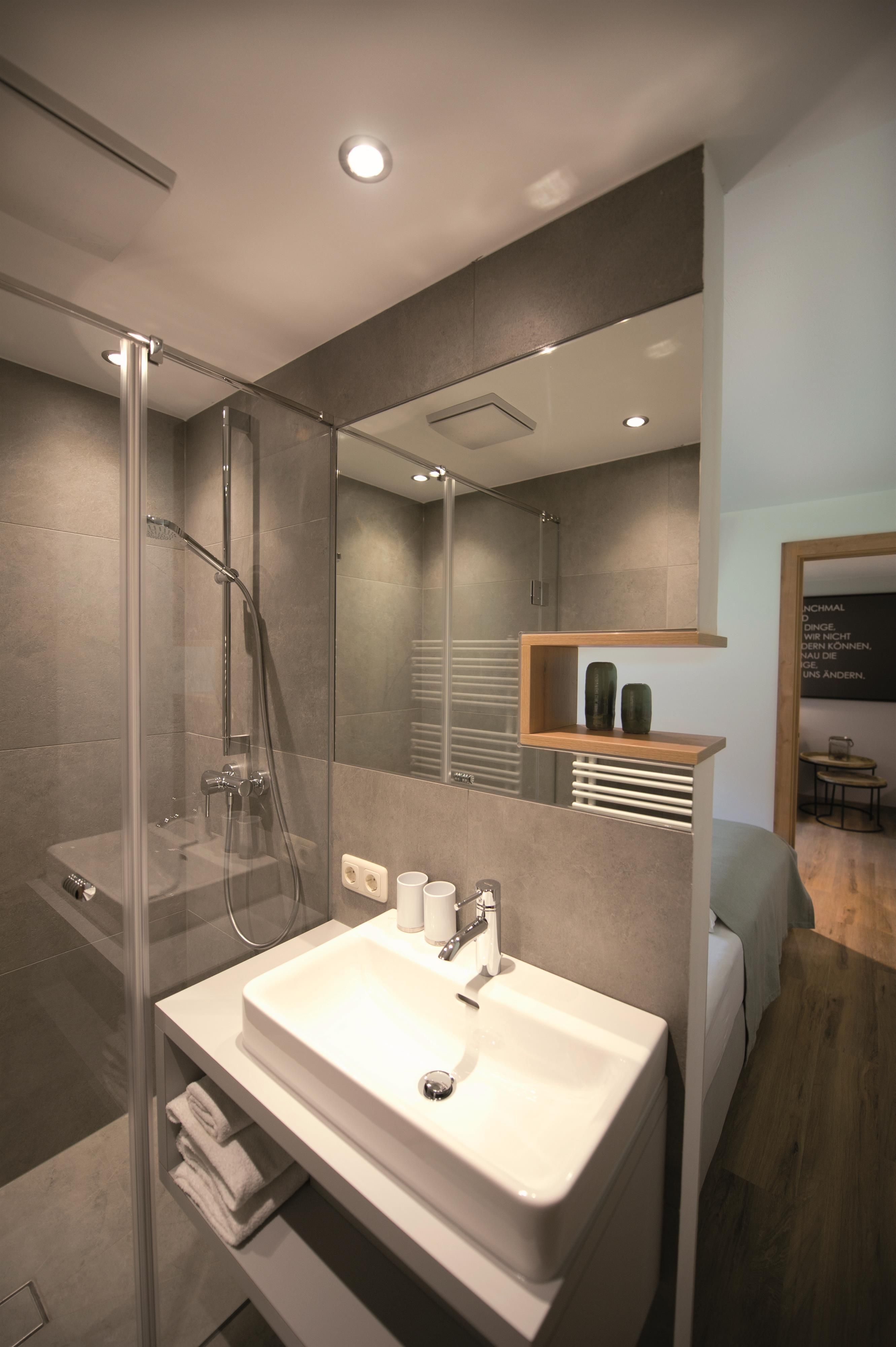 Das großzügige Apartment Wassermann im ersten Stock bietet auf 48 m² Platz für bis zu 5 Personen. Es verfügt über zwei Schlafzimmer mit Doppelbett sowie einer ausziehbaren Couch für eine weitere Person. Jedes Schlafzimmer hat ein eigenes Badezimmer mit Dusche und WC – perfekt für Komfort und Privatsphäre. Die helle Wohnküche ist mit einem gemütlichen Esstisch sowie einem Balkon ausgestattet und verfügt über eine moderne Küche mit E-Herd, Geschirrspüler, Espressomaschine und Mikrowelle.