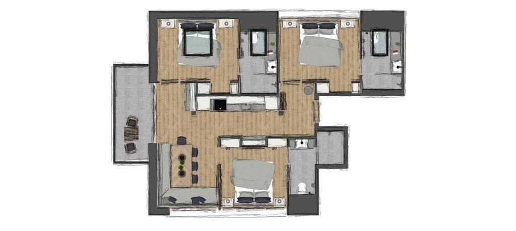 Das großzügige Apartment Jungfrau im zweiten Stock bietet auf 78 m² Platz für bis zu 6 Personen. Es verfügt über drei Schlafzimmer mit Doppelbett, jeweils mit eigenem Badezimmer mit Dusche und WC – ideal für Privatsphäre und Komfort. Die Wohnküche ist mit einem gemütlichen Esstisch ausgestattet und verfügt über eine moderne Küche mit E-Herd, Geschirrspüler, Espressomaschine und Mikrowelle. Ein Balkon lädt zum Entspannen an der frischen Luft ein.