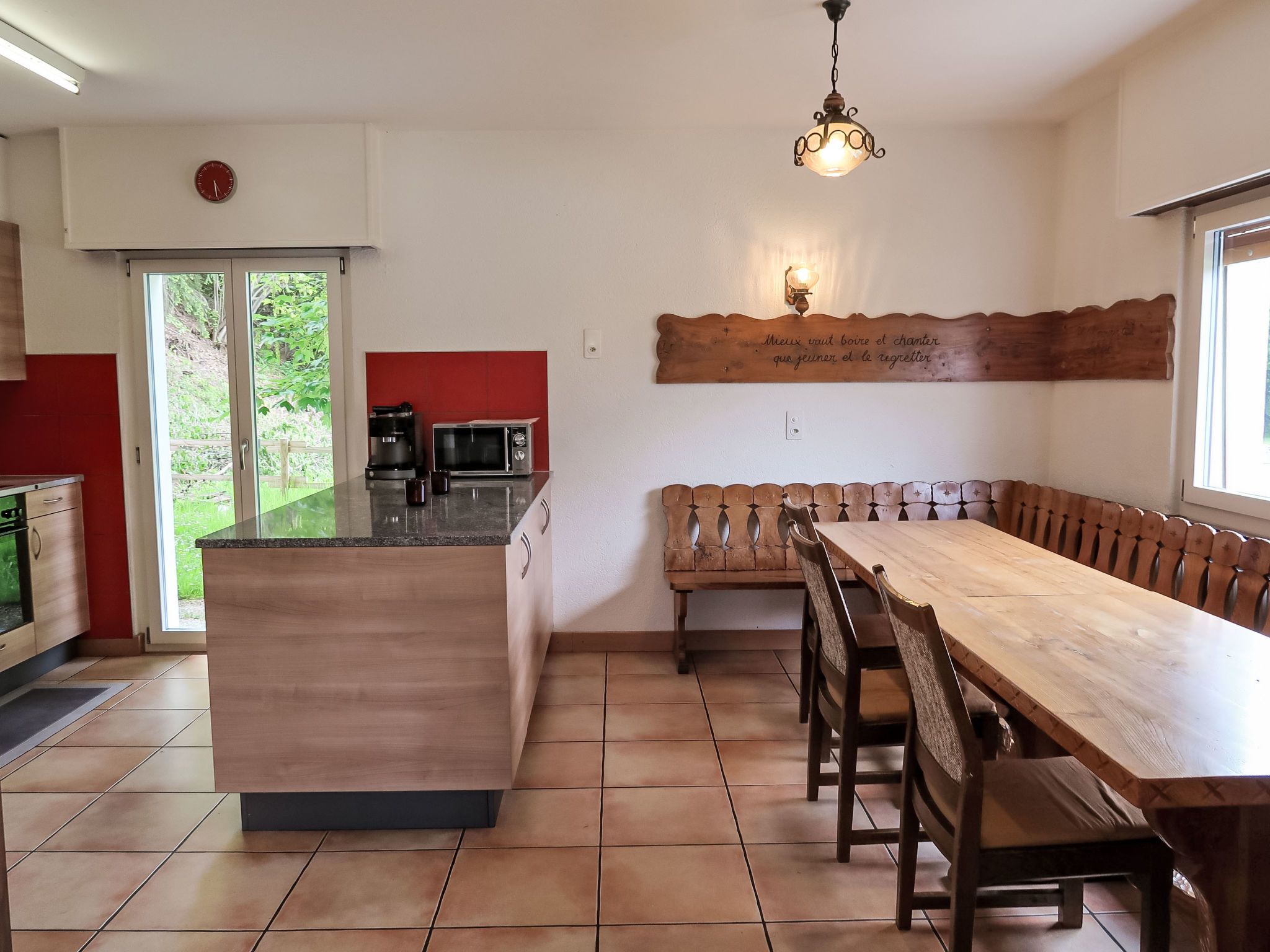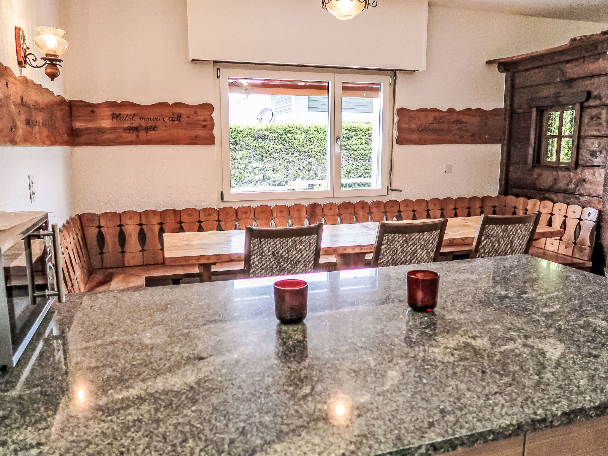 Chalet L'Etape, 6-Zimmer-Chalet auf 3 Stockwerken. Zweckmässig und komfortabel eingerichtet: Wohn-/Esszimmer mit Kabel-TV. Ausgang zum Garten. Offene Küche (Backofen, Geschirrspüler, 4 Glaskeramikplatten, Toaster, Wasserkocher, Mikrowelle, elektrische Kaffeemaschine, Kapseln für die Kaffeemaschine (Saeco), Racletteofen, Fondue Set (Käse)). 2 Duschen, 2 sep. WC's. Obergeschoss: 1 Zimmer mit 2 Betten (90 cm, Länge 200 cm), Waschbecken. Ausgang zum Balkon. 1 Zimmer mit 2 Betten (90 cm, Länge 200 cm), Waschbecken. 2 Zimmer, jedes Zimmer mit 2 Betten (90 cm, Länge 200 cm), Waschbecken. Bad/WC. Dachgeschoss: 1 abgeschrägtes, offenes Zimmer mit 2 Betten (90 cm, Länge 200 cm). 1 Zimmer mit 9 Betten. Balkon, grosser Garten. Schöne Sicht auf die Berge und die Landschaft. Zur Verfügung: Internet (WLAN, gratis). Parkplatz (6 Autos) beim Haus. Bitte beachten: Nichtraucher-Unterkunft. Maximal 1 Haustier/Hund erlaubt.