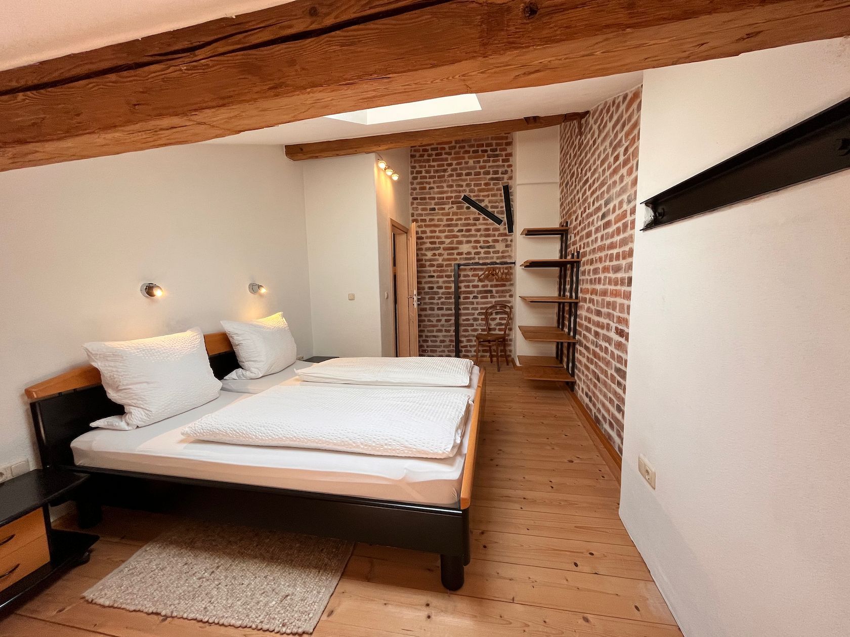 Die Ferienwohnung Ludwig befindet sich im ersten Obergeschoss und erstreckt sich über 2 Etagen. Auf der ersten Etage befindet sich eine große, voll ausgestattete Wohnküche mit Spülmaschine, Essplatz und einer gemütlichen Couch, das Bad und ein Schlafzimmer mit Etagenbetten. Über eine offene Treppe gelangt man in das Obergeschoss mit zwei weiteren Schlafzimmer und einem Chillroom. Ein Gemeinschaftsbalkon ist im ersten Stock über den Hausgang zu erreichen.