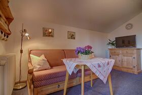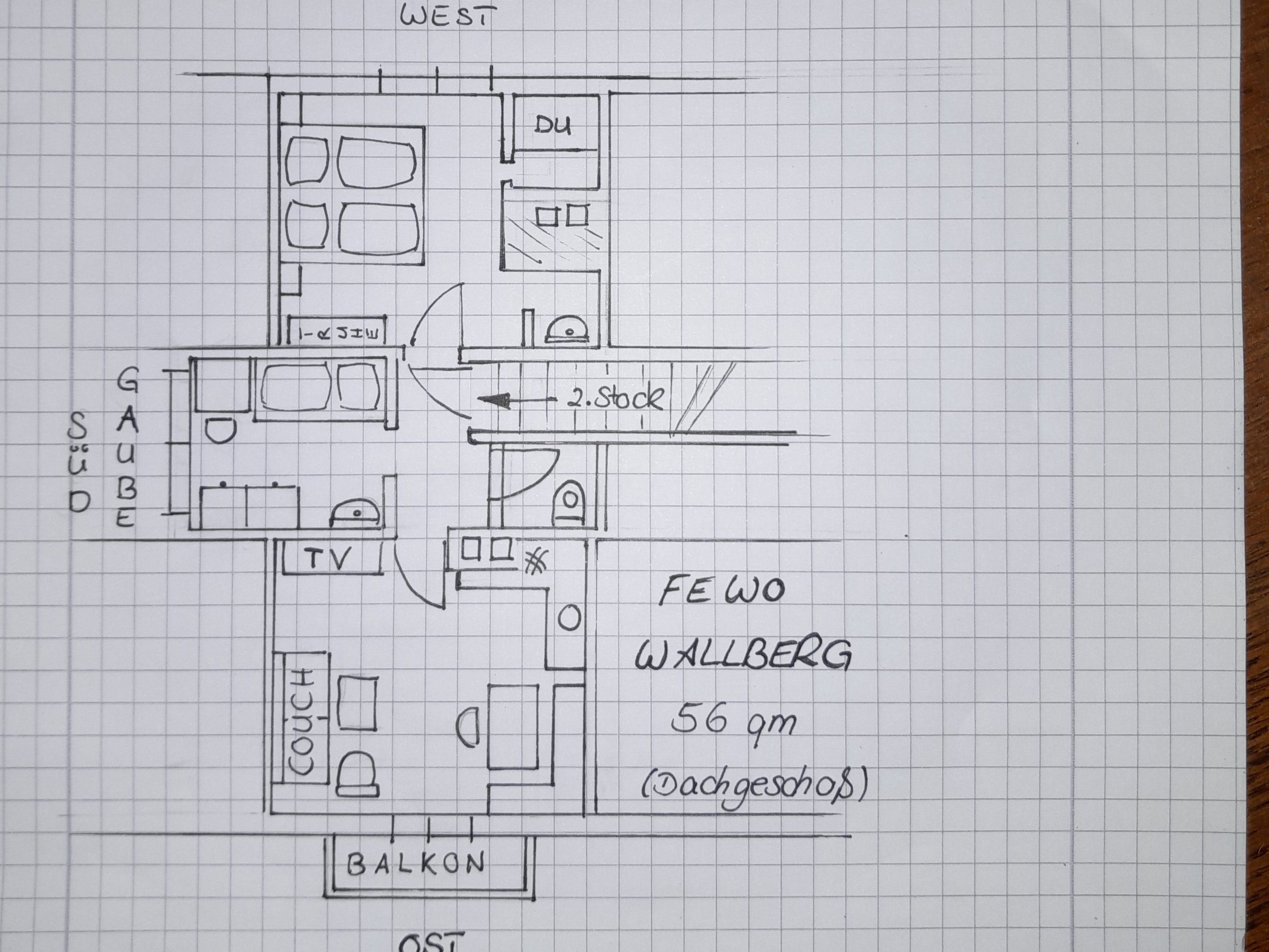 Unsere heimelige Ferienwohnung Wallberg mit ca. 56 qm befindet sich im 2. Stock (Dachgeschoss, Teppichböden).