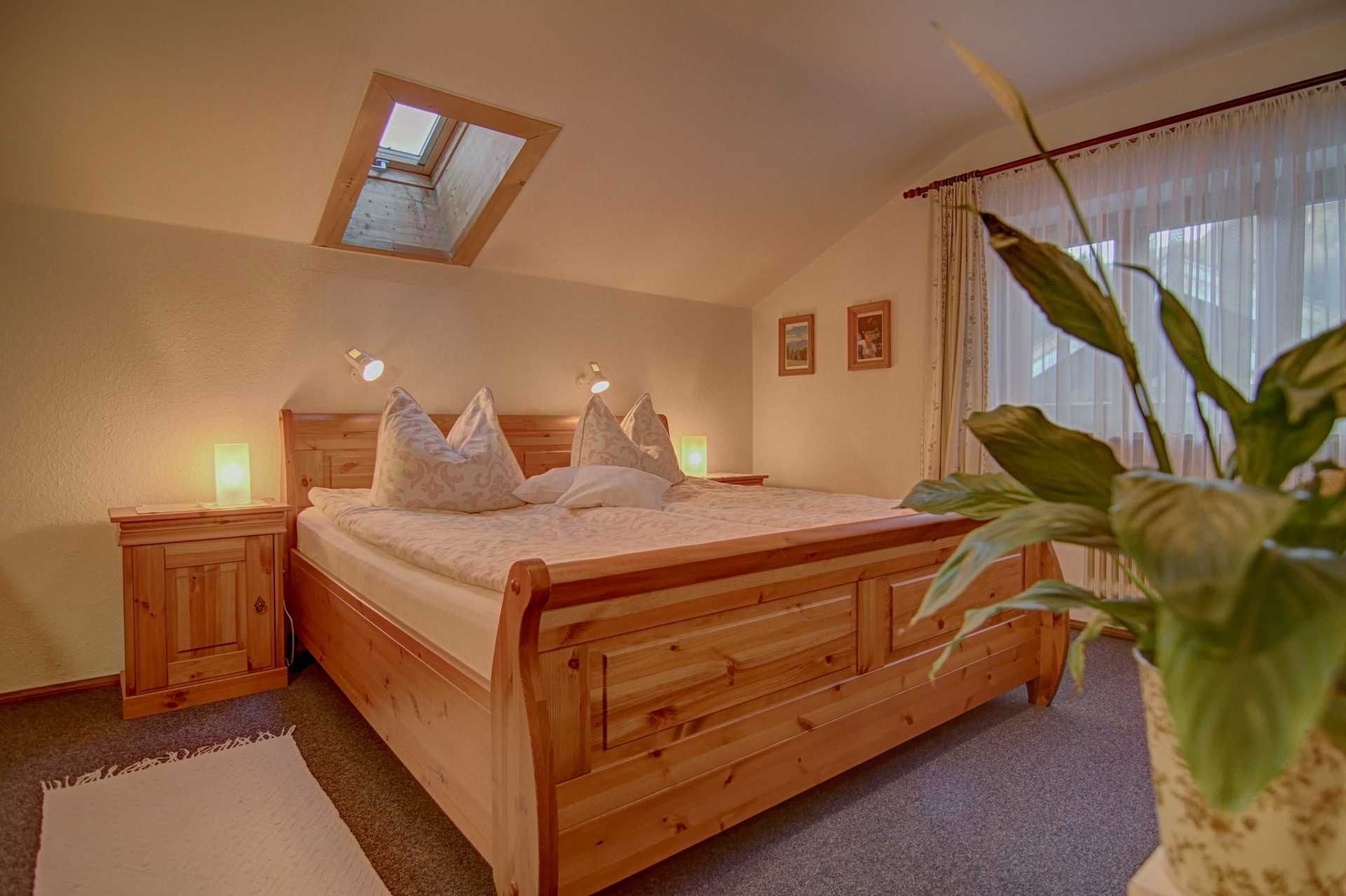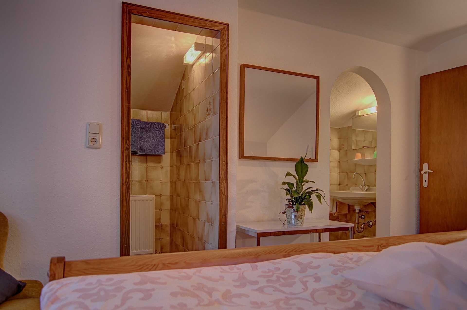 Schlafzimmer mit Doppelbett inklusive Duschecke und