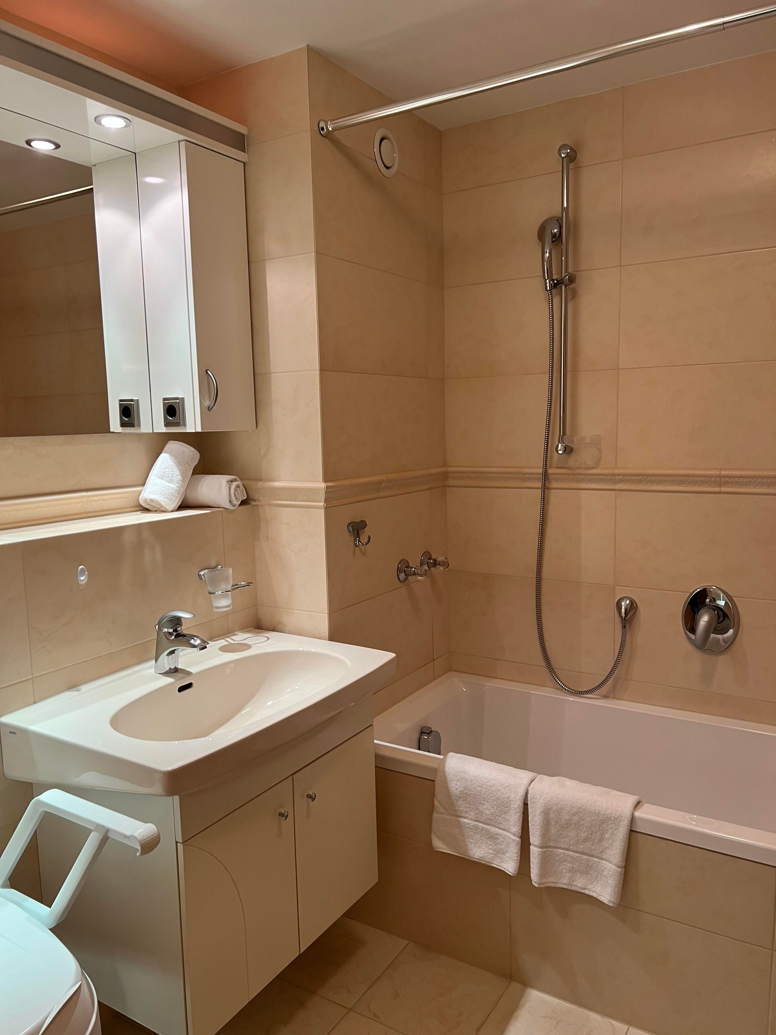 Das etwa 35 m² große Appartement ist ideal für bis zu 2 Personen und bietet einen kombinierten Wohn- und Schlafbereich, eine Küchenzeile, ein Badezimmer und einen Balkon.