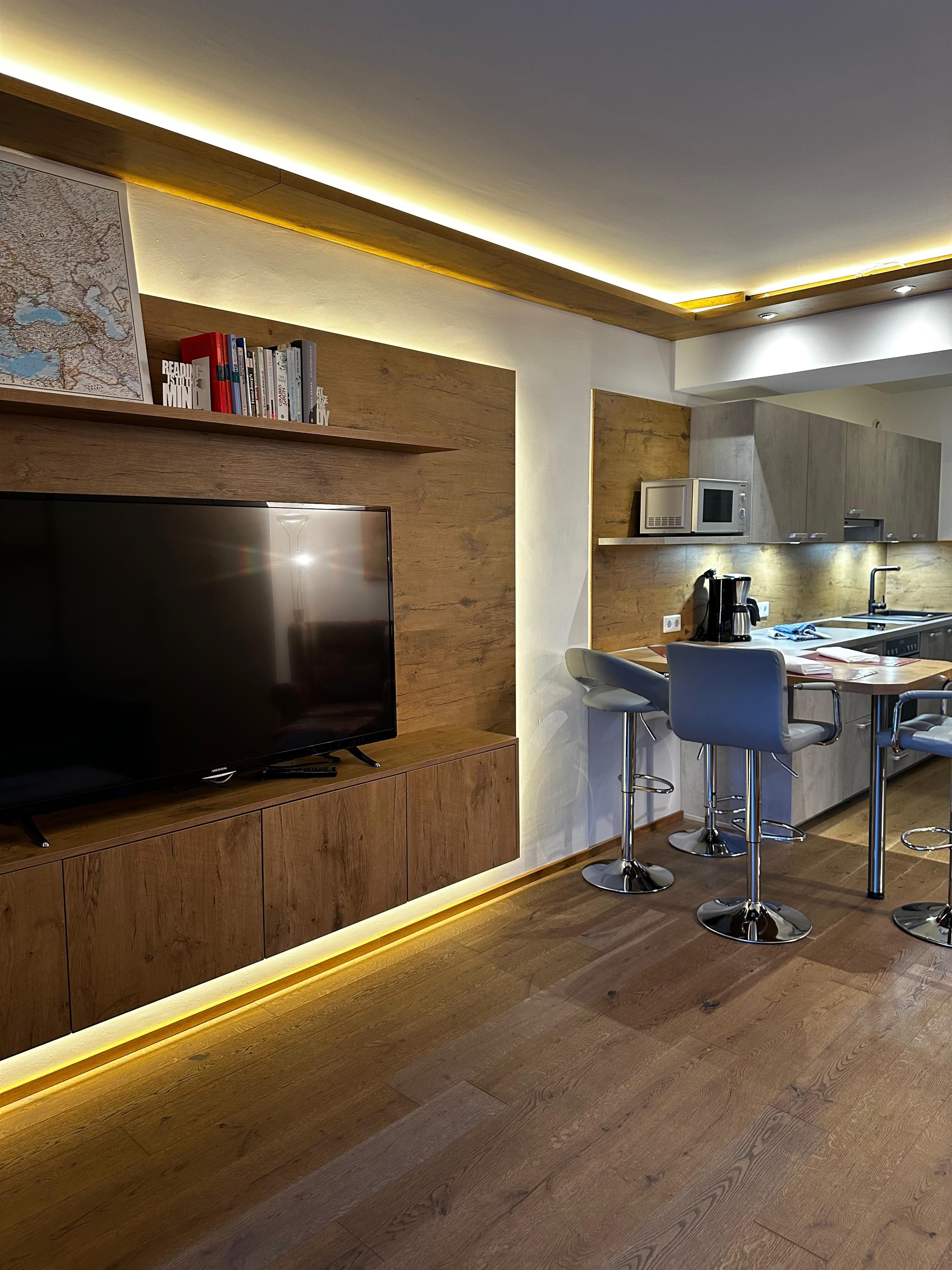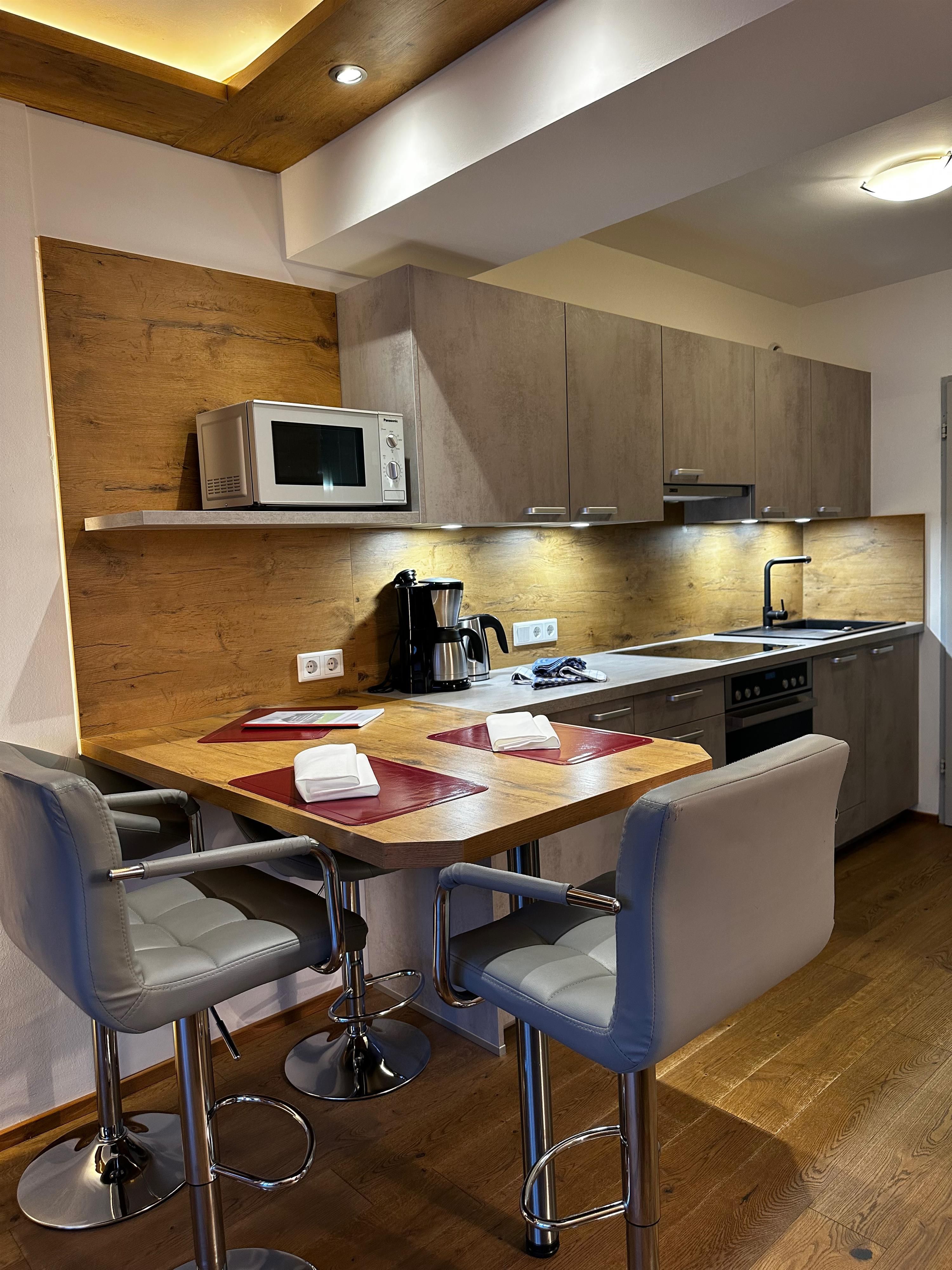 Das etwa 35 m² große Appartement ist ideal für bis zu 2 Personen und bietet einen kombinierten Wohn- und Schlafbereich, eine Küchenzeile, ein Badezimmer und einen Balkon.