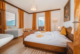 Panoramaperle, 6-Zimmer-Wohnung 100 m2 im 1. Stock. Modern und gemütlich eingerichtet: Wohn-/Esszimmer mit Sat-TV. 2 Doppelzimmer. 2 Zimmer, jedes Zimmer mit 2 Betten. 1 Zimmer mit 1 Bett. Grosse Küche (Backofen, Geschirrspüler, 4 Glaskeramikplatten, Wasserkocher, Tiefkühler, elektrische Kaffeemaschine) mit Esstisch. Dusche, sep. WC. Heizung. Balkon. Balkonmöbel. Sehr schöne Panoramasicht auf die Berge. Zur Verfügung: Internet (WLAN, gratis). Bitte beachten: Nichtraucher-Unterkunft. Maximal 1 Haustier/Hund erlaubt. 50614-5