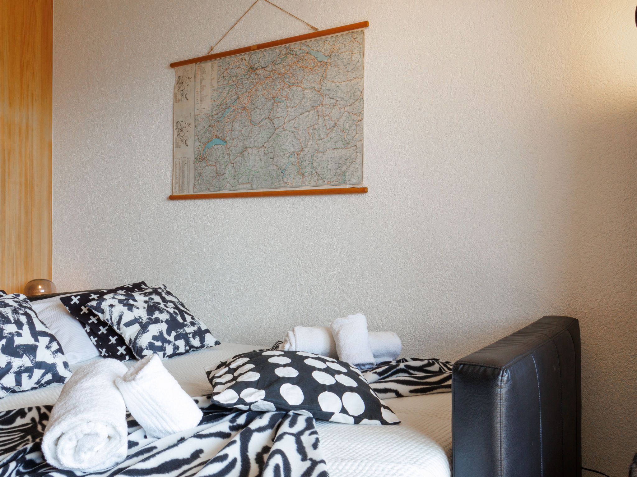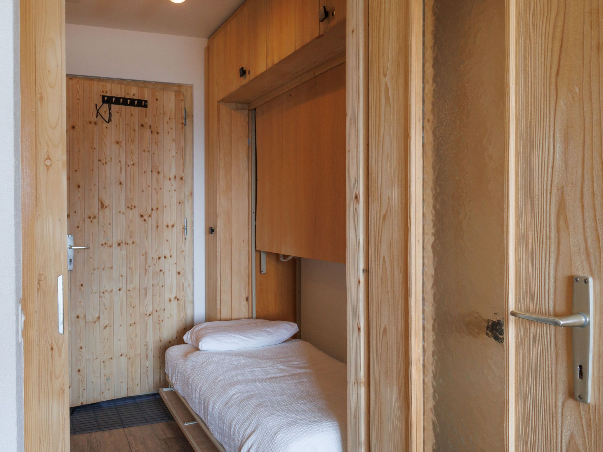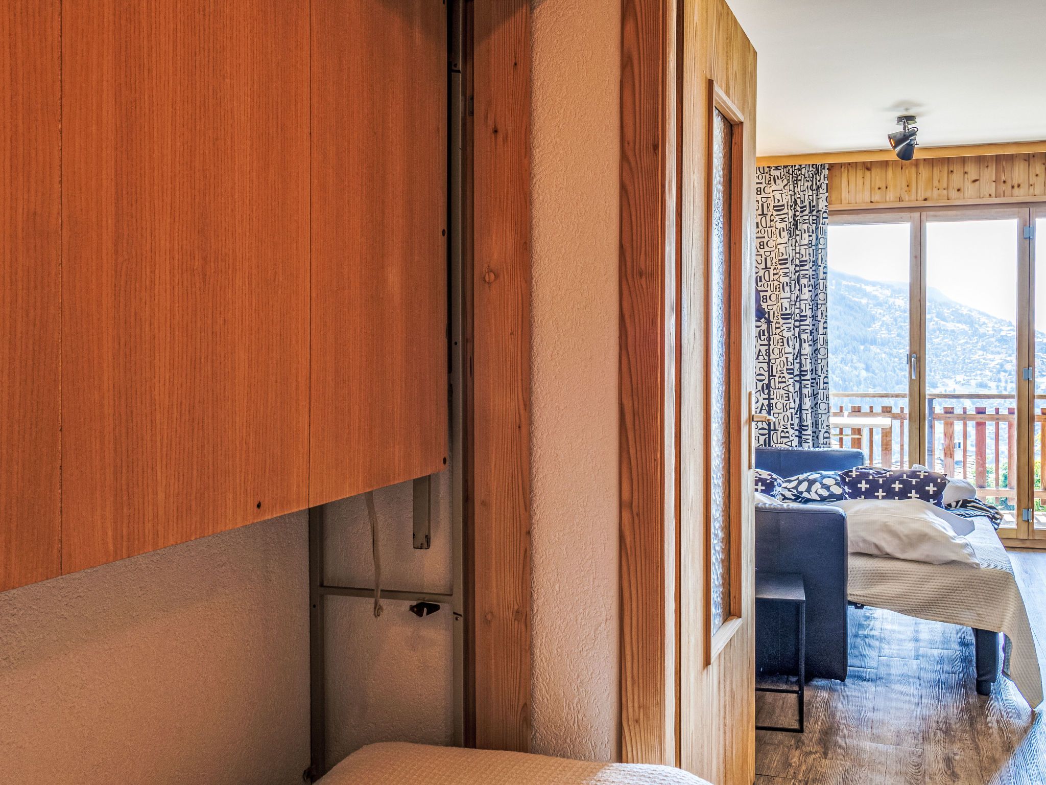 Beau Soleil G11, 1-Zimmer-Studio 25 m2 im 1. Stock. Objekt geeignet für 2 Erwachsene + 1 Kind. Schön eingerichtet: Eingang mit 1 Wandklappbett (80 cm, Länge 190 cm). Wohn-/Esszimmer mit 1 Diwanbett (140 cm, Länge 200 cm), Kabel-TV. Ausgang zum Balkon. Kleine, offene Küche (4 Glaskeramikplatten, Wasserkocher, Mikrowelle, elektrische Kaffeemaschine, Kapseln für die Kaffeemaschine (Nespresso) extra, Racletteofen, Fondue Set (Chinoise, Käse)). Dusche/WC. Kleiner Balkon, Nordwestlage. Balkonmöbel. Sehr schöne Sicht auf die Berge und das Tal. Zur Verfügung: Internet (WLAN, gratis). Bitte beachten: Nichtraucher-Unterkunft, kein Parkplatz. Anstelle eines abgeschlossenen Schlafzimmers befinden sich manche Schlafplätze in einem offenen Bereich (Galerie, Nische etc.).