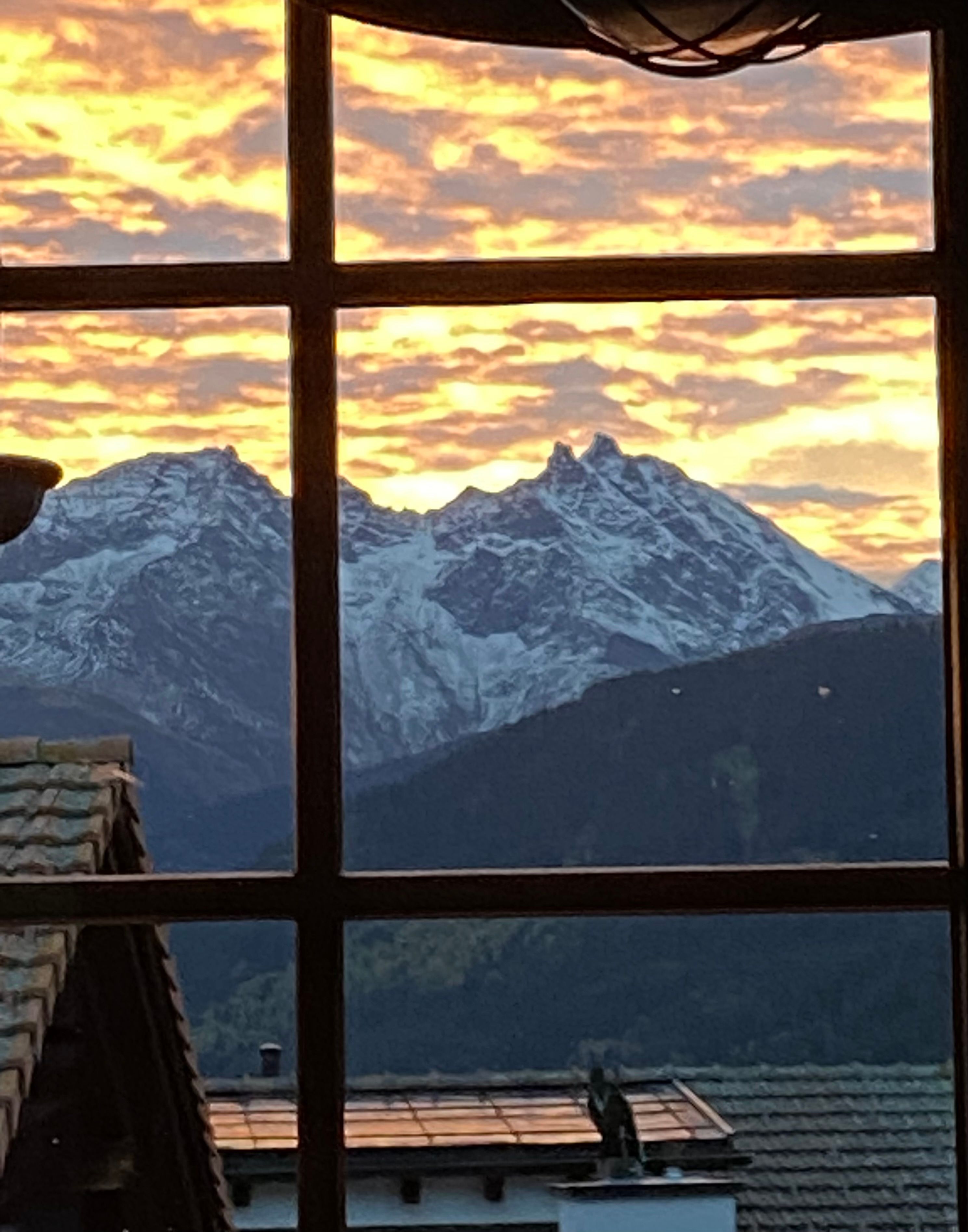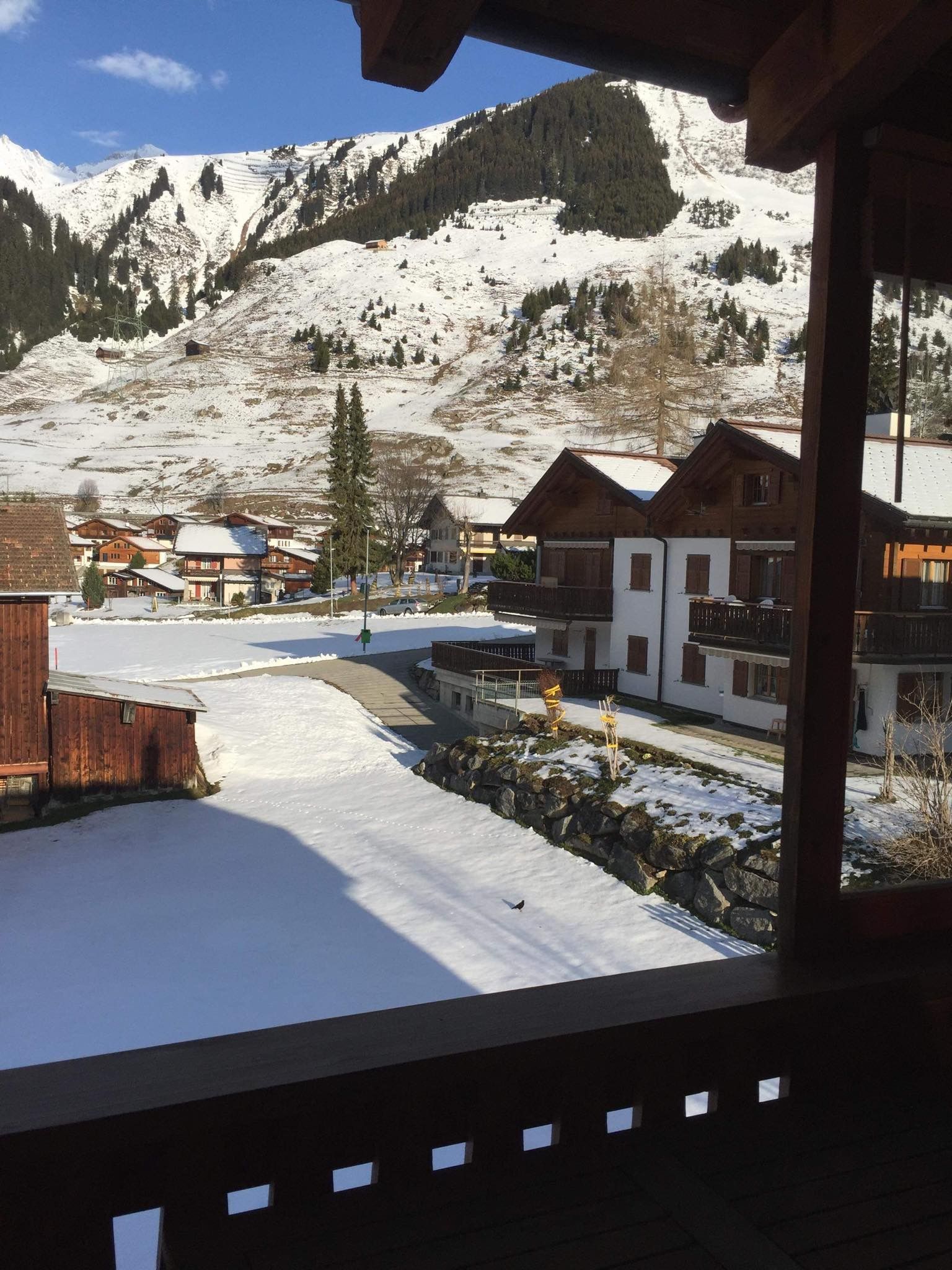 Der Außenbereich der Ferienwohnung bietet mit seinem Balkon mit Windschutz Sicht über die Dächer in die Berge bis zur Skipiste.
