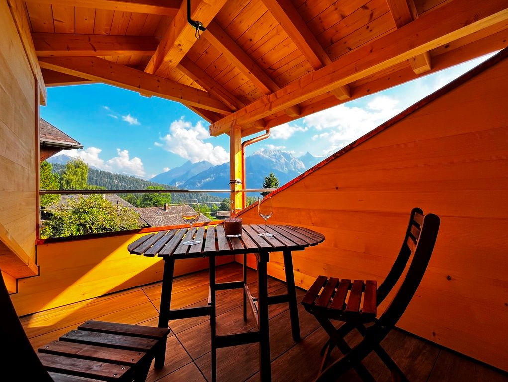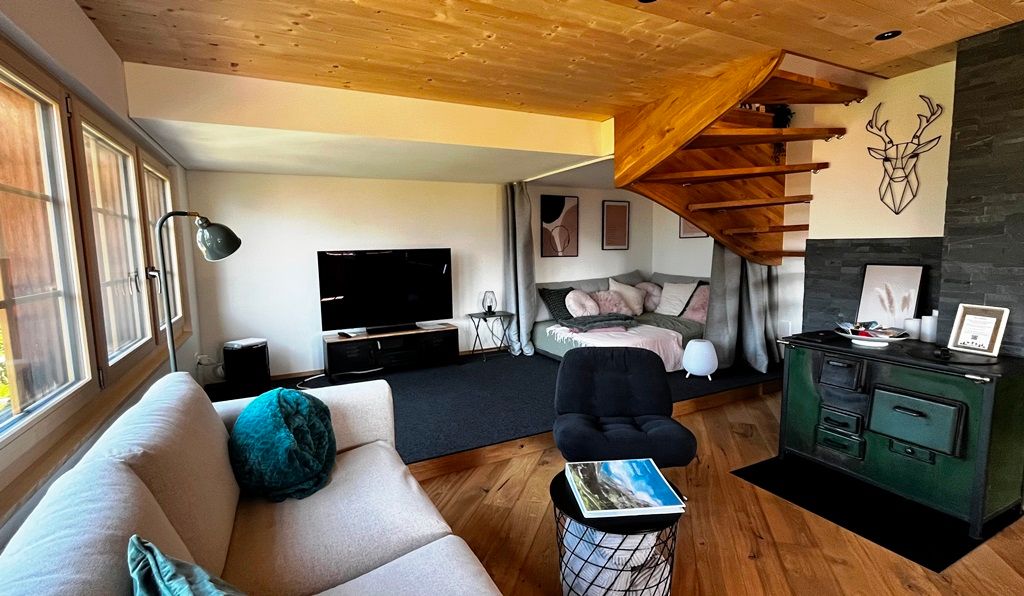 Eine offene Treppe führt hinauf in den charmanten Dachstock, wo sich ein weiterer Schlafbereich mit viel Holz, Licht und gemütlicher Atmosphäre befindet. Ein besonderes Extra ist die Lukarne mit Balkon, ausgestattet mit Hängematte und Gartenbestuhlung – hier geniessen Sie eine gute Aussicht und entspannte Stunden im Freien.
