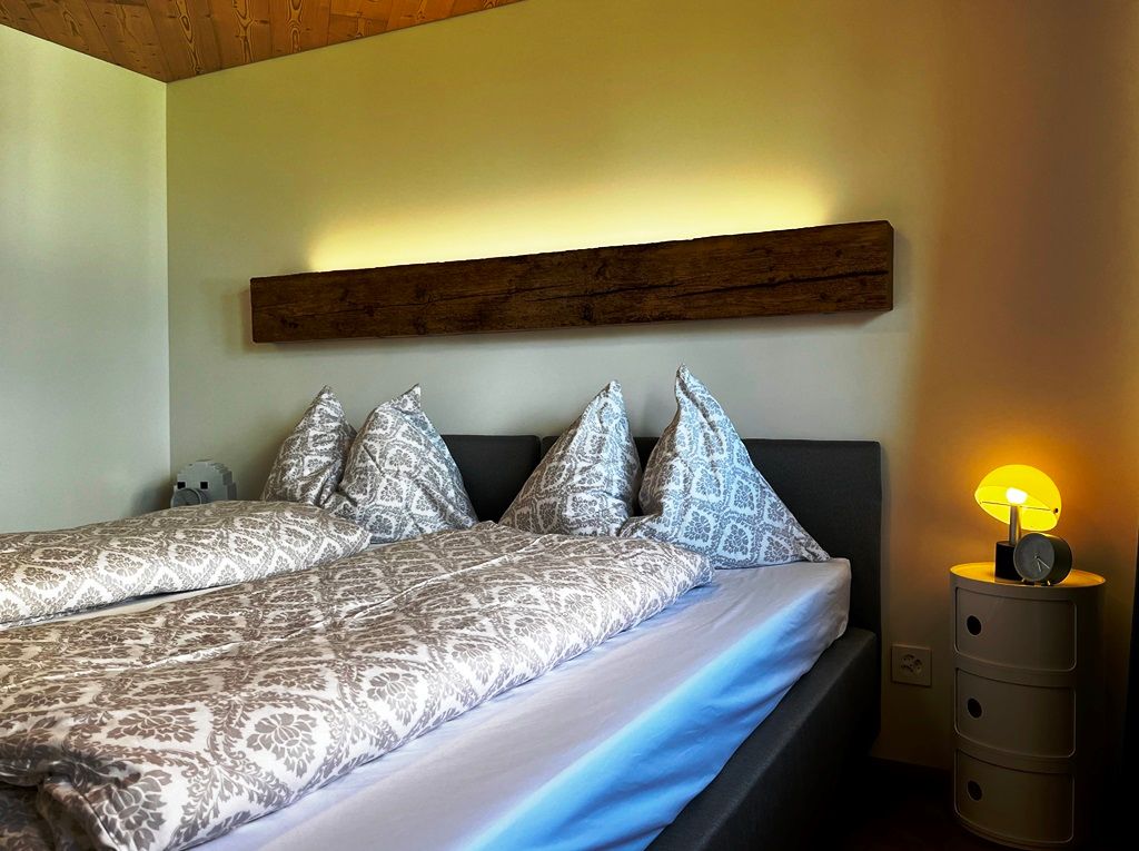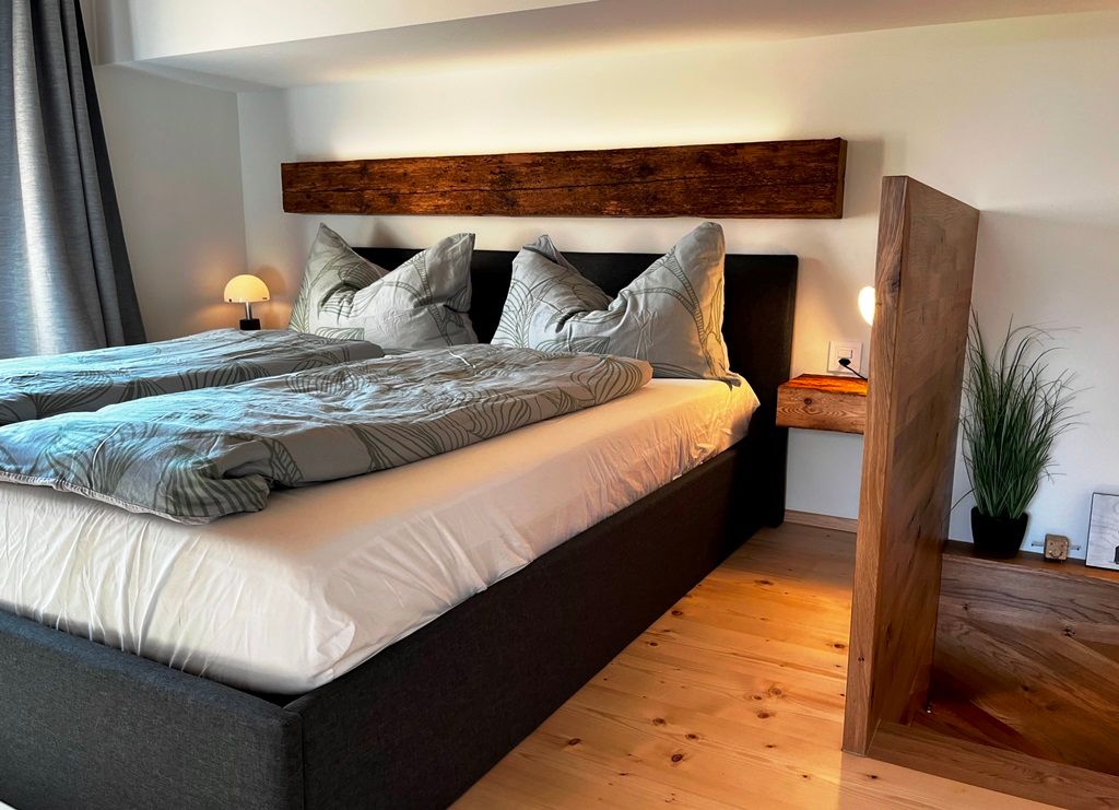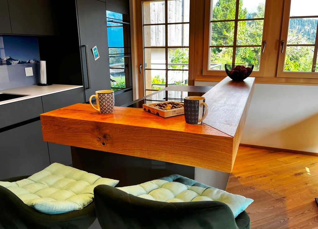 Diese stilvoll ausgebaute Ferienwohnung befindet sich in einem sorgfältig renovierten, alten Haus, das Geschichte mit modernem Wohnkomfort vereint. Im Zentrum der Wohnung liegt ein grosszügiger, heller Wohnbereich mit offener Raumgestaltung. Die moderne Küche mit Kochinsel und integrierter Bar geht fließend in den Wohn- und Essbereich über und lädt zu geselligen Stunden ein. Angrenzend befindet sich eine gemütliche Chillecke mit Futon-Schlafsofa – ideal zum Entspannen oder als zusätzlicher Schlafplatz mit Vorhang zum abtrennen und verdunkeln.
