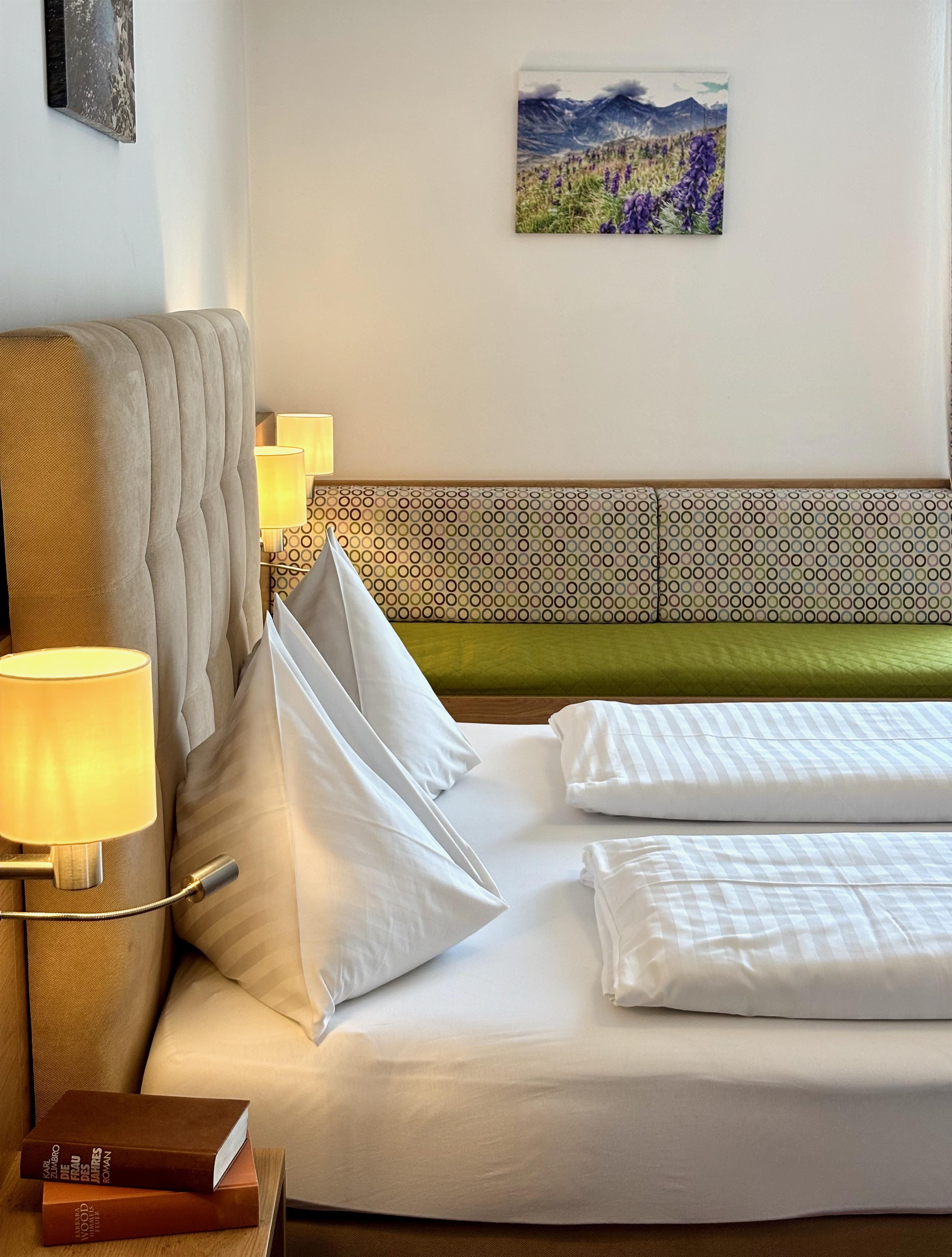 Erleben Sie besonderen Komfort in unserem Superior Doppelzimmer, das mit extra viel Platz und Südlage überzeugt. Das großzügige Zimmer bietet ein komfortables Doppelbett und ist ideal für Paare oder kleine Familien, denn auf Wunsch kann ein zusätzliches Bett für eine dritte Person bereitgestellt werden. Jedes Superior Doppelzimmer verfügt über ein eigenes Bad in dem Sie sich entspannen und erfrischen können.