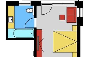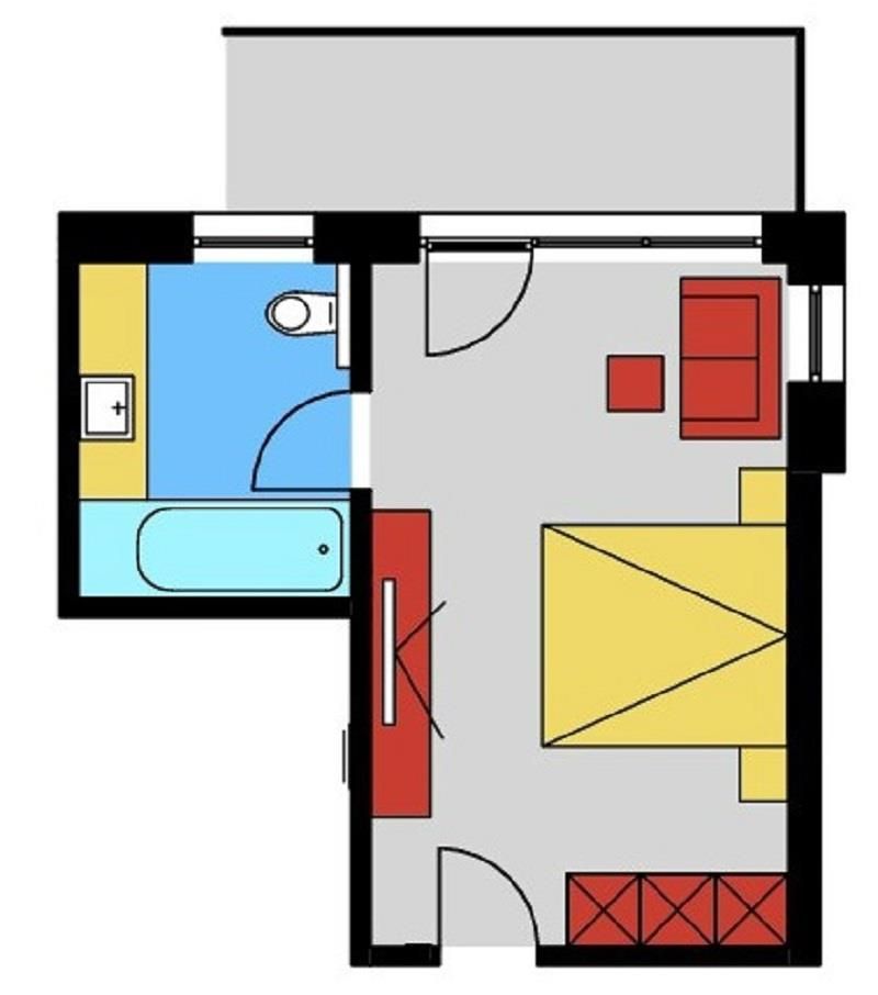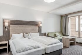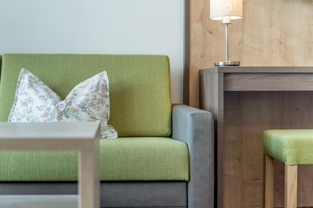 1 Zimmer mit Schlaf- & Wohnbereich, Badezimmer mit Badewanne, Balkon nach Norden gerichtet, Betten für 1. und 2. Person auf Wunsch auch trennbar, Unterbringung einer 3. Person auf der Schlafcouch möglich. Größe ca. 25 m²