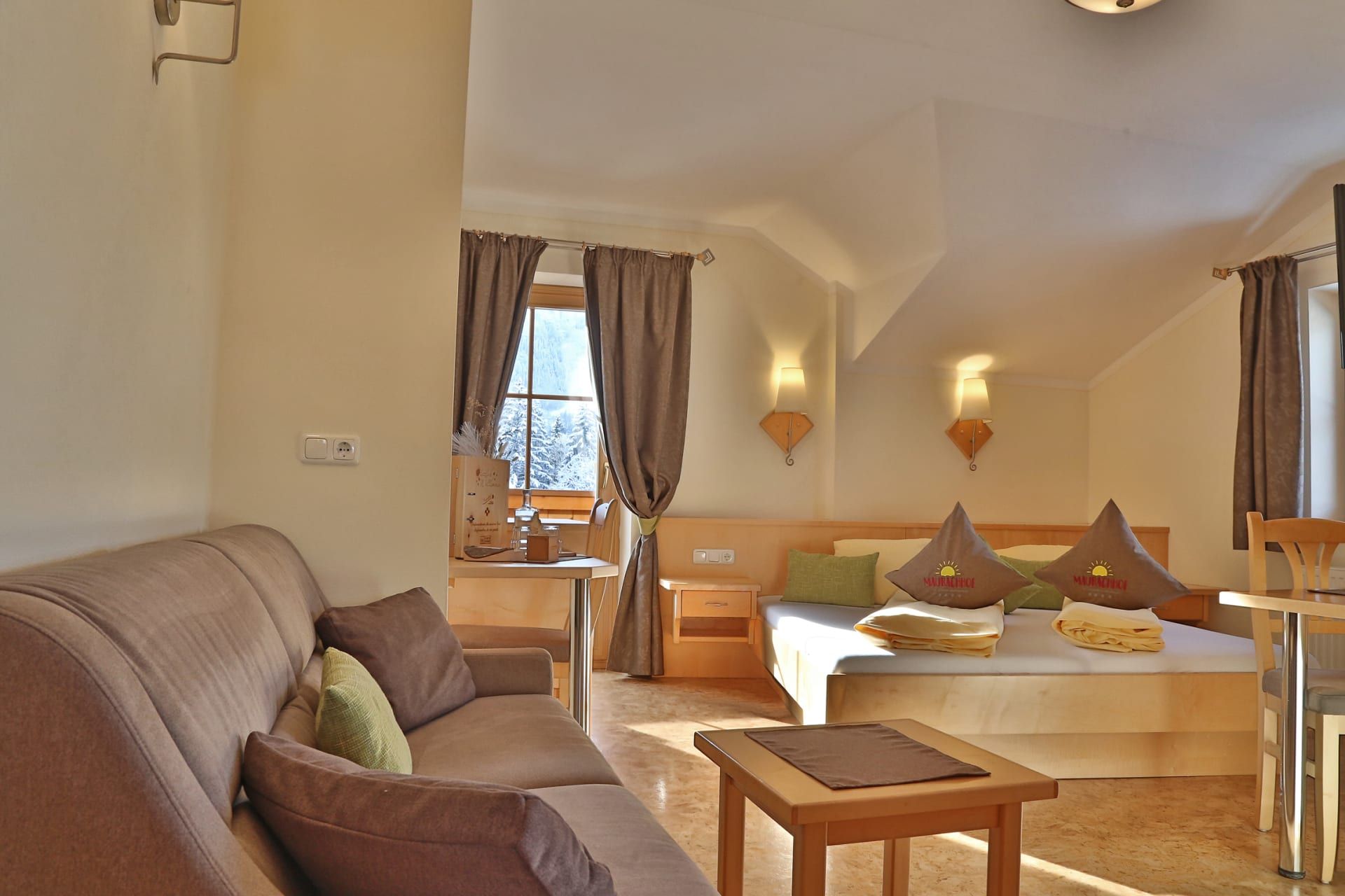 Im gewohnten Maurachhof Qualitätsstandard ist dieses schöne südseitig gelegene Familienzimmer mit  Badezimmer mit Dusche, Wc und Haarfön, Balkon mit Gartenmöbeln und Aussicht auf unsere schöne Berglandschaft , Kabel – TV, Kostenfreier Internetzugang  und Safe ausgestattet.