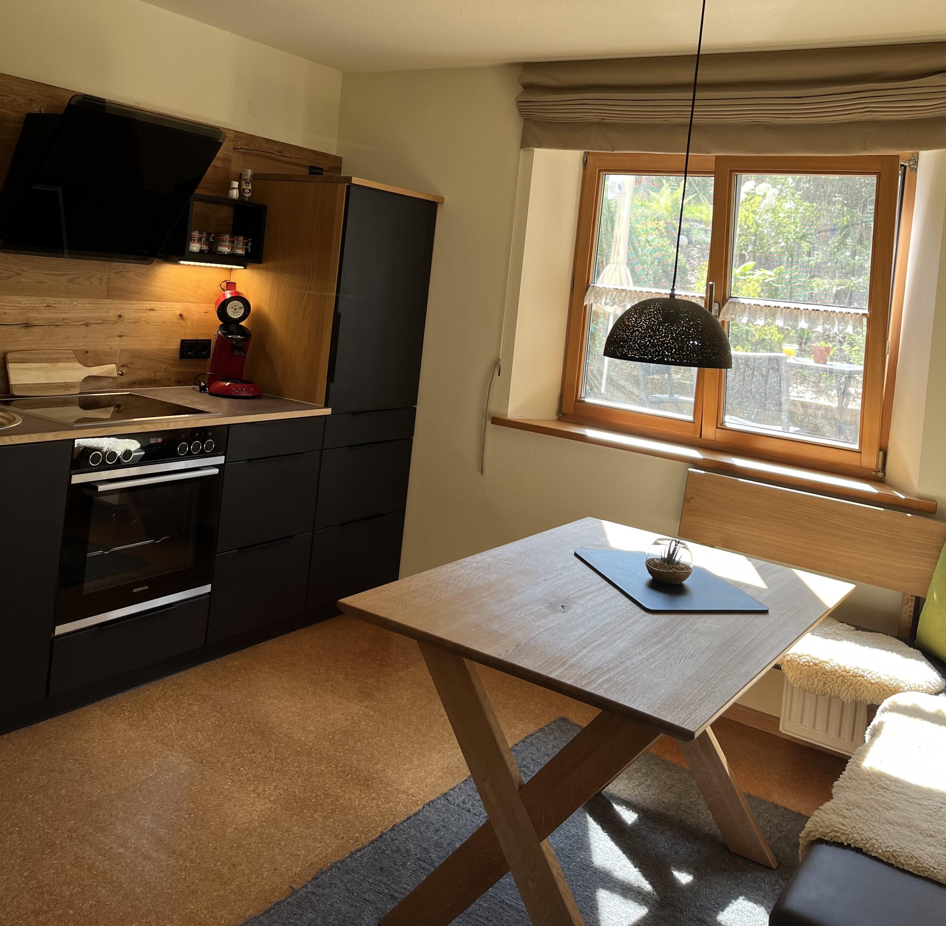 Die Ferienwohnung bietet Platz für bis zu 2 Personen und ist ausgestattet mit einer nach Westen ausgerichteten Wohnküche mit Eckbank und einer Terrassentür. Im Wohnzimmer befindet sich eine Lesebank und ein Schlafsofa ( 150 x 200) Das Fichten-Schlafzimmer mit Morgensonne (im Sommer), welches nach Osten ausgerichtet ist, ist voll verdunkelbar. Das Badezimmer ist mit einer Regendusche, WC und einem Aussenfenster ausgestattet.