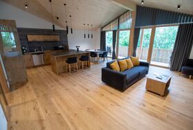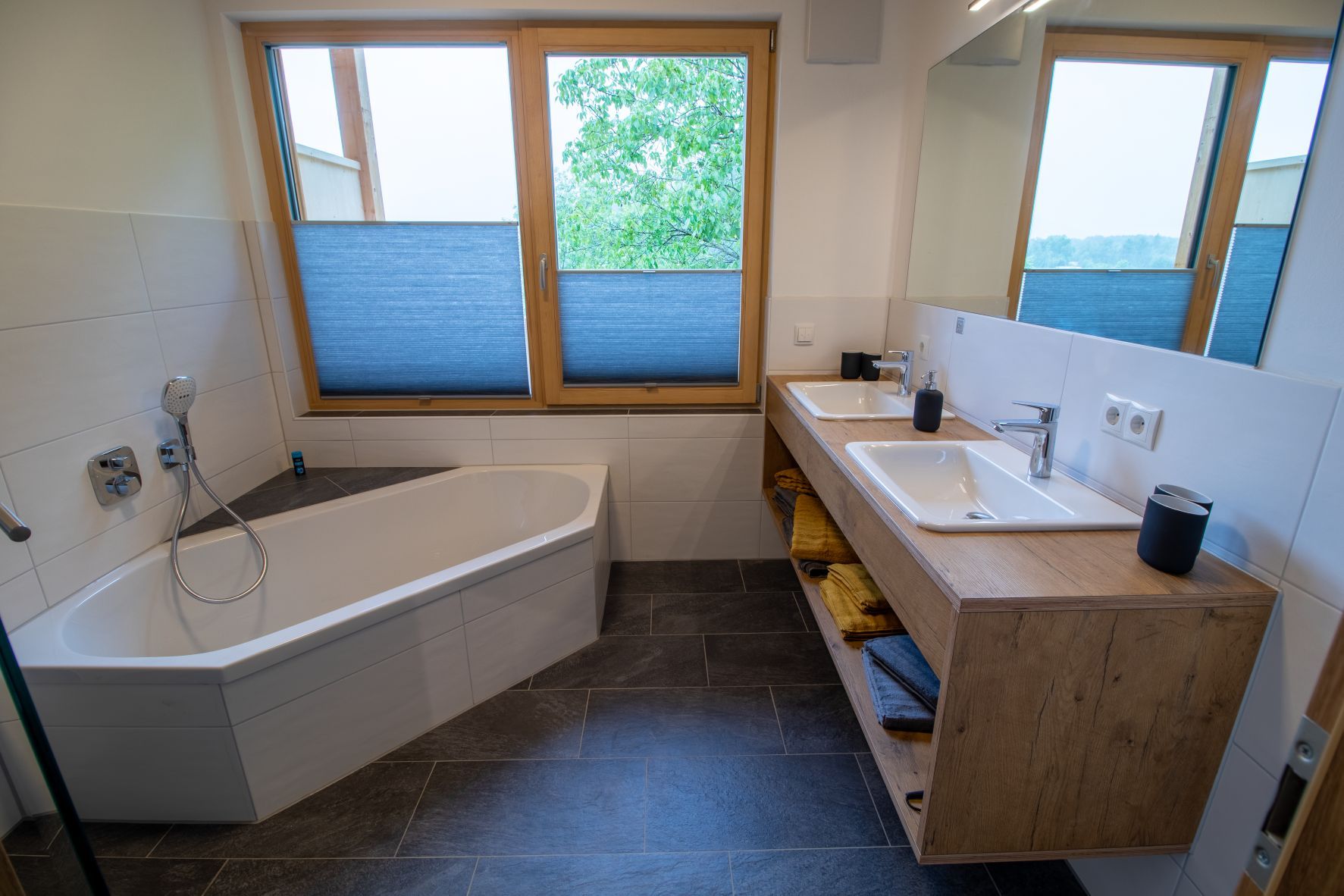 Am großen Esstisch findet die ganze Familie Platz. Das Bad verfügt über ein Doppelwaschbecken, eine Wasserfalldusche und eine Eckbadewanne. Die Ferienwohnung ist völlig barrierefrei und über einen Aufzug direkt vom Parkplatz aus erreichbar. Handtücher und Bettwäsche sind in der Ferienwohnung vorhanden und eine Benutzung der Waschmaschine ist natürlich möglich. Auch WLAN gibt es in unseren Ferienwohnungen.