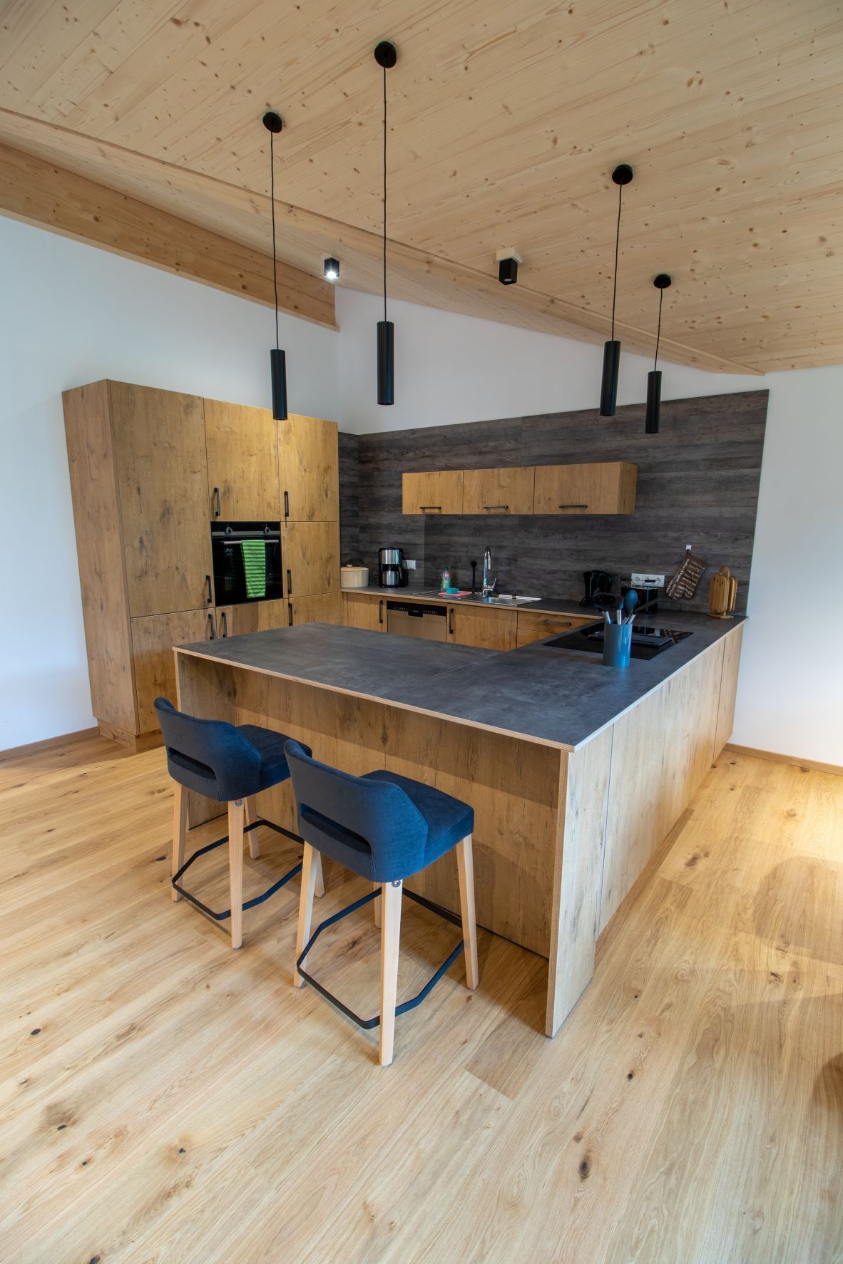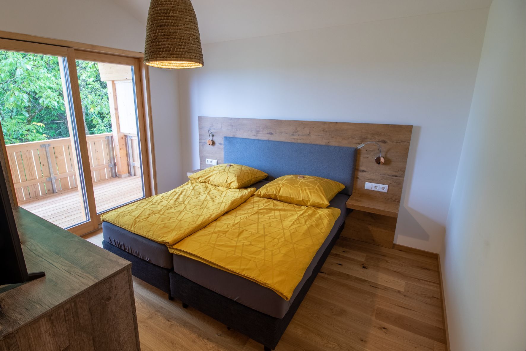 Unsere Ferienwohnung Mittag ist mit rund 90 m² äußerst großzügig angelegt und verfügt sogar über drei Balkone. Sie ist mit zwei Schlafzimmern ausgestattet. Damit finden in dieser Luxusferienwohnung bis zu vier Personen Platz. Der Küchenblock aus Holz ist nicht nur schön anzusehen, sondern komplett ausgestattet mit Geschirr und Küchengeräten.