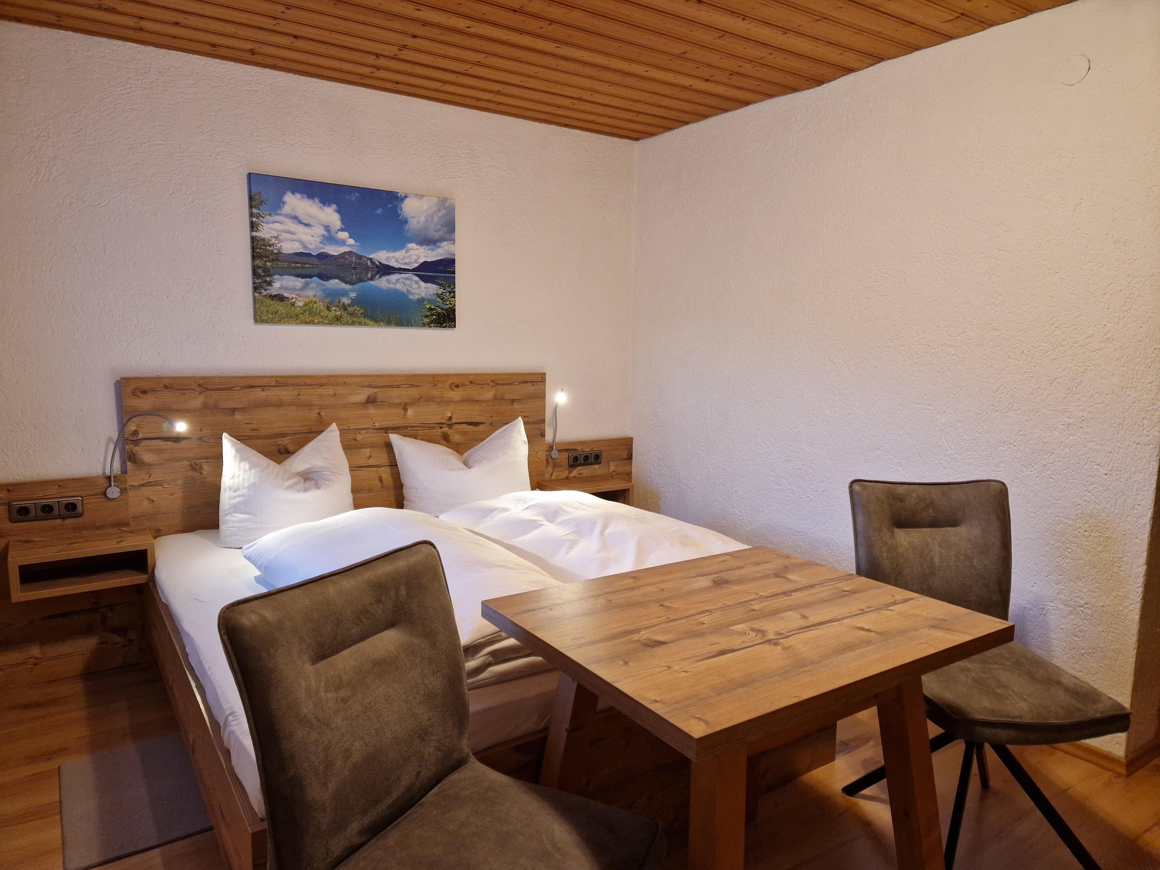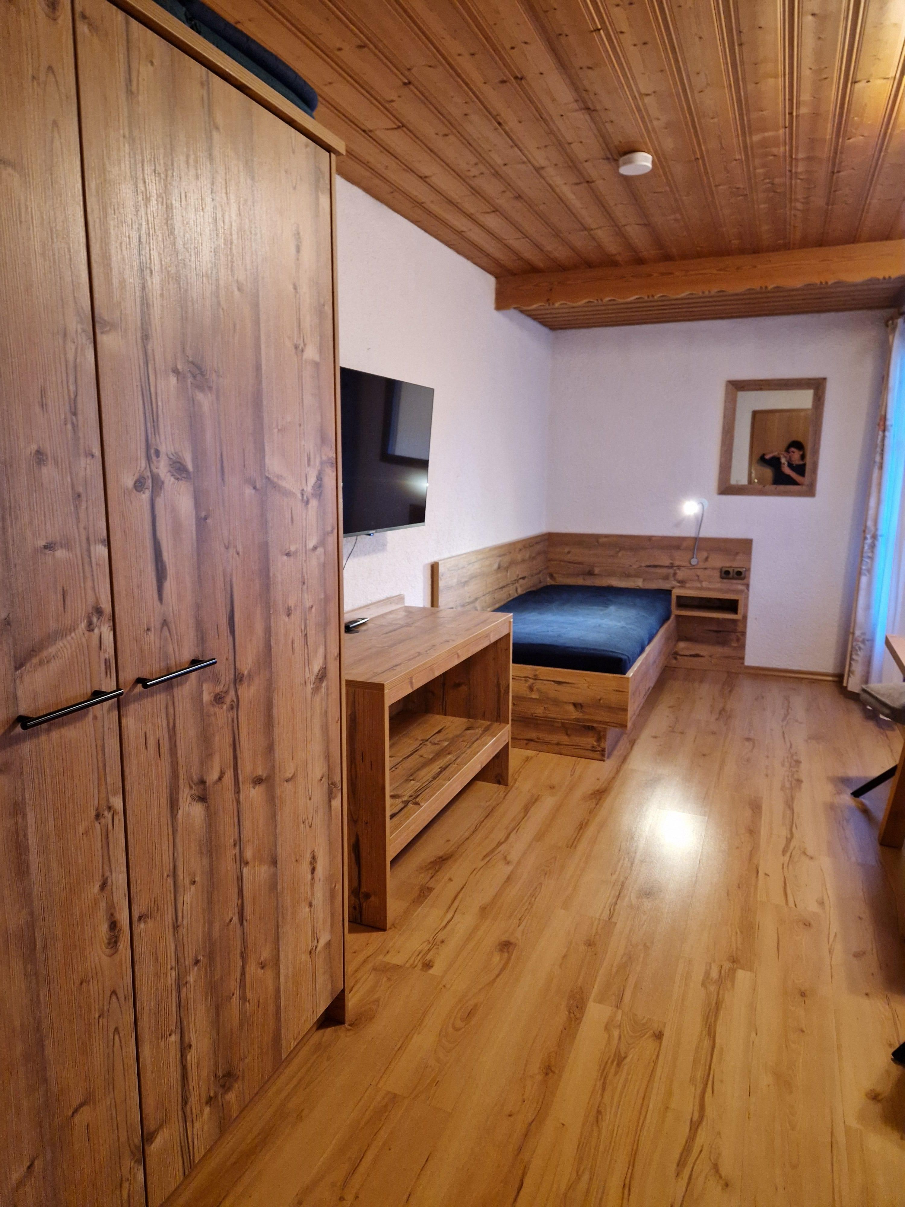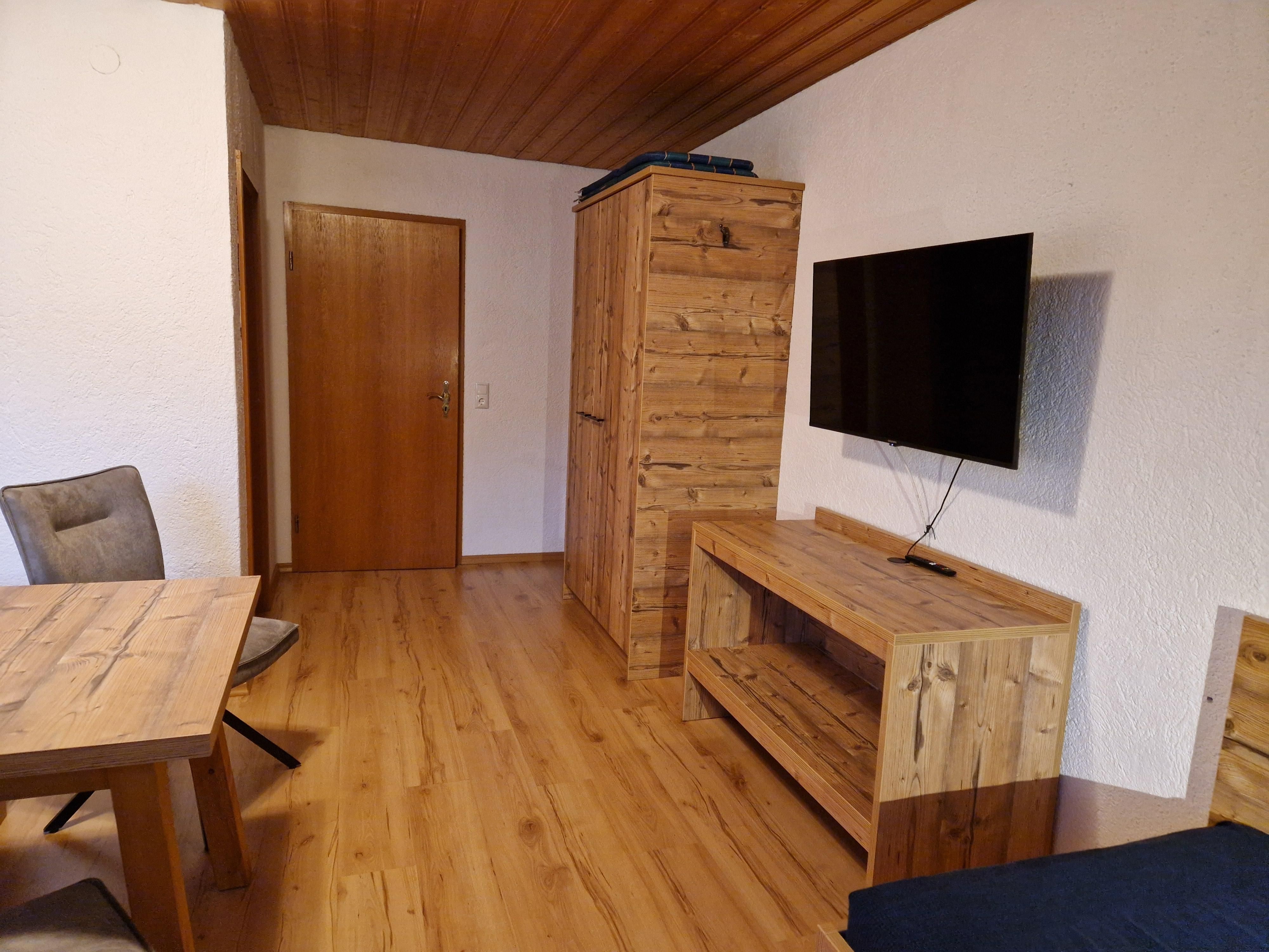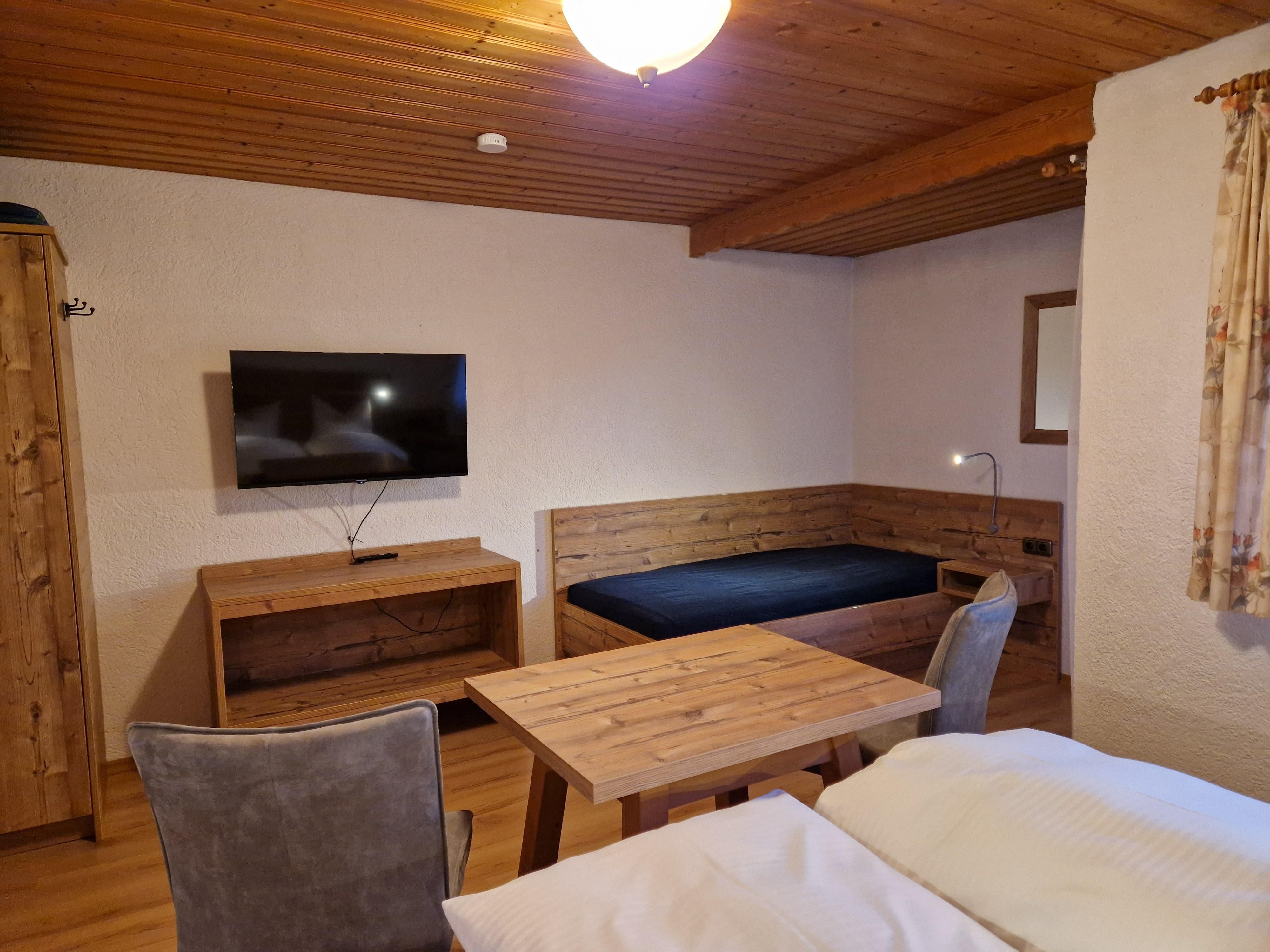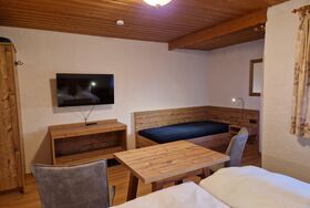 Geräumiges Dreibettzimmer mit Balkon, Bad und WC. Kabel-TV und Gästekühlschrank sind vorhanden. Föhn auf Anfrage. Gemütlicher Aufenthaltsraum mit Teeküche und WLAN-Empfang steht zur freien Verfügung.
