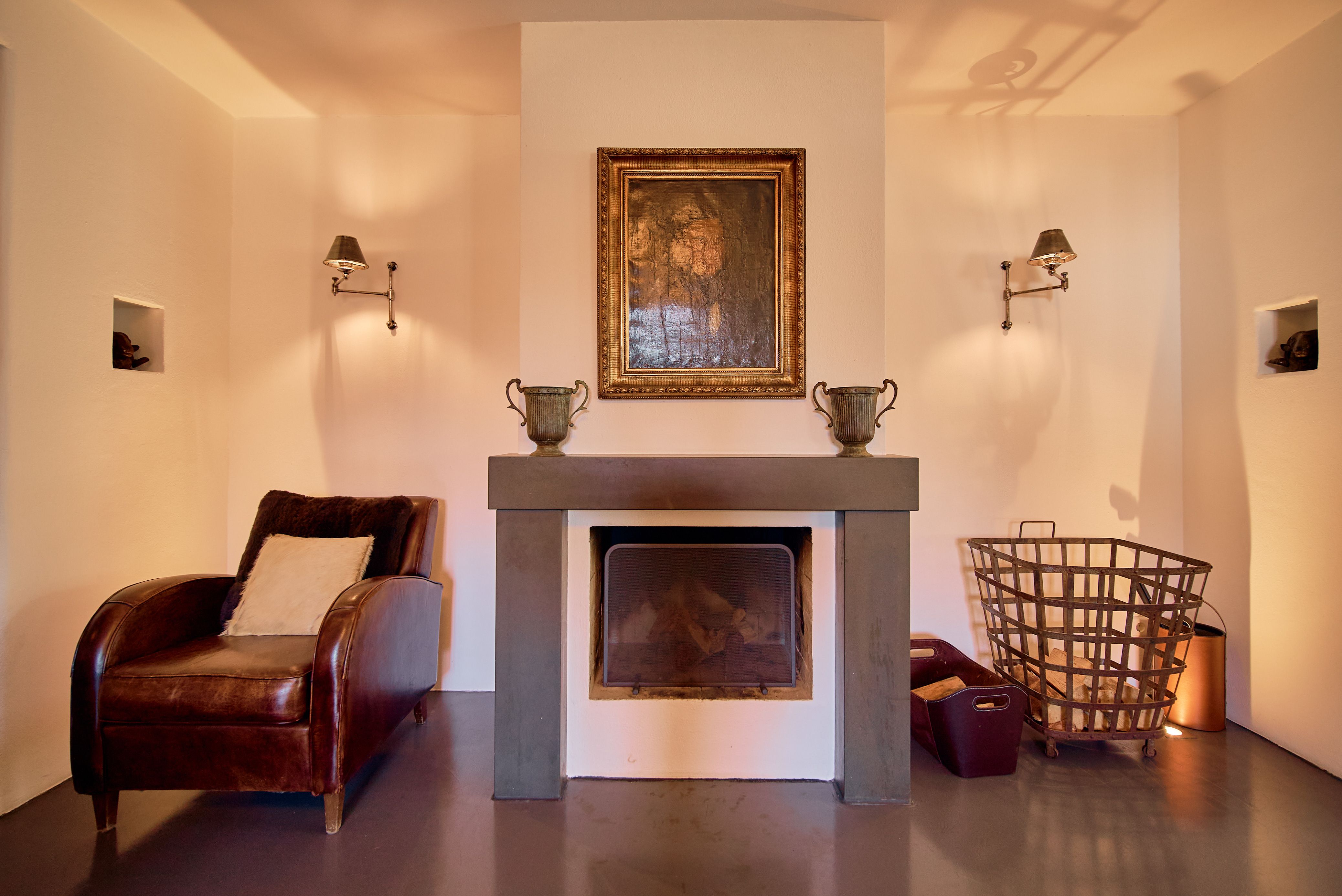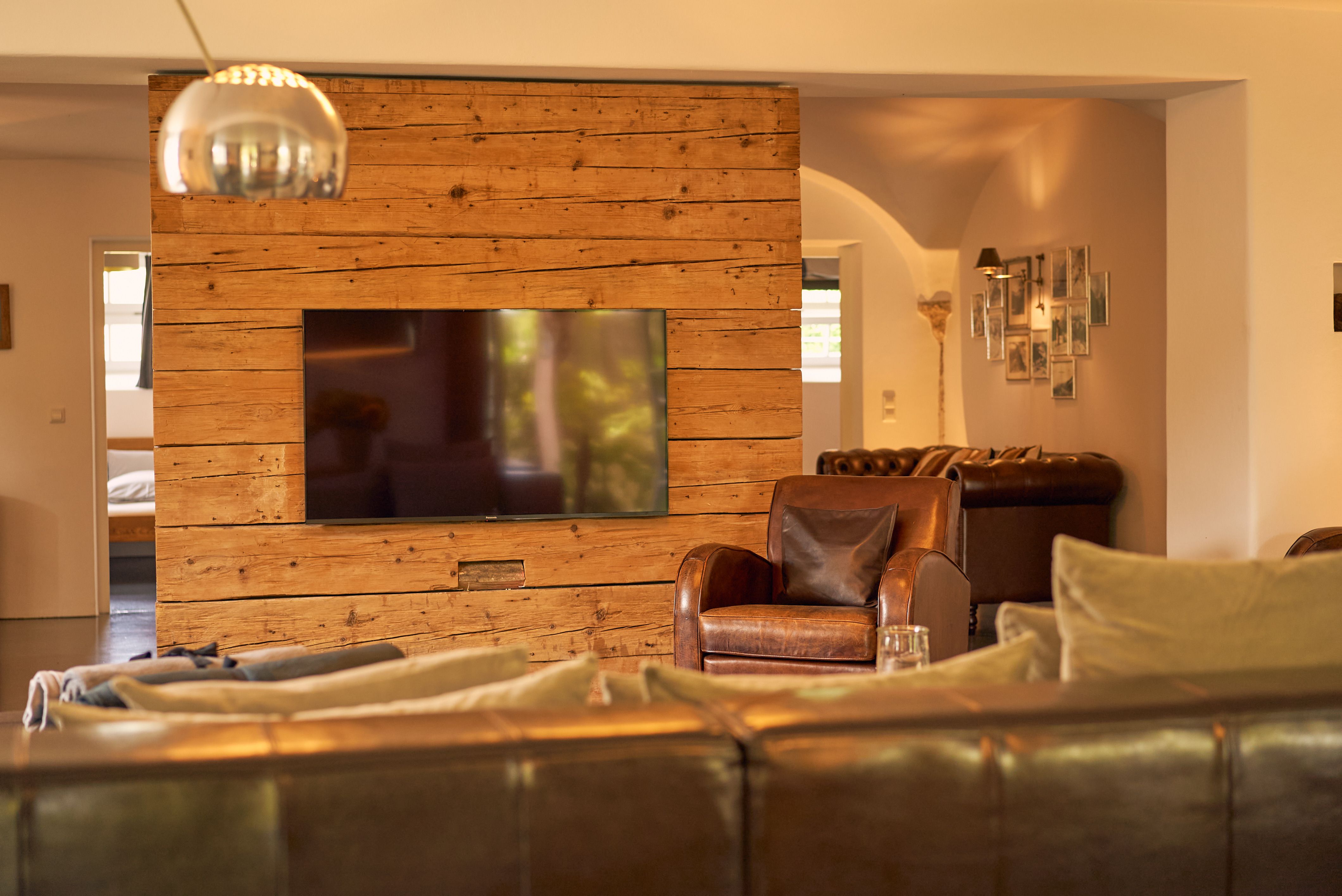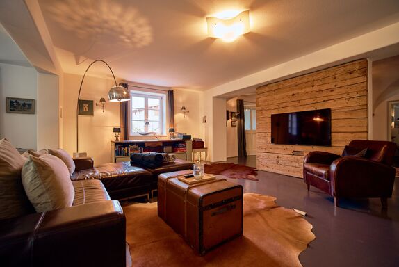 1 großer Wohnbereich: Sofa, Sessel, offener Kamin und TV