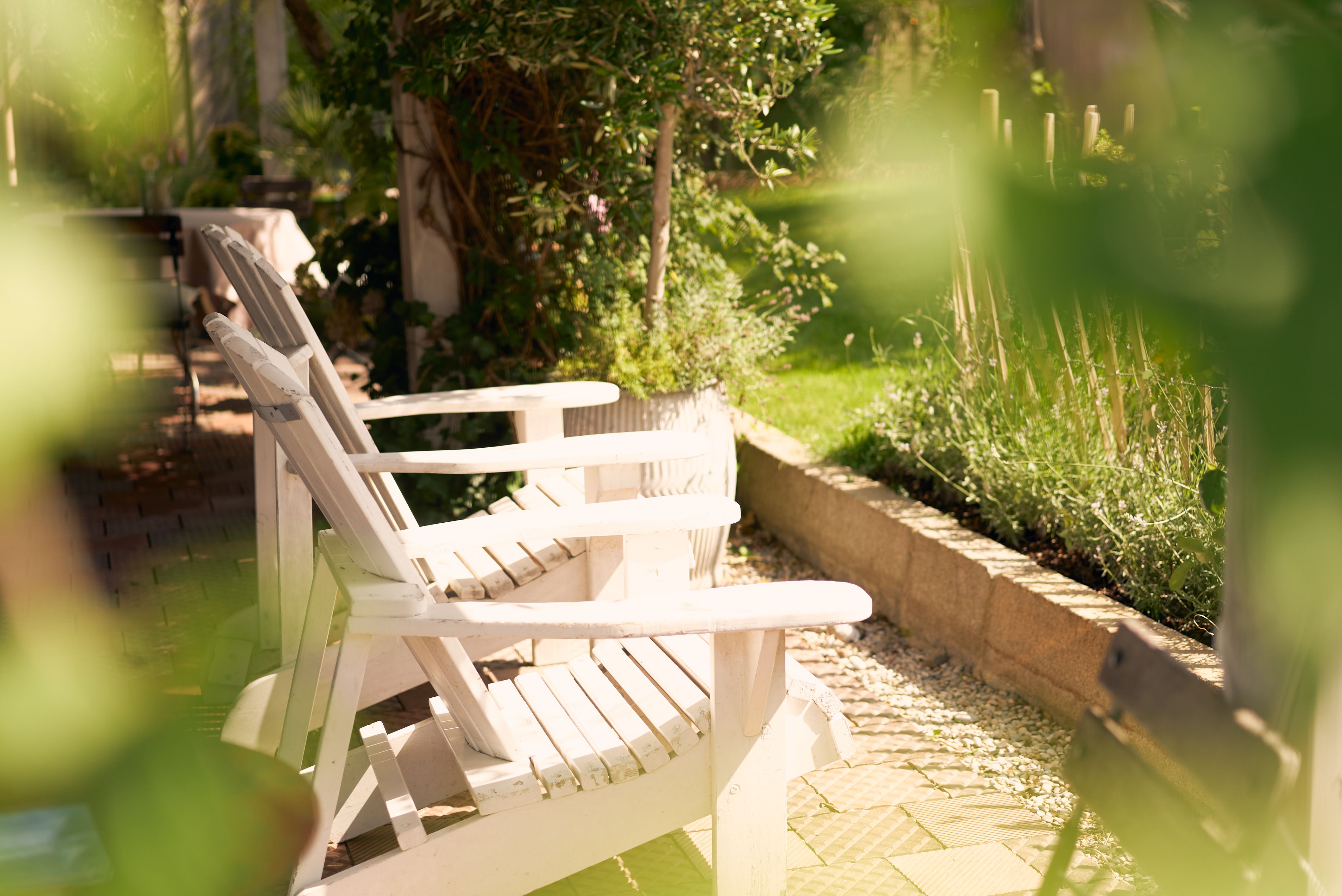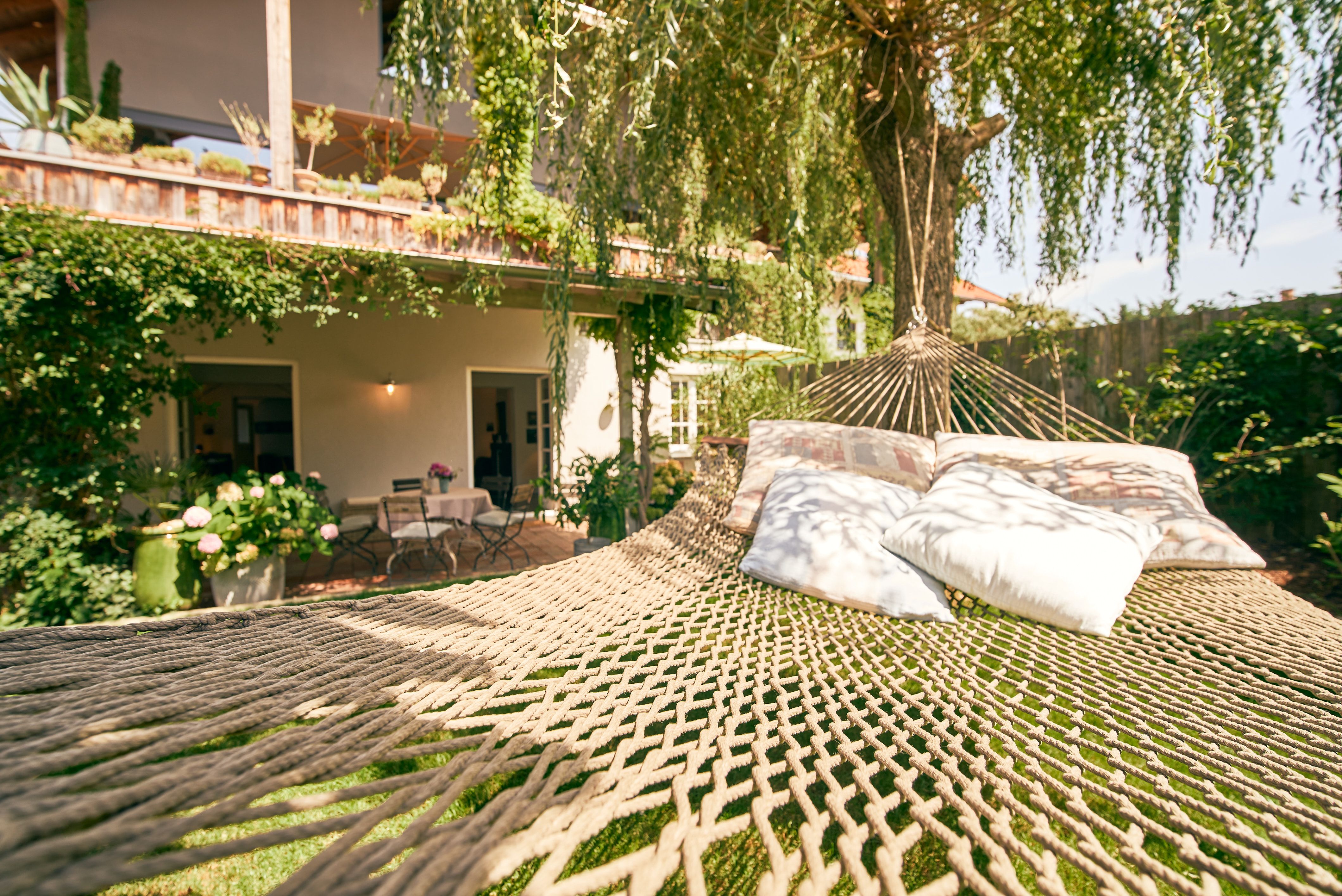 30qm Terrasse mit Garten, Hängematte, Liegestühlen