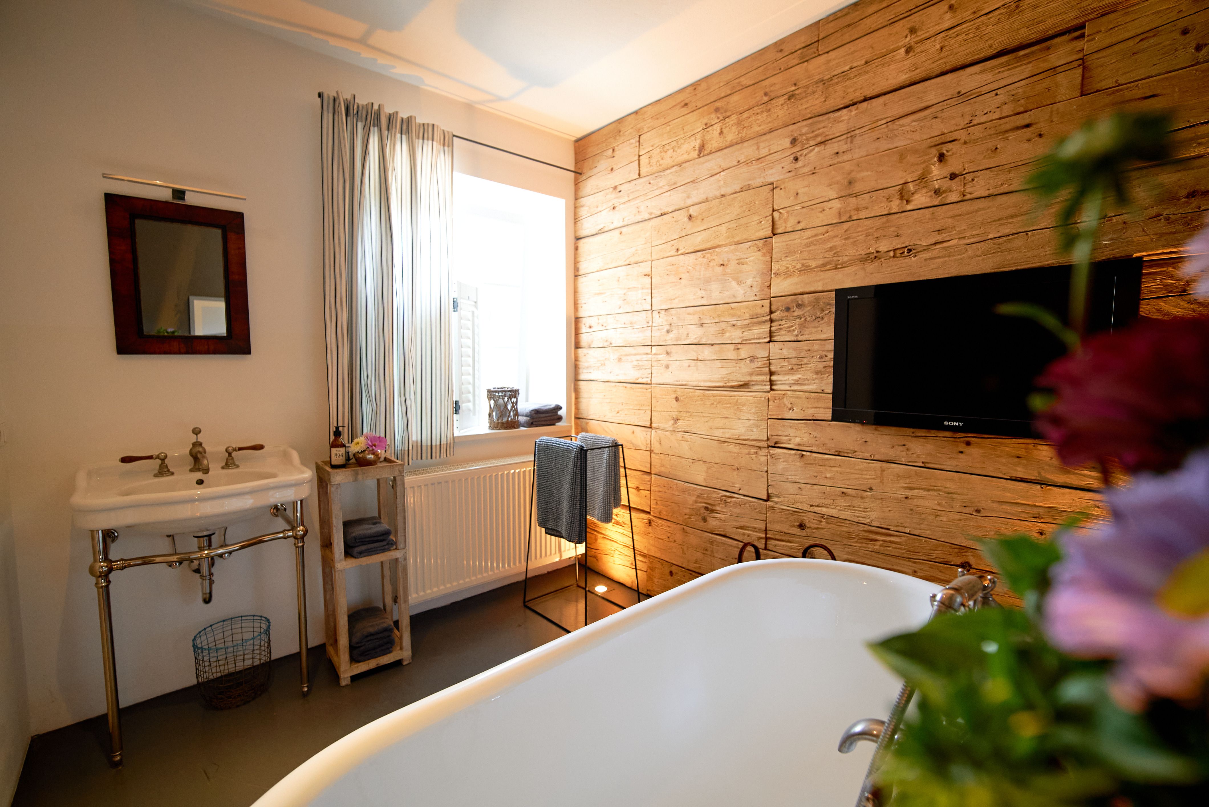 2 Badezimmer mit Dusche, Toilette, Waschbecken und eine Waschmaschine, Regenwasserdusche, freistehende Badewanne , TV