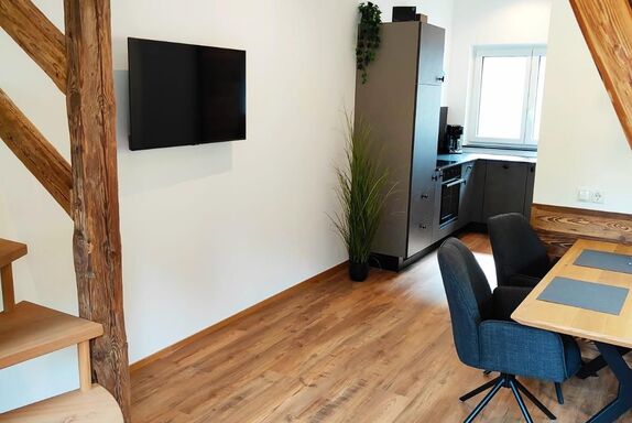 Auf der Ebene 1 befindet sich der rustikal moderne und komplett eingerichtete Wohnraum mit Küche,sowie unser tolles Badezimmer mit XXL Dusche.