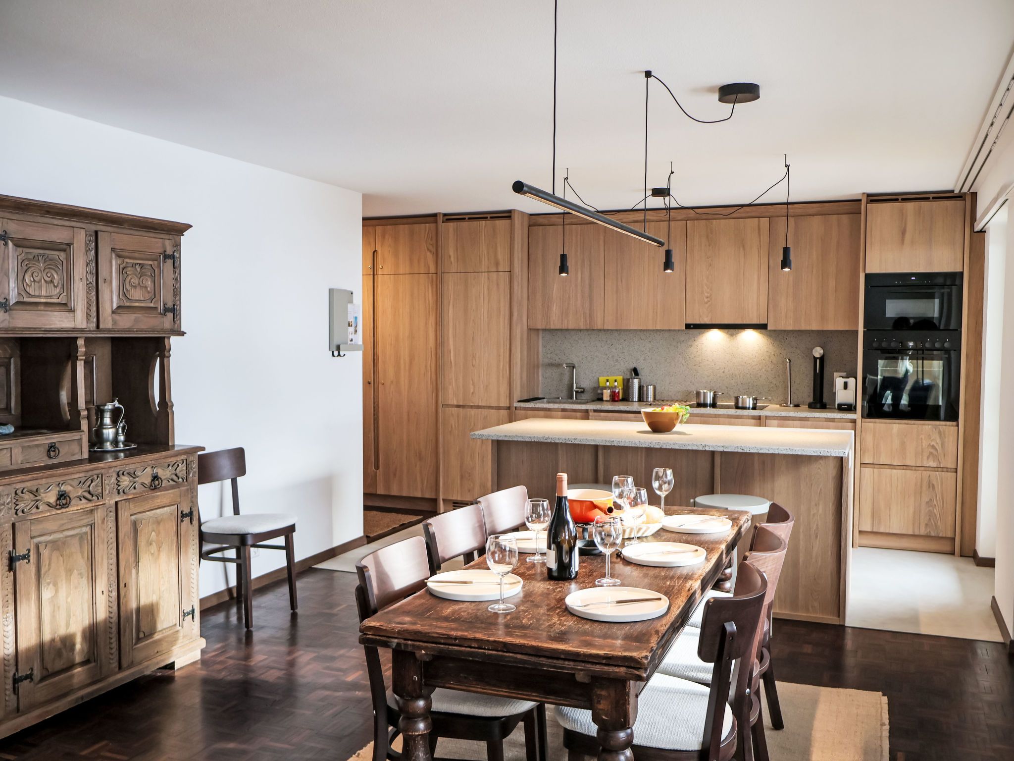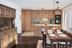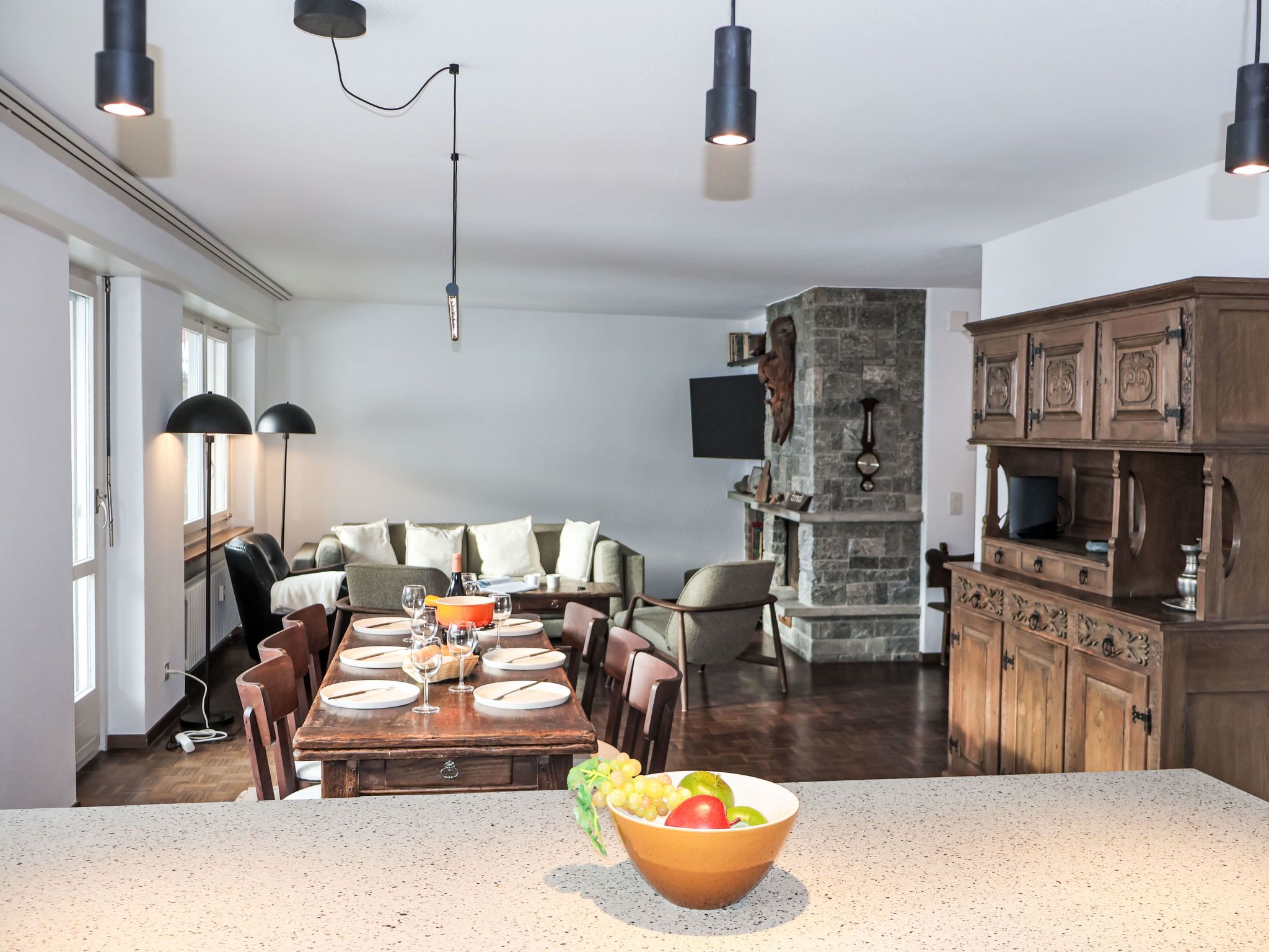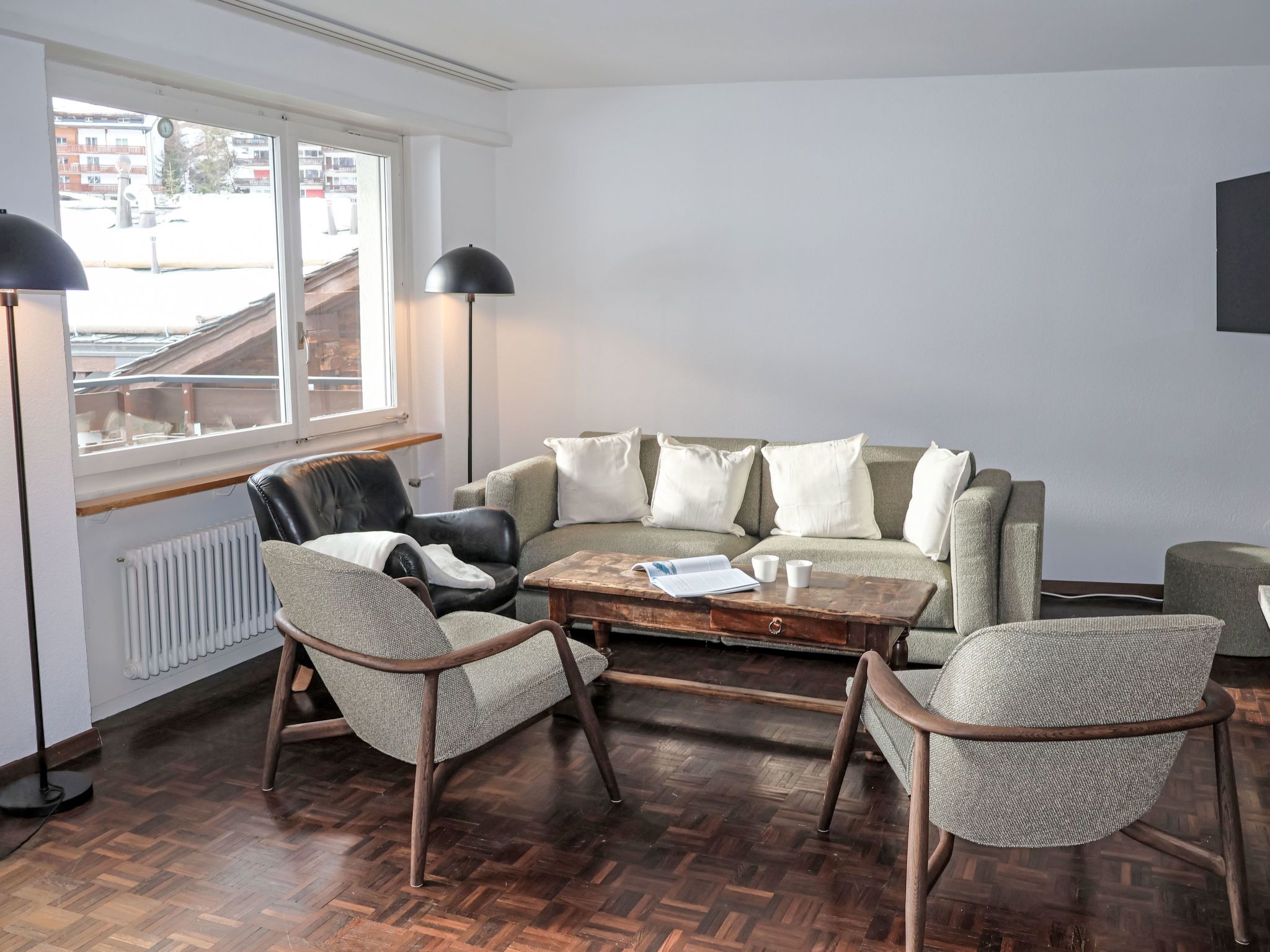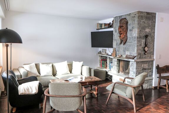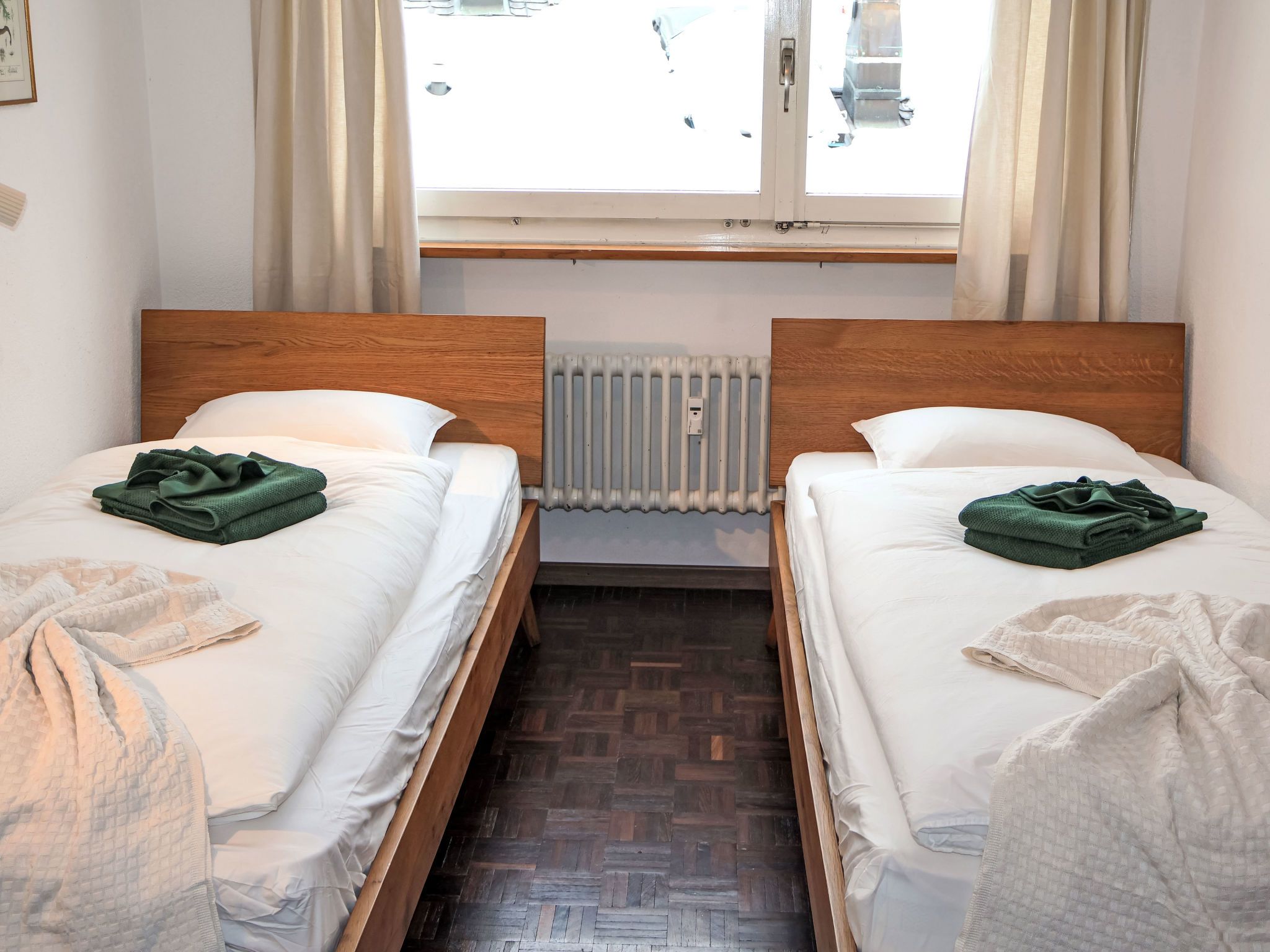4-Zimmer-Wohnung 120 m2 im 4. Stock. Einfach und komfortabel eingerichtet: Wohn-/Esszimmer mit offenem Kamin (nur Deko), Esstisch, Kabel-TV und Radio. Ausgang zum Balkon. 1 Zimmer mit 2 Betten (90 cm, Länge 200 cm). 1 Zimmer mit 2 Betten (90 cm, Länge 200 cm). 1 Doppelzimmer mit 1 franz. Bett (1 x 160 cm, Länge 200 cm). Kleine Küche (4 Kochplatten, Backofen, Geschirrspüler, Toaster, Wasserkocher, Tiefkühler, elektrische Kaffeemaschine, Racletteofen, Fondue Set (Chinoise, Käse)). Ausgang zum Balkon. Bad/WC, Dusche/WC, sep. WC. Balkon. Balkonmöbel. Schöne Sicht auf das Matterhorn. Zur Verfügung: Haartrockner. Internet (Wireless LAN, gratis). Bitte beachten: Nichtraucher-Unterkunft.