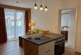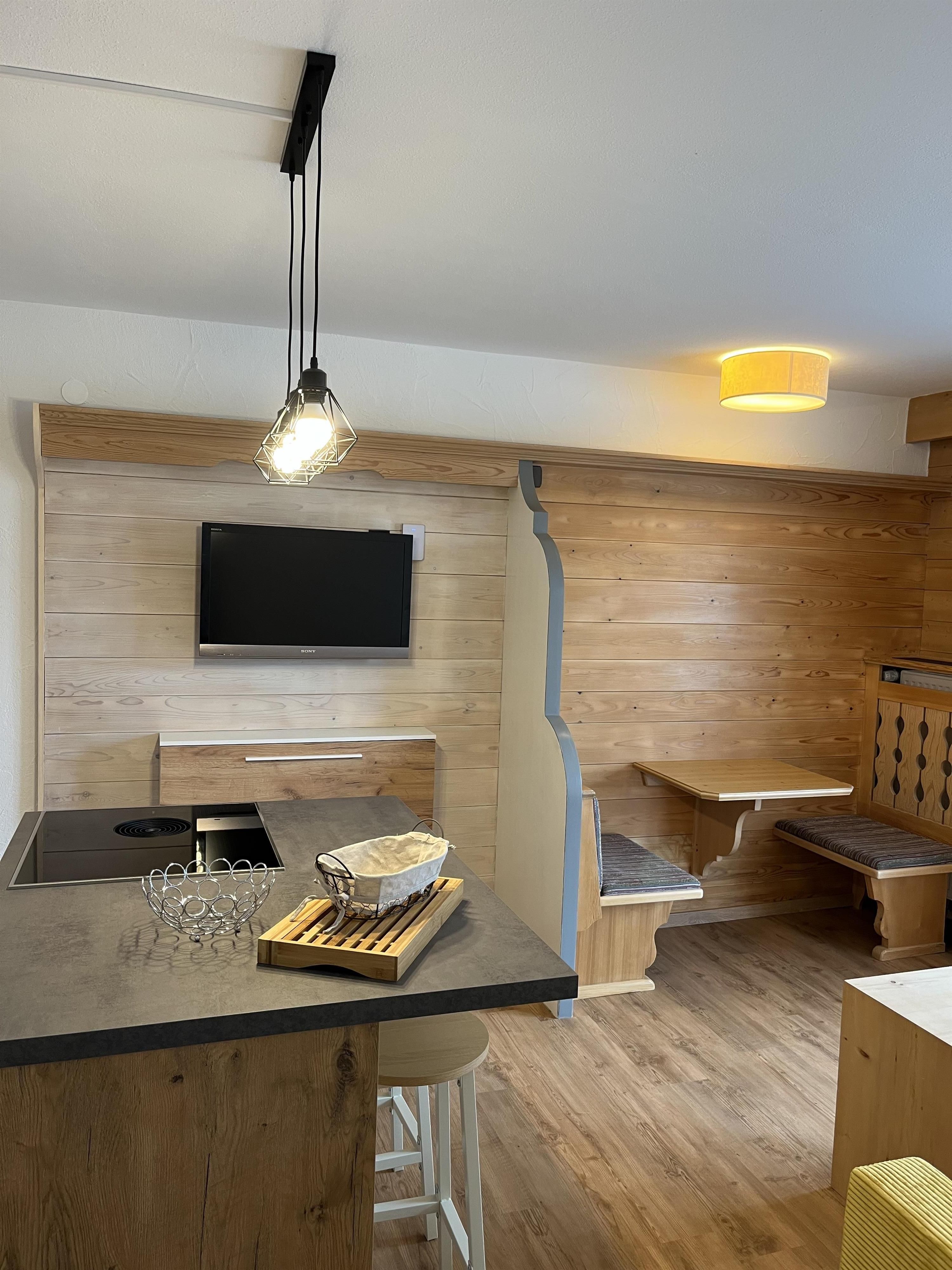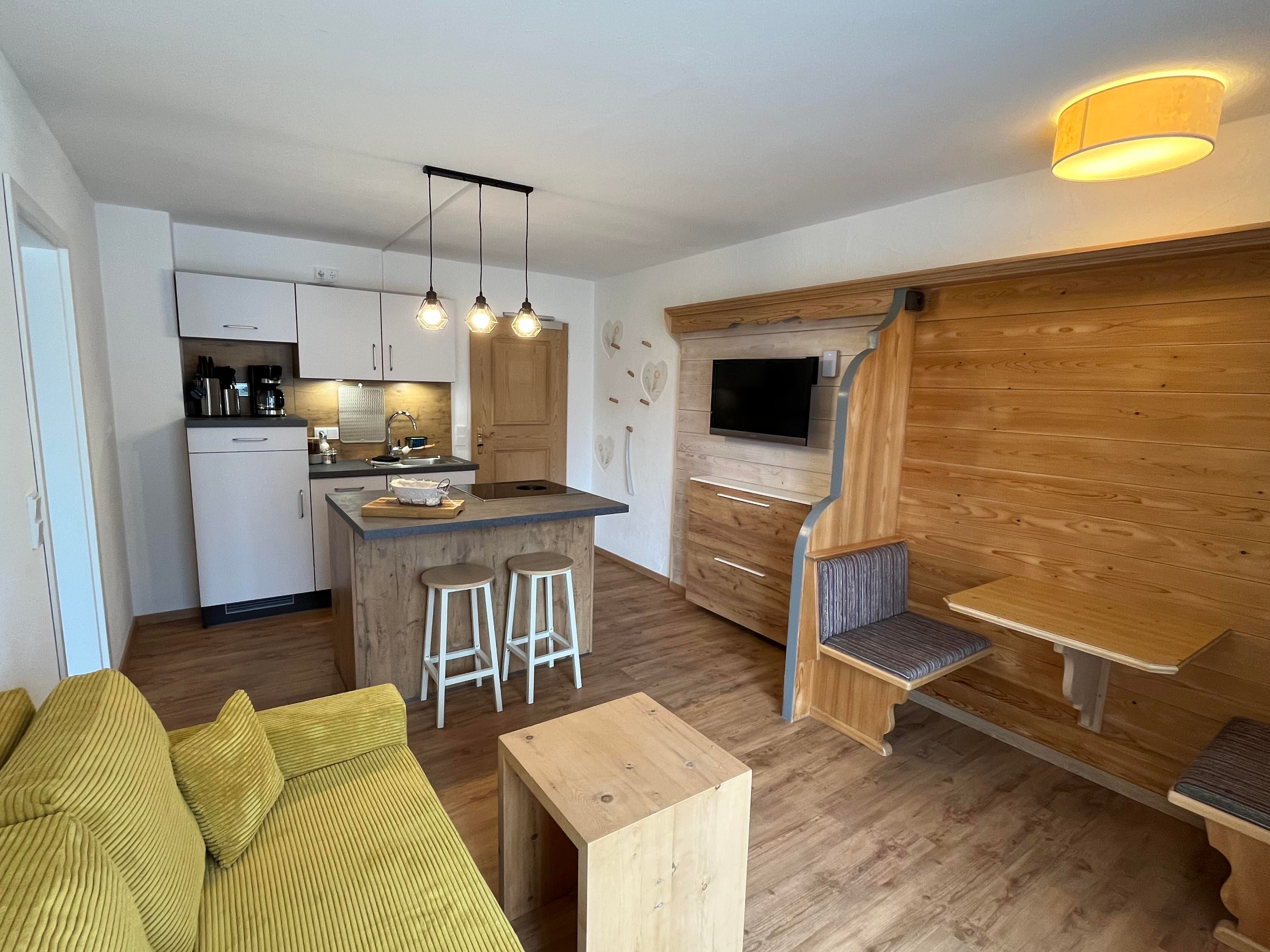 Die Ferienwohnung mit Wohnküche ist um die 40m² gross und besitzt eine neue, voll ausgestattete Küche (teilweise mit Kochinsel und Bora-Induktionskochfeld) mit Kühlschrank, Backofen, Herd und Geschirrspüler. Der Wohn-Essbereich, in welchem sich die elegante Wohnküche befindet, ist mit einem Esstisch und einem bequemen Schlafsofa mit Salontisch eingerichtet. Im ganzen Appartement haben Sie WLAN-Empfang.