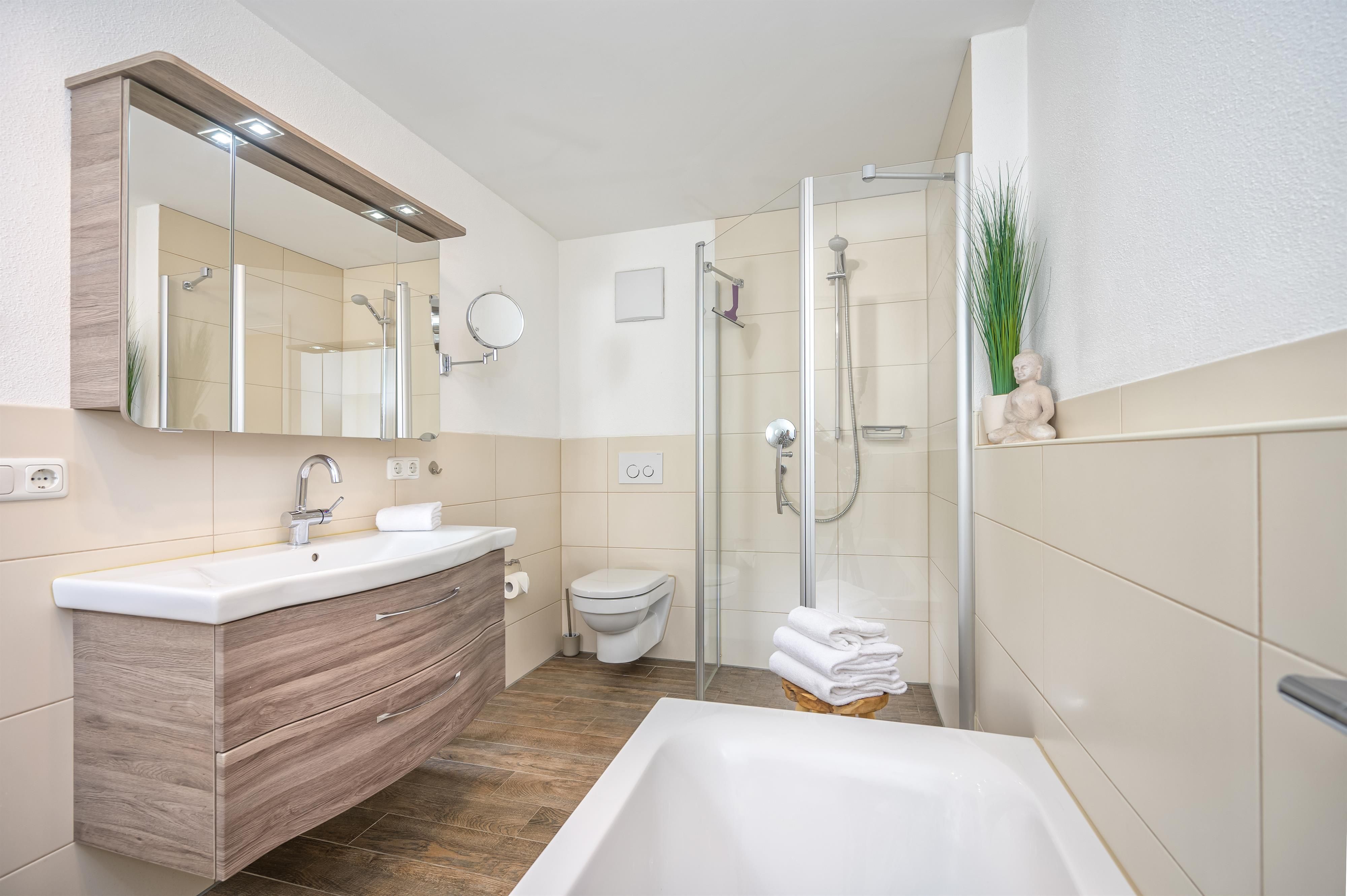 • mit Bad, Dusche, Badewanne, großer Spiegelschrank, Waschbecken mit Untertisch, Handtuchheizkörper
