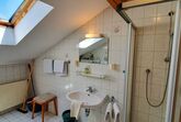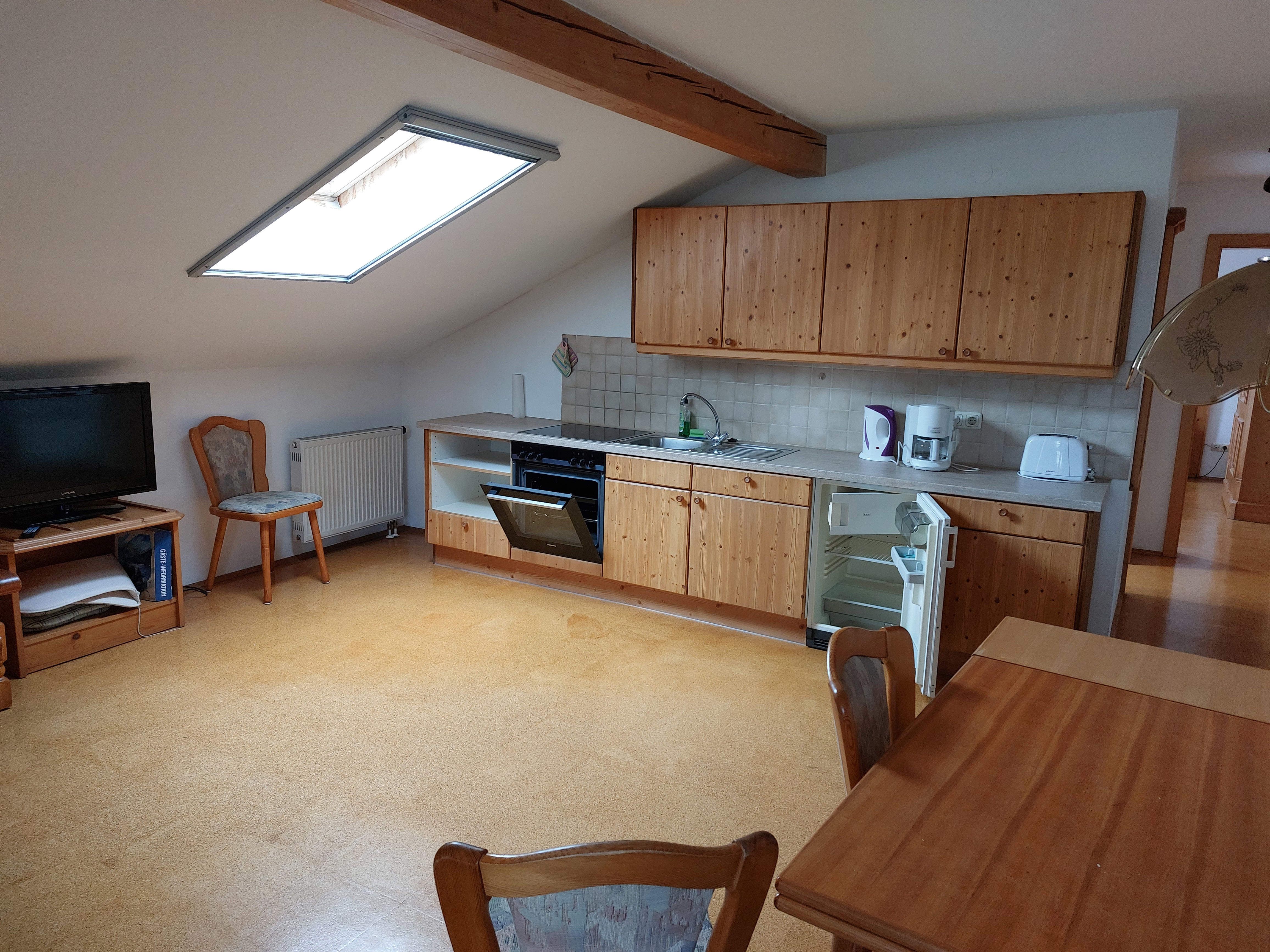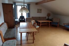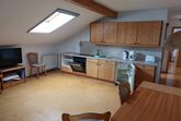 Ferienwohnung im Dachgeschoß mit Ostbalkon, Wohnschlafraum mit Schlafcouch für 2 Personen, 1 separates Schlafzimmer für 3 Personen. Kochnische mit Küchenzeile und Mikrowelle. Sat-TV und Telefon. Dusche/WC.