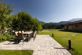 Der sonnige Garten mit großzügigem Sitzplatz und einem Sonnendeck laden zum Verweilen, Essen und Spielen. Zum Süden geht der Garten nahtlos in saftige Wiesen über. Vom Steg des Sonnendecks schauen Sie auf das beeindruckende Gebirge des Wilden und des Zahmen Kaiser.