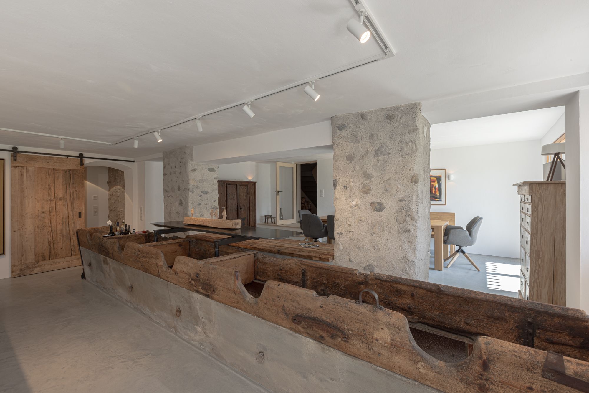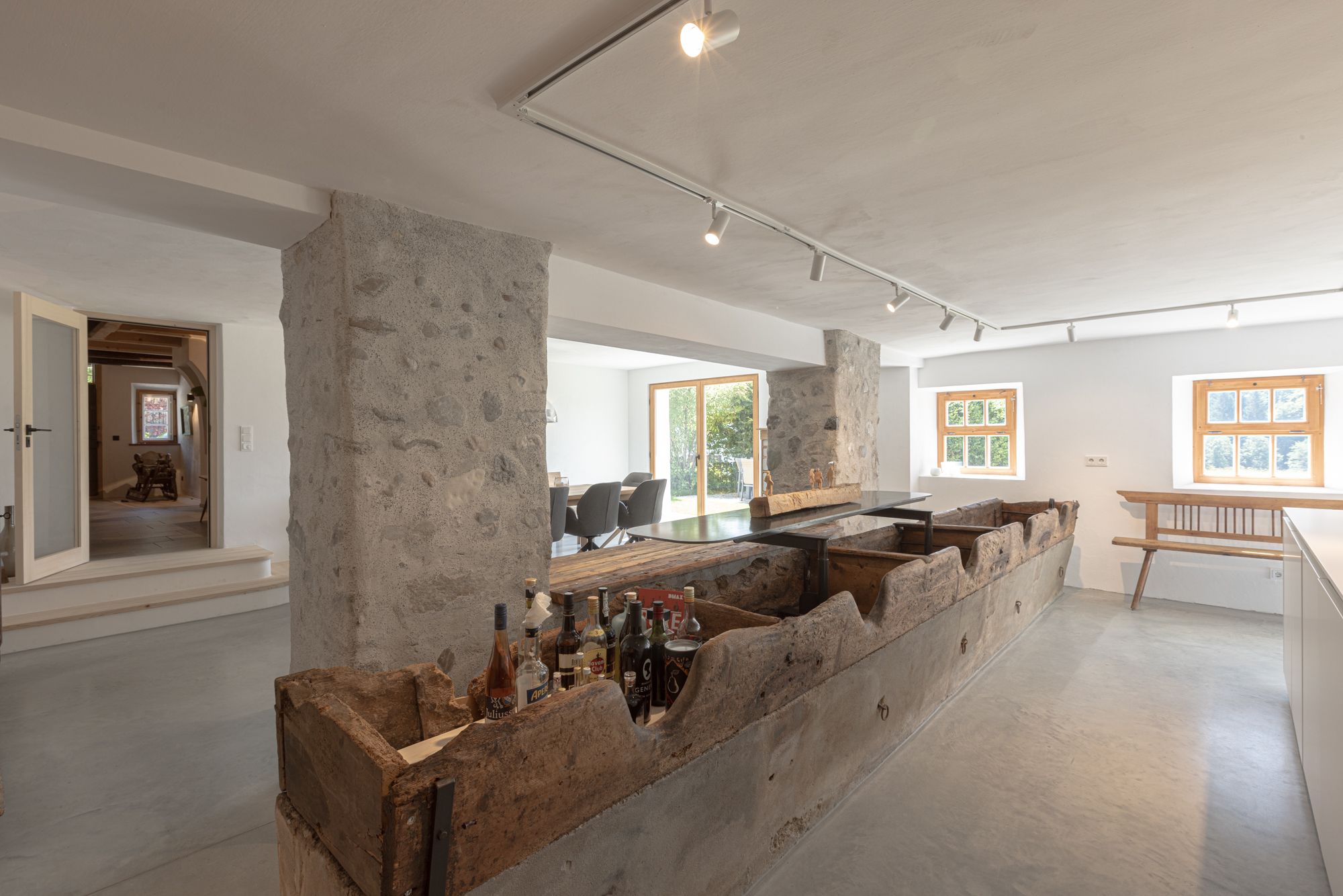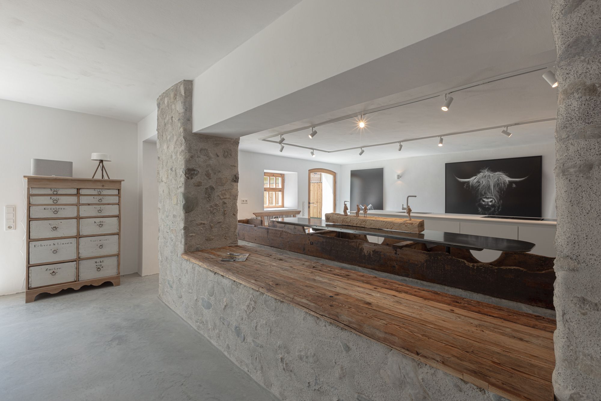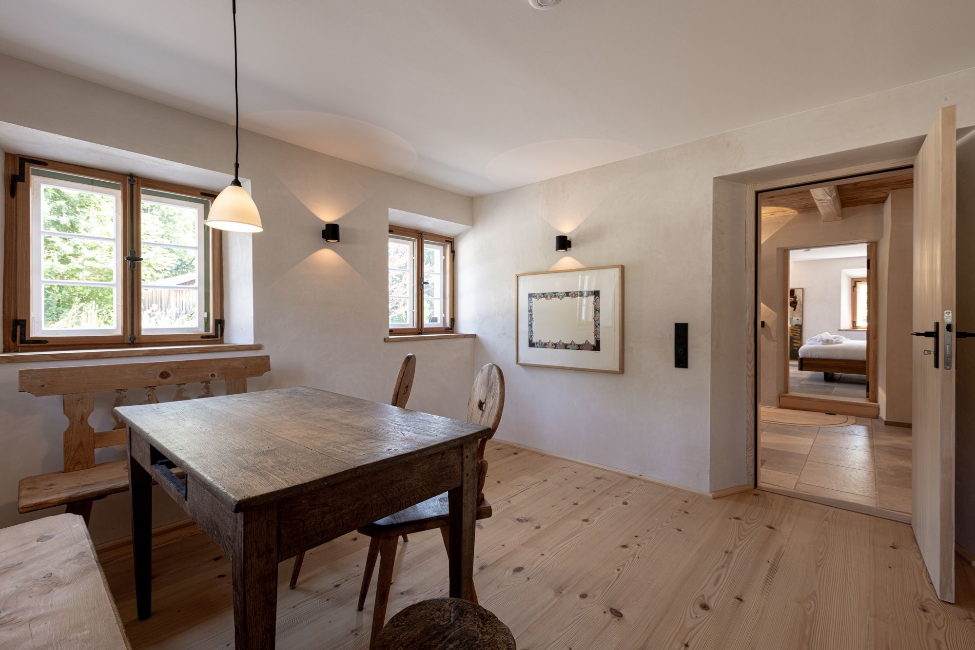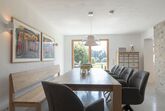 Der ehemalge Wirtschaftsteil ist heute mit dem großzügigen Küchen- und Essbereich das Zentrum der Wohnung. Als Rückzugsort gibt es daneben noch die Bauernstube. Ab Ende November 2025 wird noch eine Sauna für 6 Personen zur Verfügung stehen.