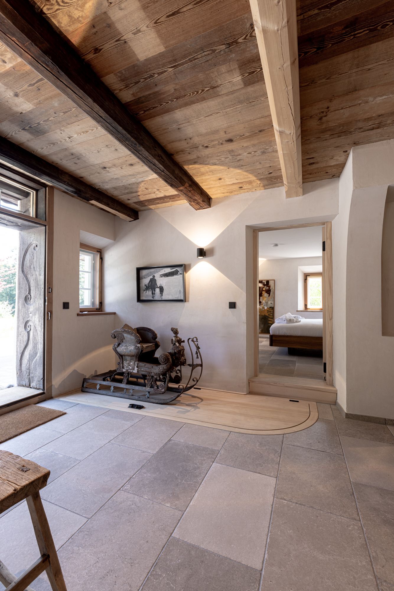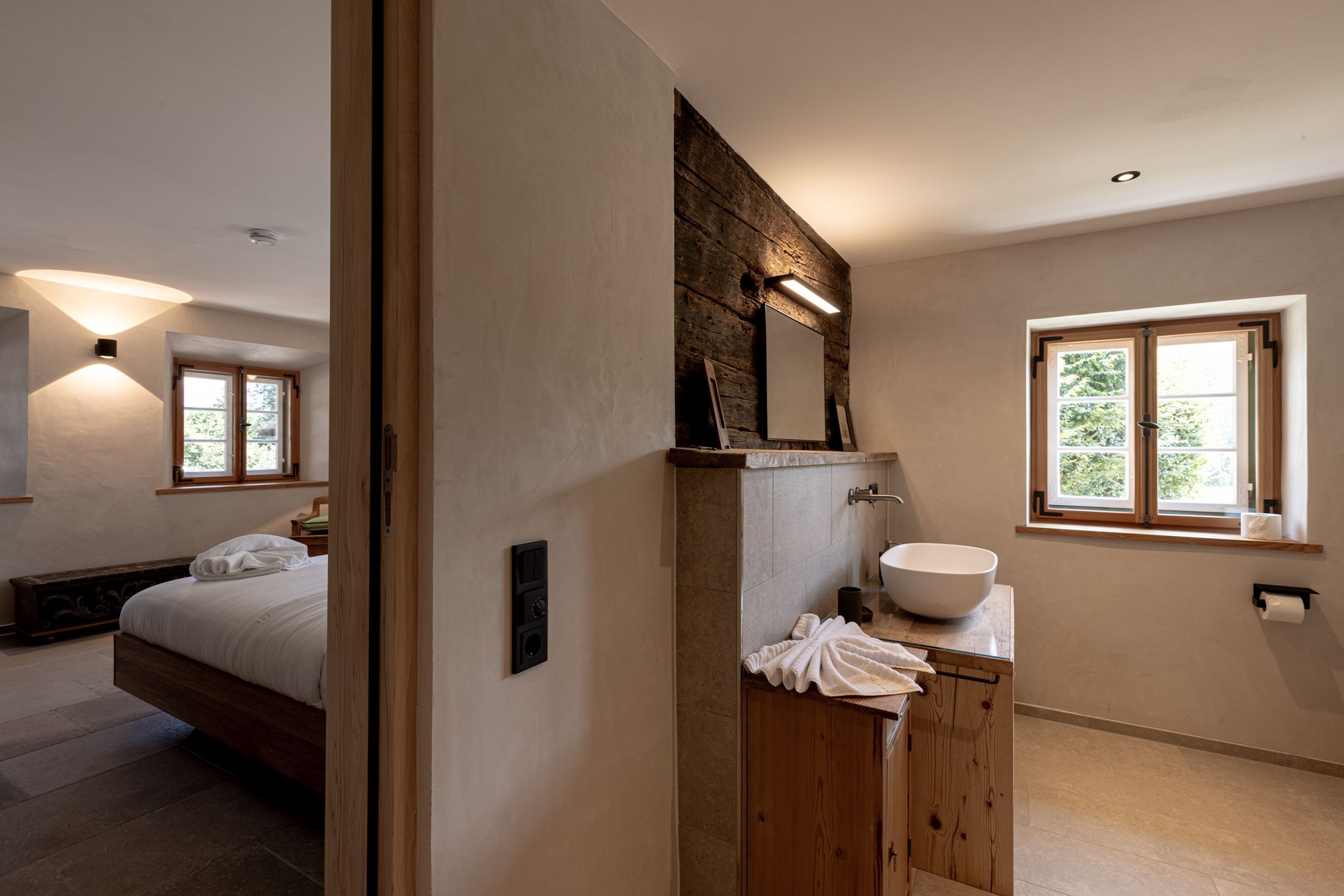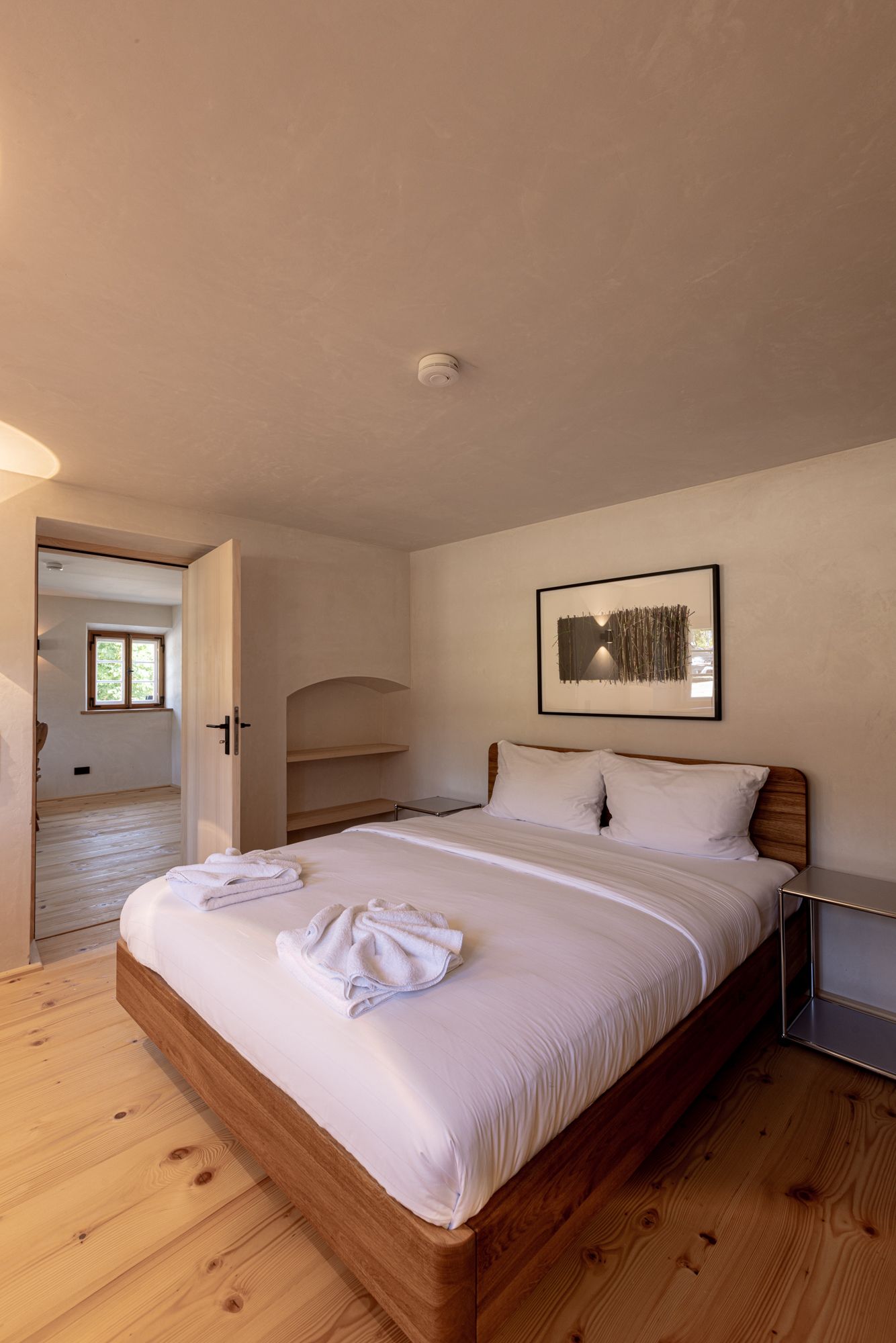 Die Einrichtung der Schlafimmer ist ein Mix aus alten Bauernschränken und modernen Möbeln. Dieser Mix setzt sich bei der Kunst aus verschiedenen Jahrhunderten fort.