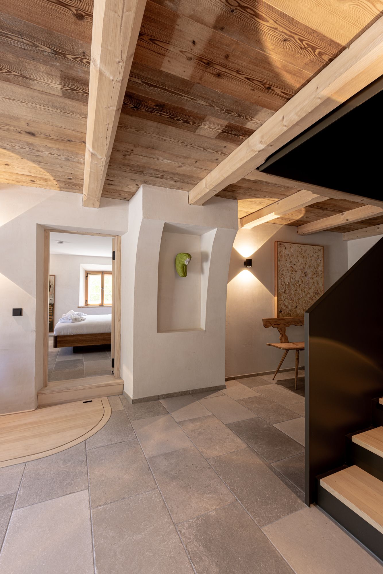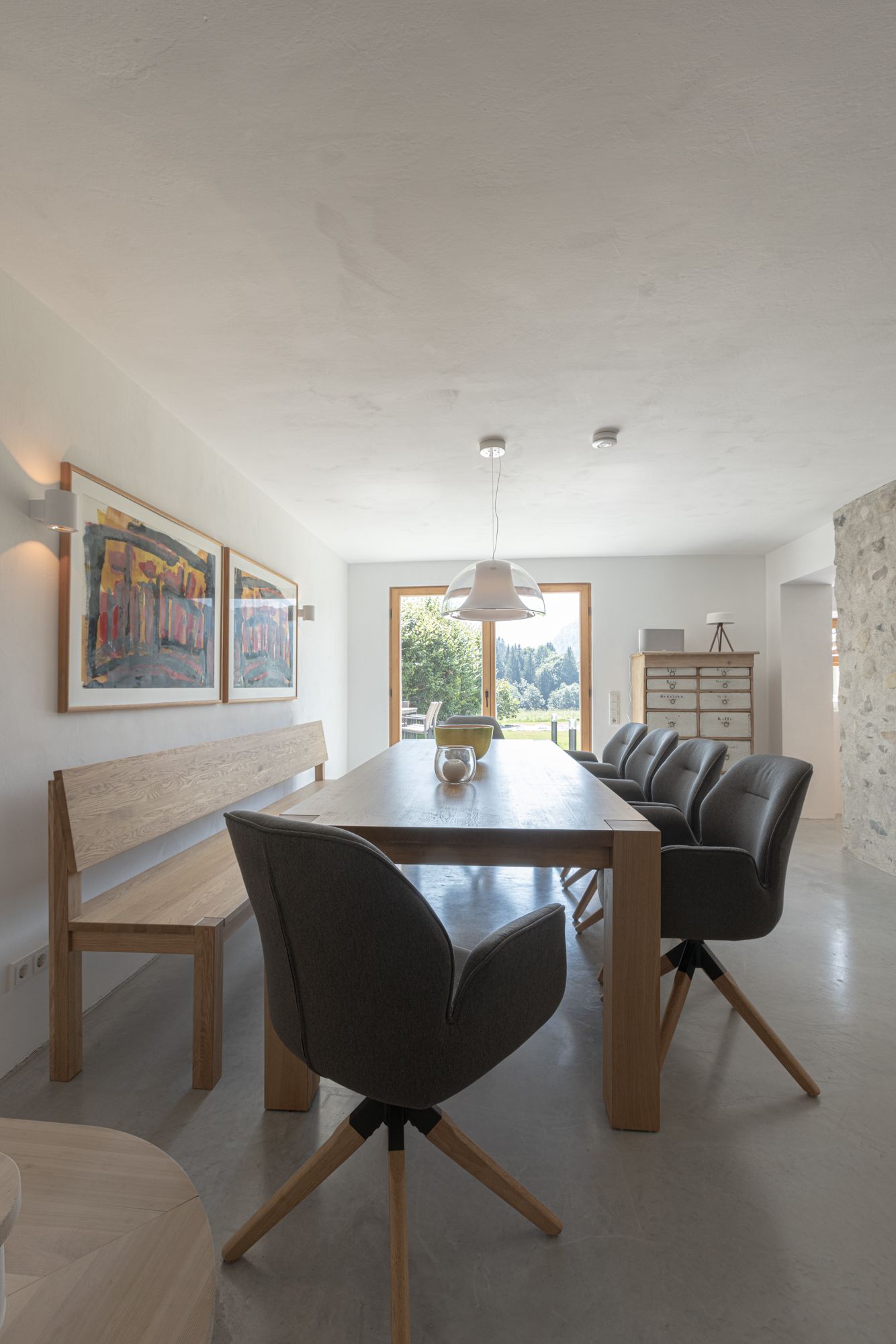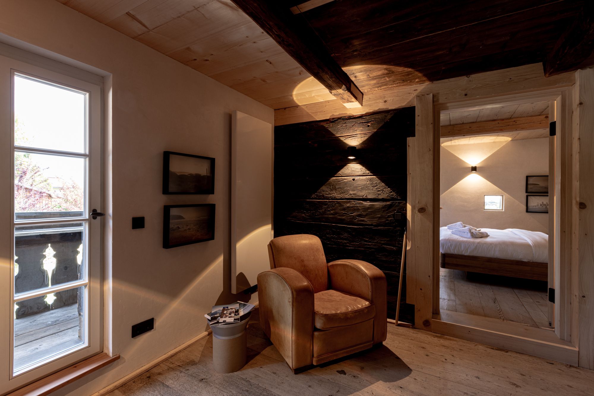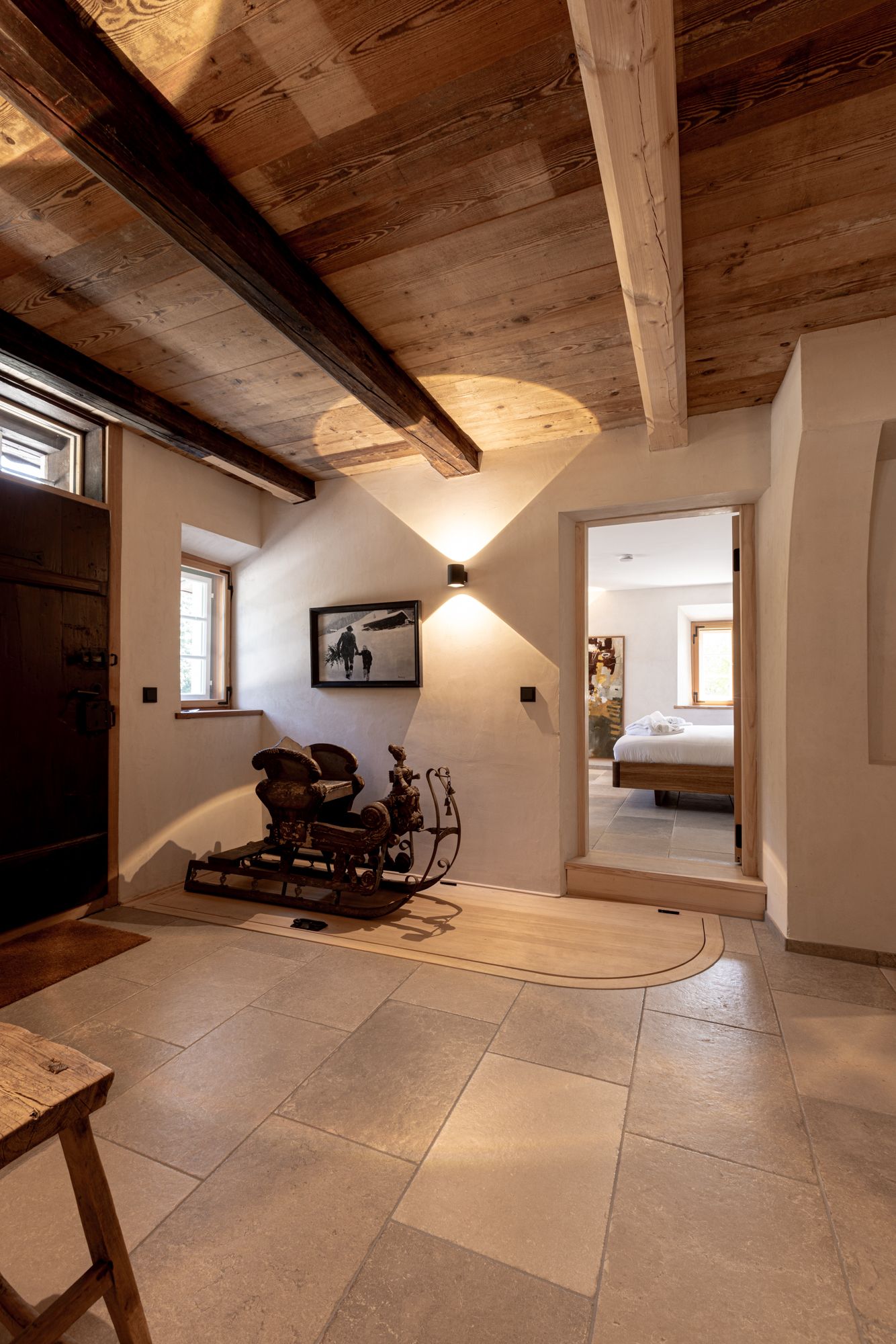 Die Einrichtung der Schlafimmer ist ein Mix aus alten Bauernschränken und modernen Möbeln. Dieser Mix setzt sich bei der Kunst aus verschiedenen Jahrhunderten fort.
