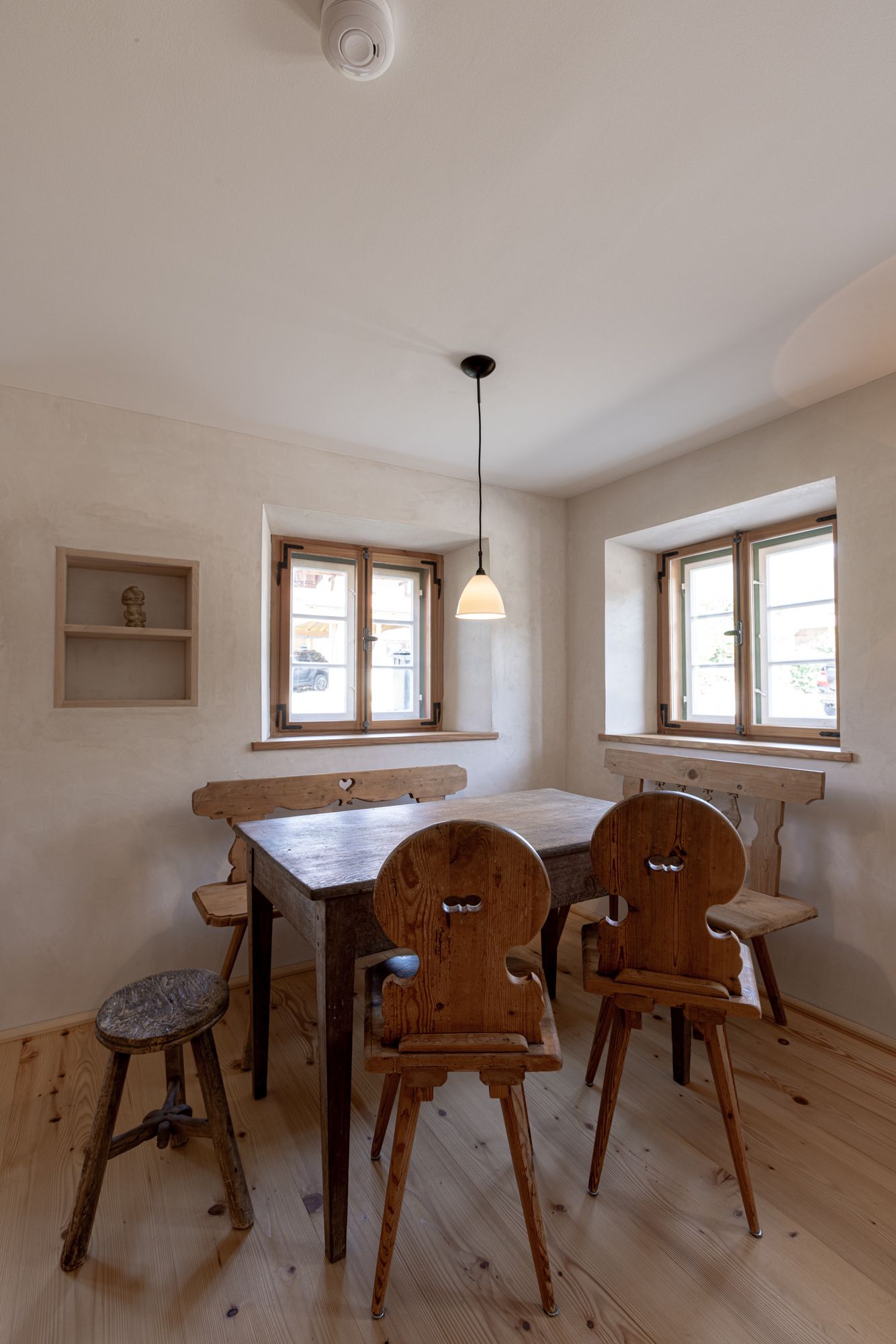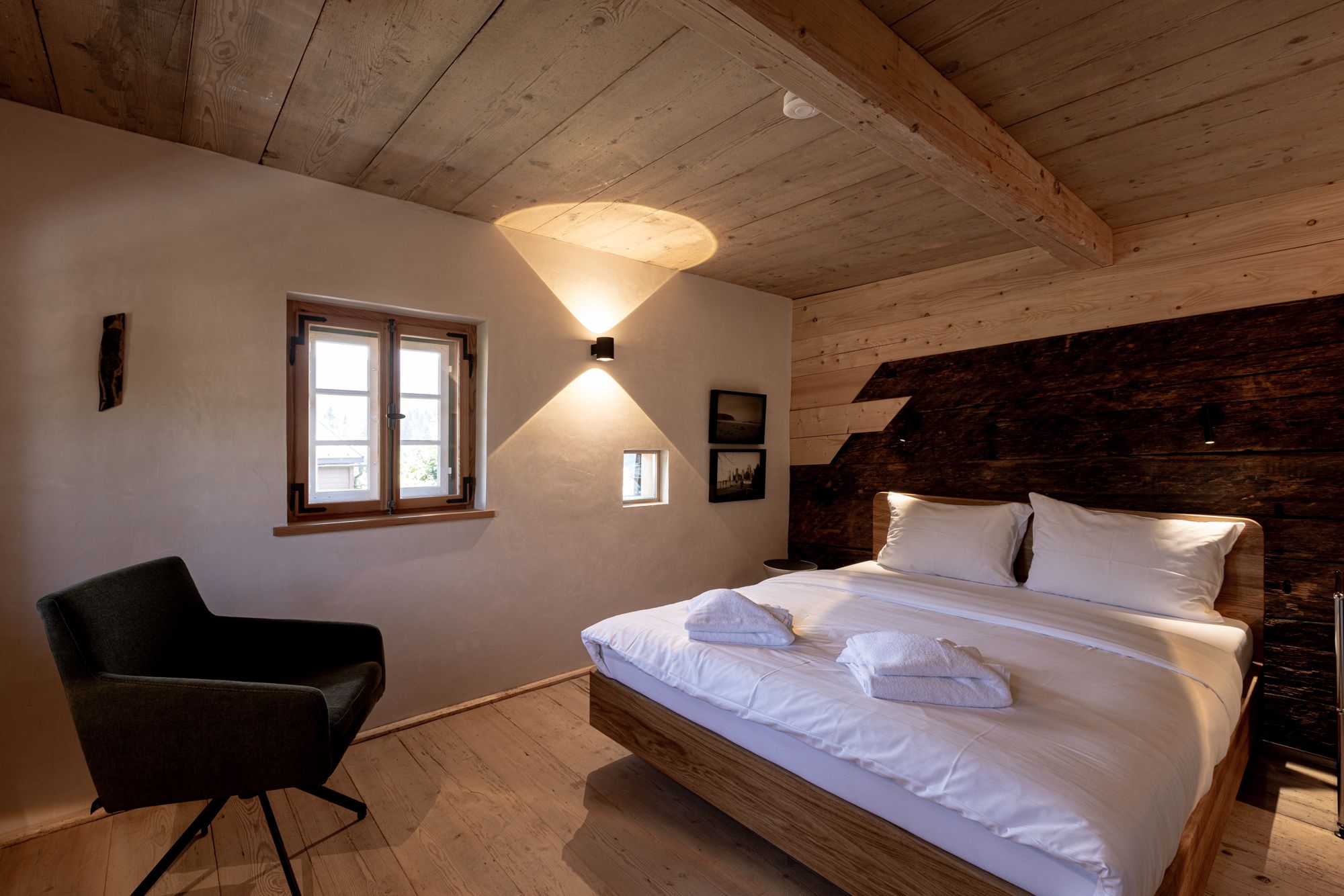 Bei der sorgfältigen und umfassenden Sanierung des Moarhauses ging es den Eigentümern vor allem darum, die ursprüngliche Substanz des Hauses, die erhalten werden konnte, sichtbar zu machen und den ursprünglichen Grundriss des Moarhauses zu erhalten. Es war aber auch der Anspruch, den Gästen einen hohen Komfort zu bieten durch Fussbodenheizung im Erdgeschoss, Isolierung der Holzblockwände von innen, insgesamt 5 Bäder, wobei drei Badezimmer von den Schlafzimmern begehbar sind. Bausünden der letzten 40 Jahre wurden beseitigt und der über Jahrzehnte versteckte Holzblock bei innenliegenden Wänden zum Teil freigelegt. Die alten Holzdielen im ersten Stock wurden freigelegt und behutsam restauriert. Notwendige Aussbesserungsarbeiten im Holzblock sind bewusst sichtbar erfolgt, indem neues Holz den jahrhunderte alten Holzblock ergänzt.