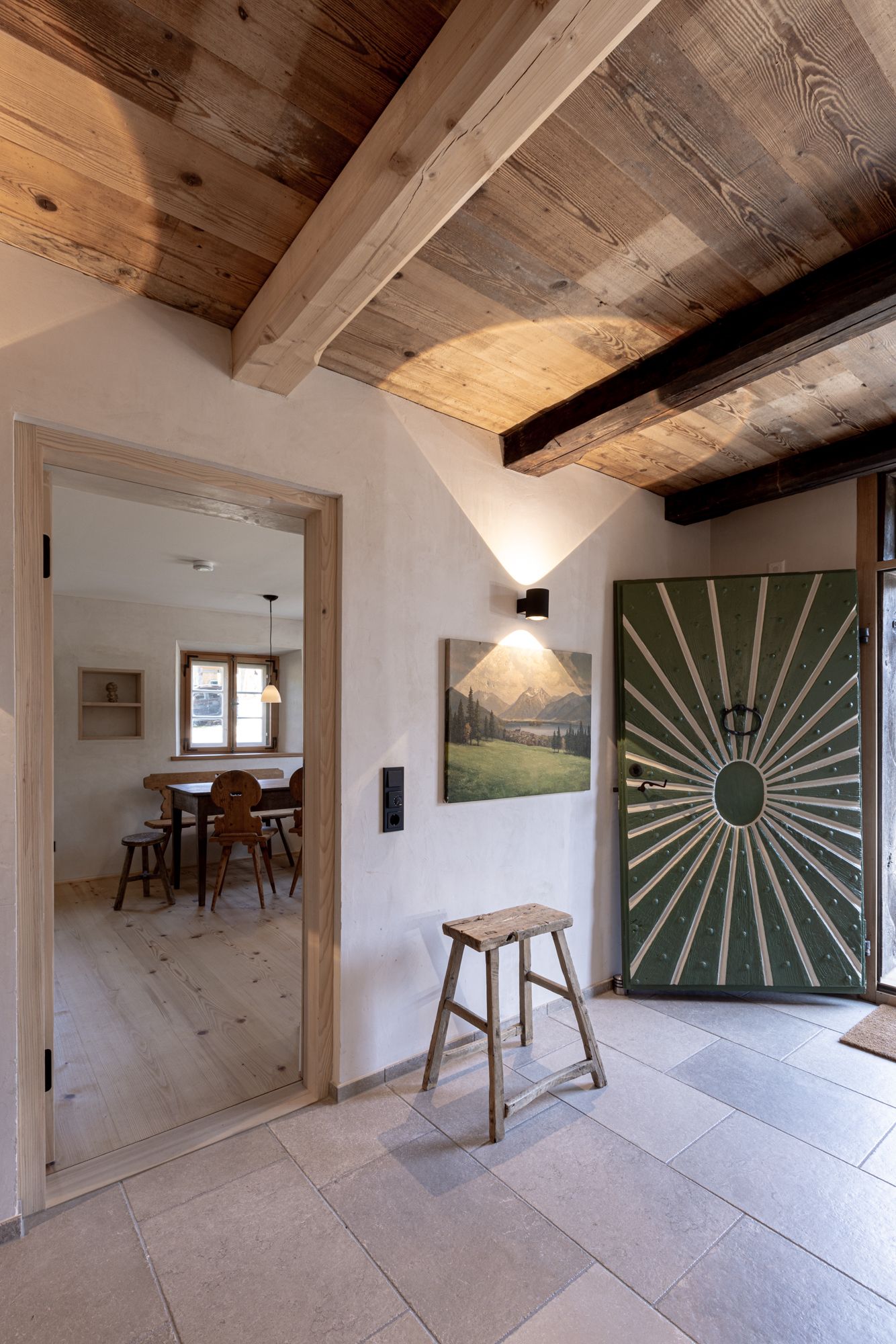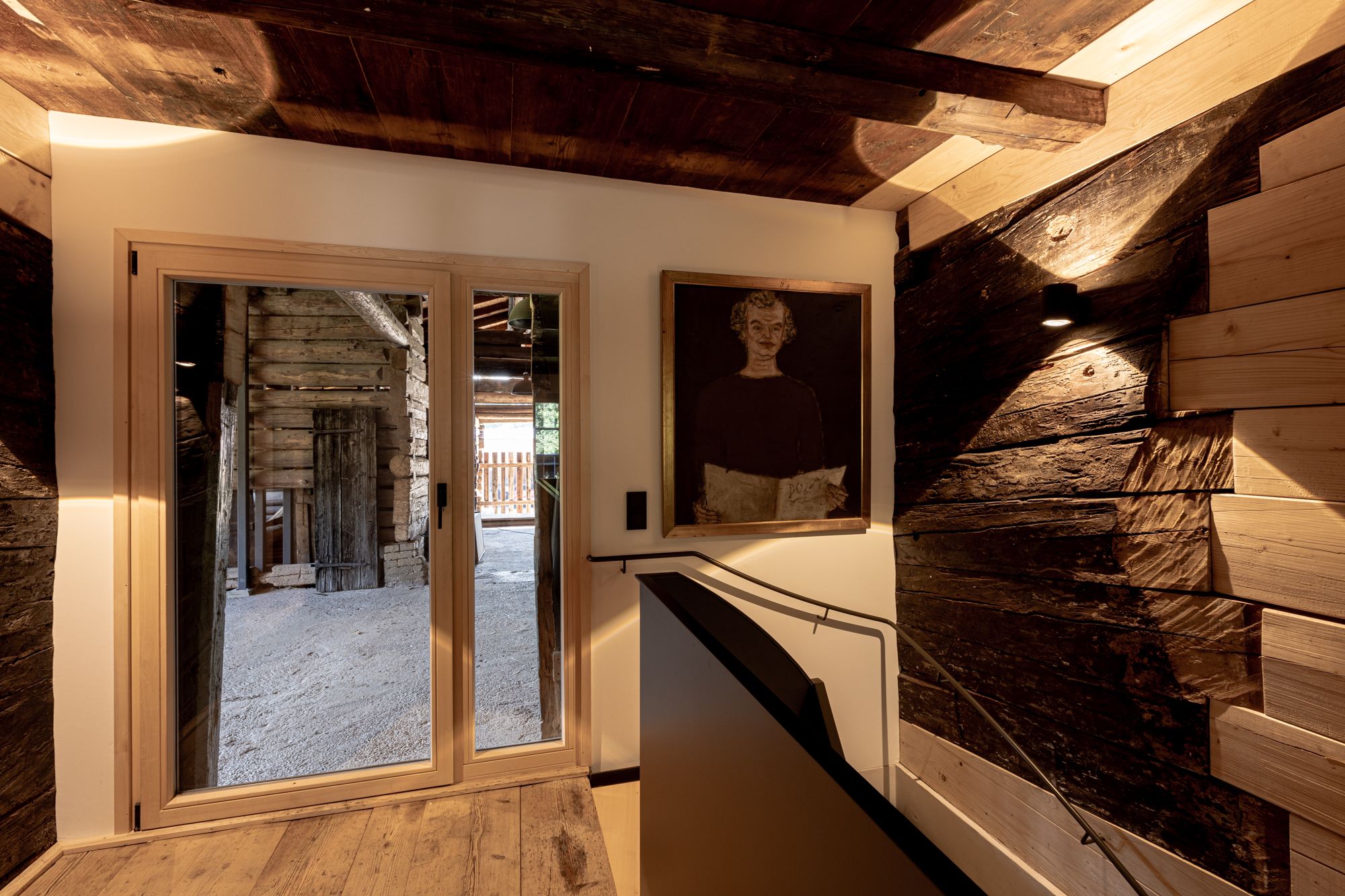 Eine Glastür erlaubt den Blick in die über Jahrhunderte kaum veränderte Holzblocktenne mit insgesamt 6 Kuben. Die bereits genehmigten Planungen erlauben den Ausbau zu einer weiteren Ferienwohnung. Das ist aber noch etwas Zukunftsmusik.